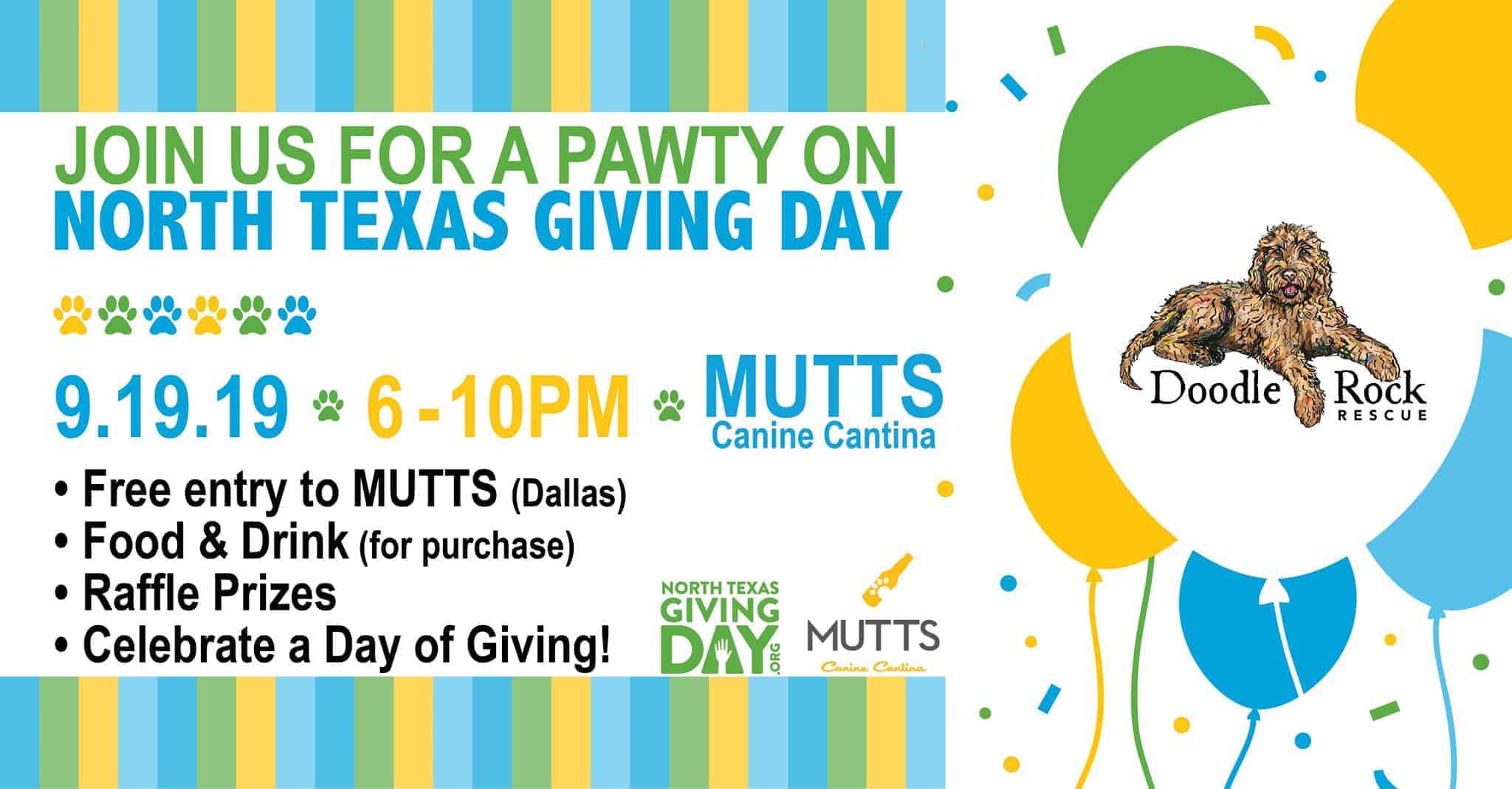 Let's Pawty for North Texas Giving Day! Join us at MUTTS Canine Cantina in Dallas to celebrate a fabulous day of giving with raffle prizes, food & drink (for purchase), and meet the Doodle Rock Team, Fosters, and Alumni! Dogs welcome and will receive FREE ENTRY if you mention Doodle Rock Rescue! North Texas Giving