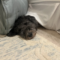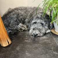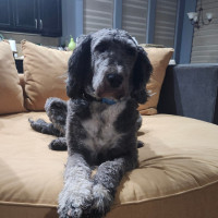 Hello there. My name is Abigail, and I’m a 4-year-old female Sheepadoodle with a gentle heart and a soft, fluffy coat. I weigh about 70 pounds, and I carry myself with calm, quiet grace. I’m not the type to bounce off the walls—I prefer cozy corners, slow mornings, and a peaceful routine.