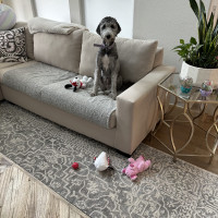 My days start around 6 a.m. with potty time and school drop-off, followed by a walk (my fave). I used to be scared of leashes, but now I sit pretty to get dressed. The rest of the day is filled with toy time, naps, shadowing my foster mom, and practicing tricks. I sleep in my crate at night (in the bedroom, please!) and eat two meals a day, though I like to graze.