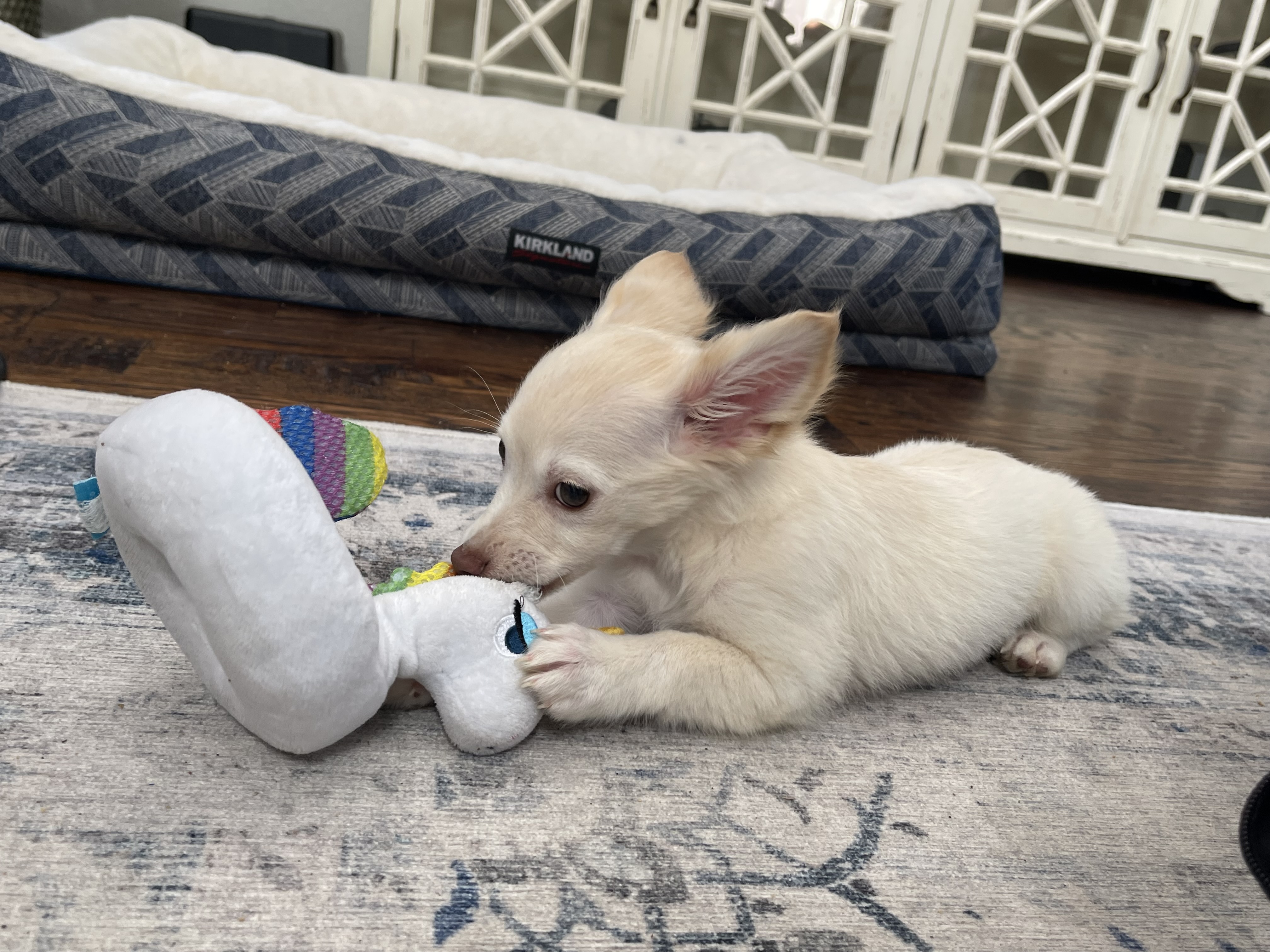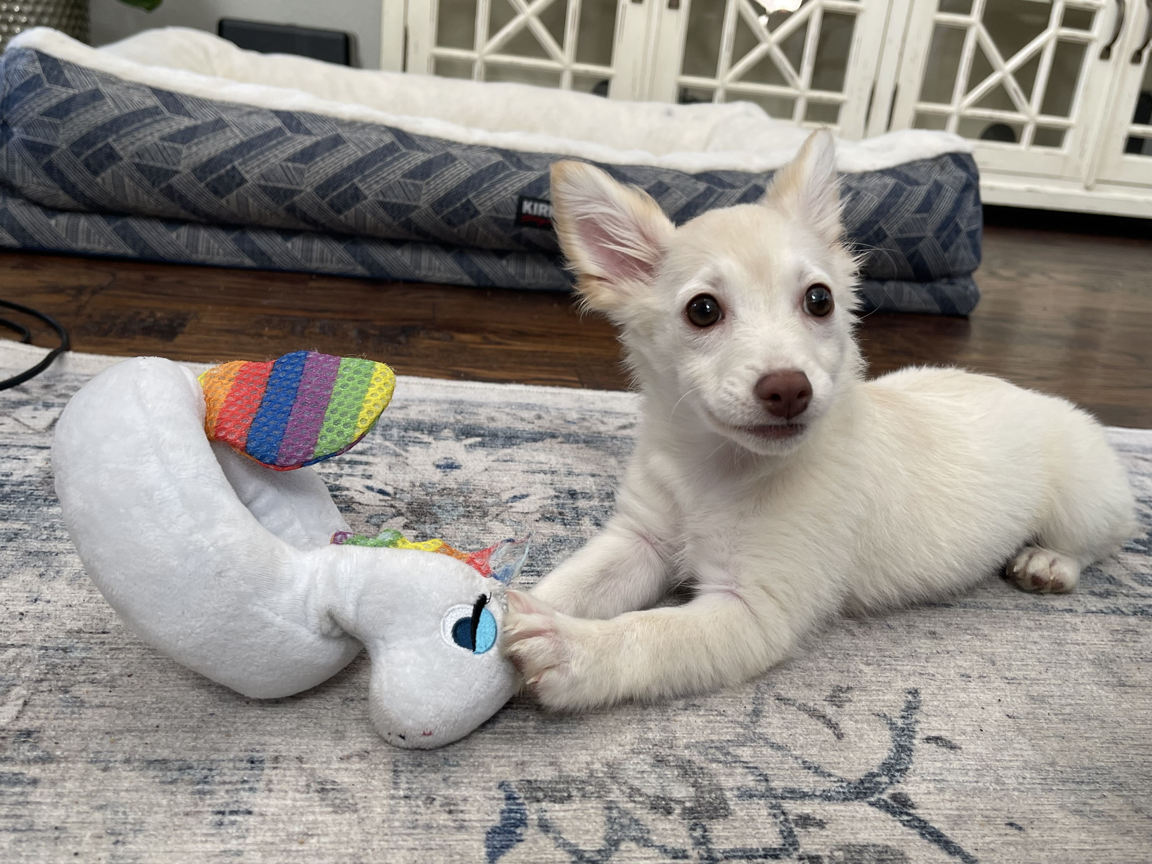 I’m an adorable, fun-loving, and chill 3-month-old, 5-lb. female puppy.