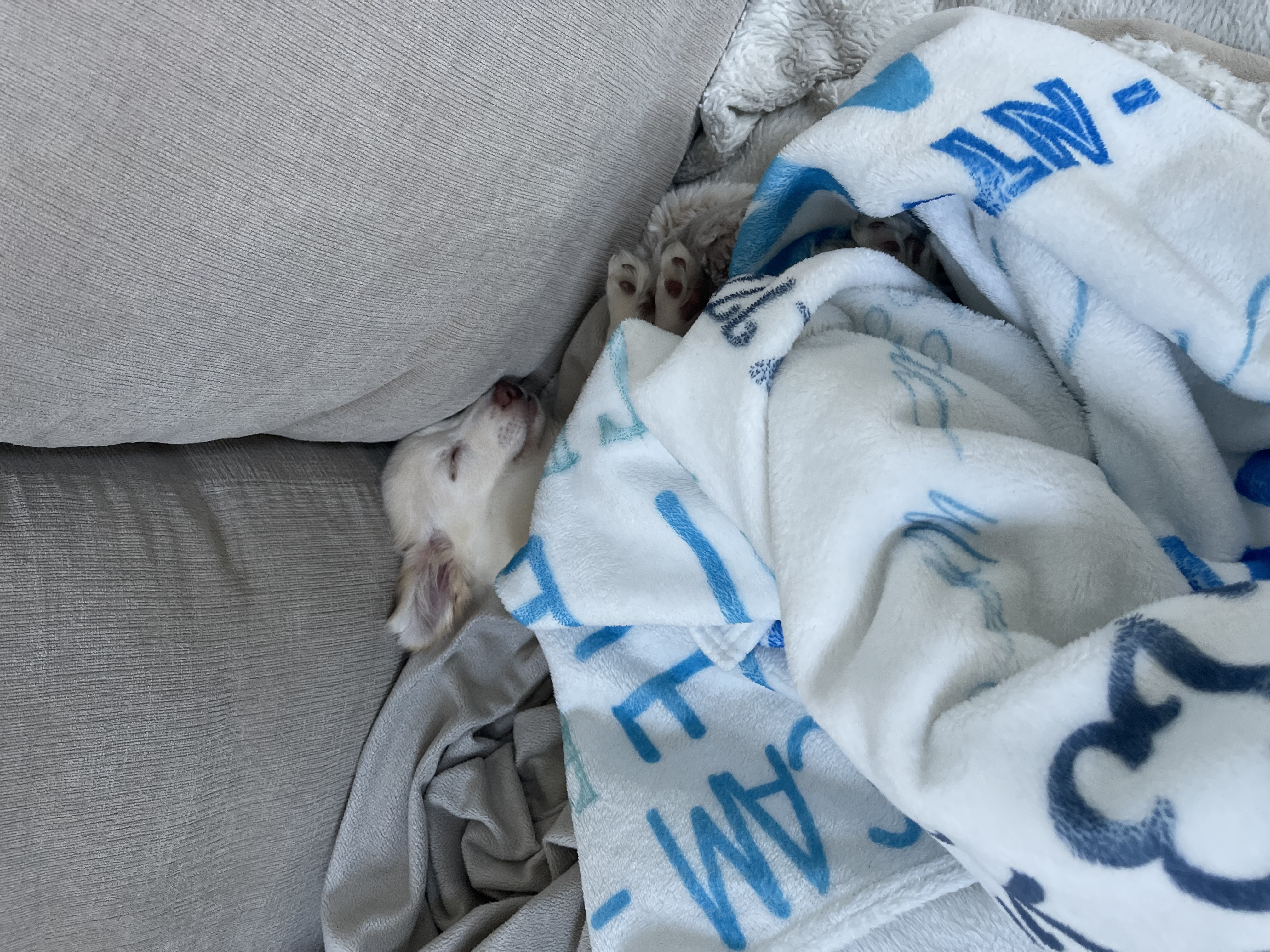 I wake up around 6:30 AM and go potty outside (yes, I do both!). If my foster mom lies down with me, I’ll happily go back to sleep until about 7:30. After breakfast, I’m ready to play! We usually go for a 30-minute walk with my foster sisters, and then I nap at my foster mom’s feet while she works. She takes me outside every hour to an hour and a half for fresh air and potty breaks. In the evening, I hang out with the family, eat dinner around 7 PM, and go potty again around 8. After some playtime, we wind down for bed around 10–10:30 PM. I sleep in my crate (I might cry a little at first, but I settle down and sleep through the night).