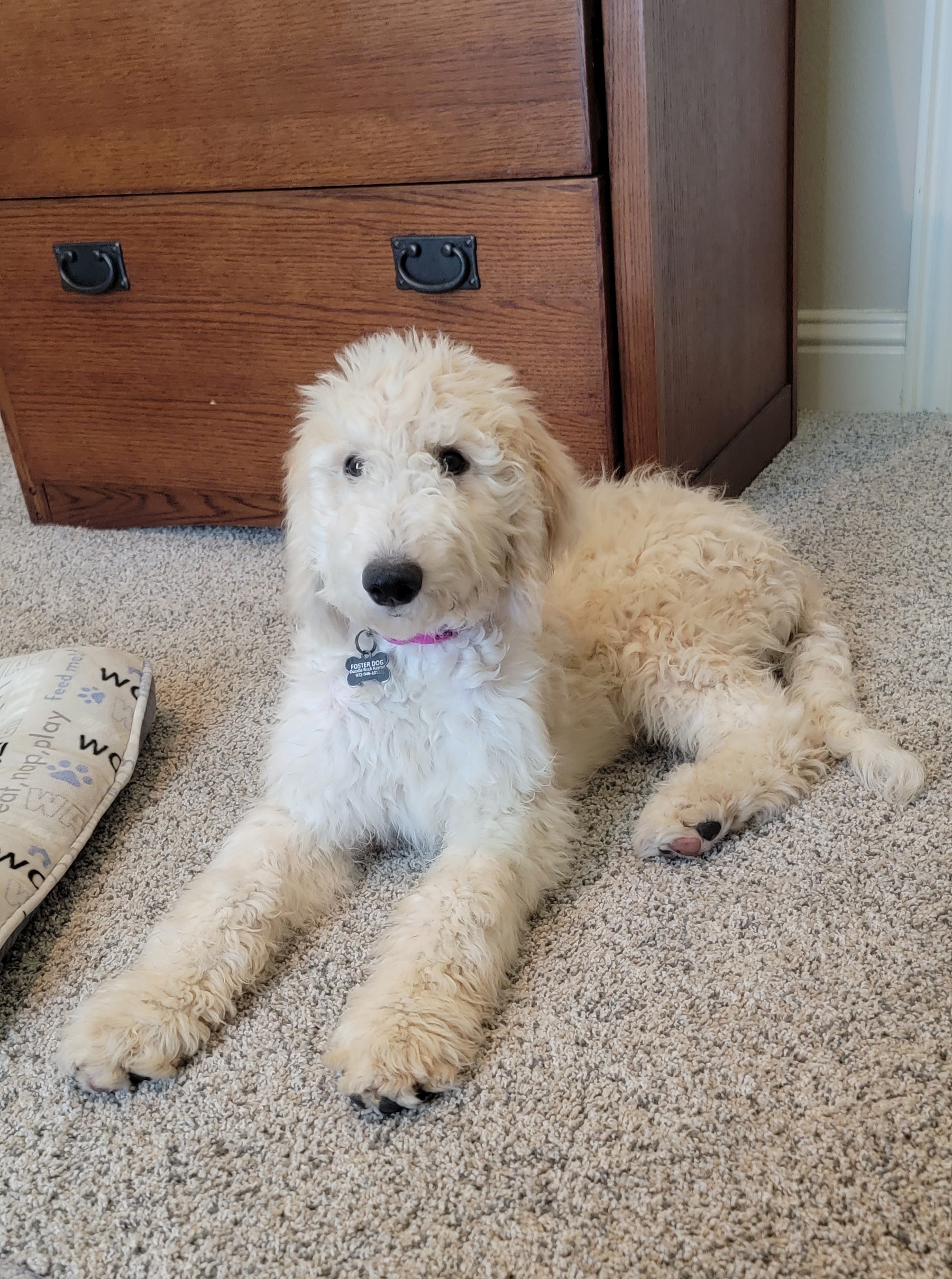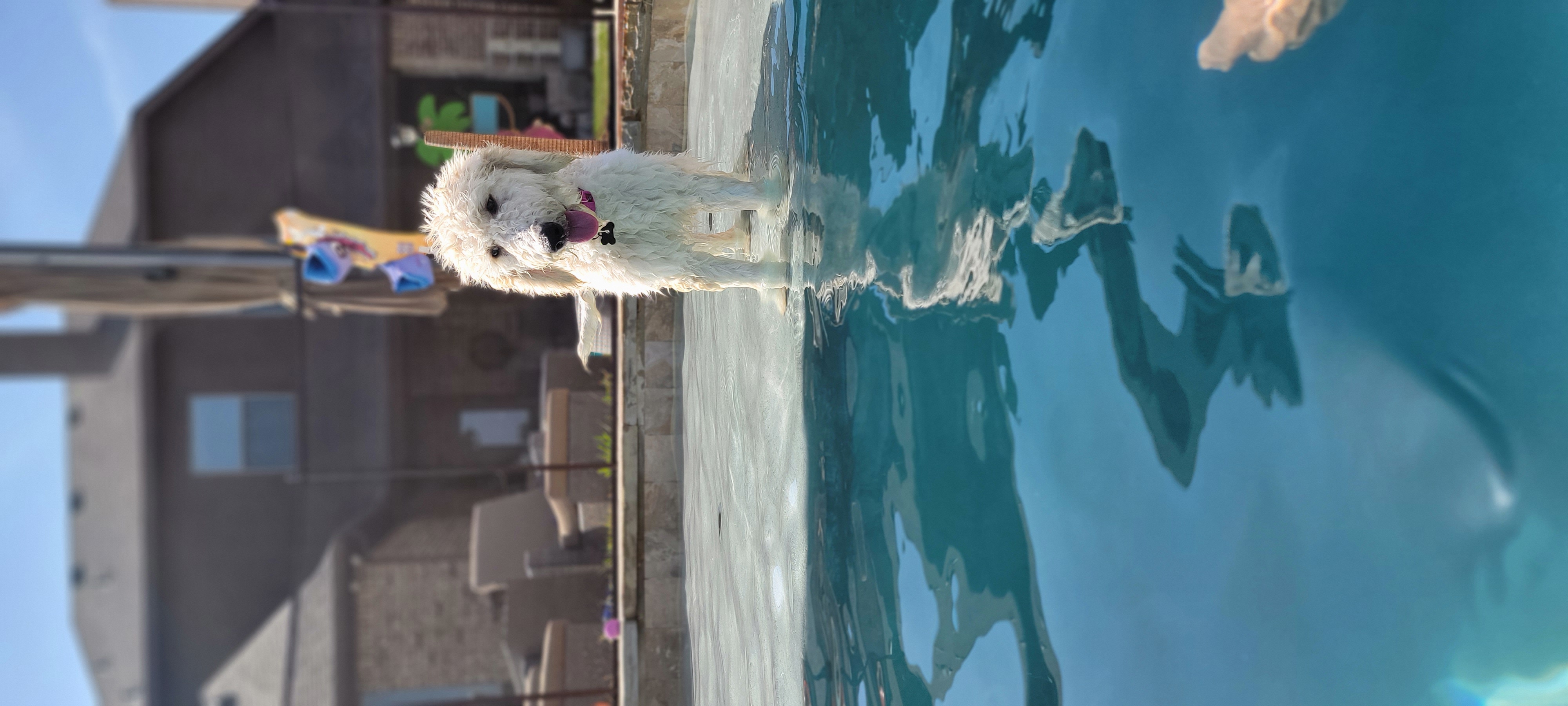 My day starts around 7am when I head outside to stretch my legs and go potty. I like to play for a while too. After my breakfast, I spend a lot of my day sleeping at the feet of my foster mom or dad while they work from home. I go out every few hours to potty and play. Then around 1pm I have lunch. More naps and play follow and then dinner is around 6pm. Lately, I've discovered swimming. It's definitely my new favorite thing! I like chasing a ball, but I haven't learned to bring it back. It’s so much fun! The rest of the evening I make myself comfy on a doggy bed or the floor and have quiet time with my family. Mom puts me in my crate around midnight. Sometimes I cry for a minute, but I eventually sleep all night. I’m still learning how to not pick up random house things in my mouth but, when I do, I'm easily redirected to the proper chew toy.