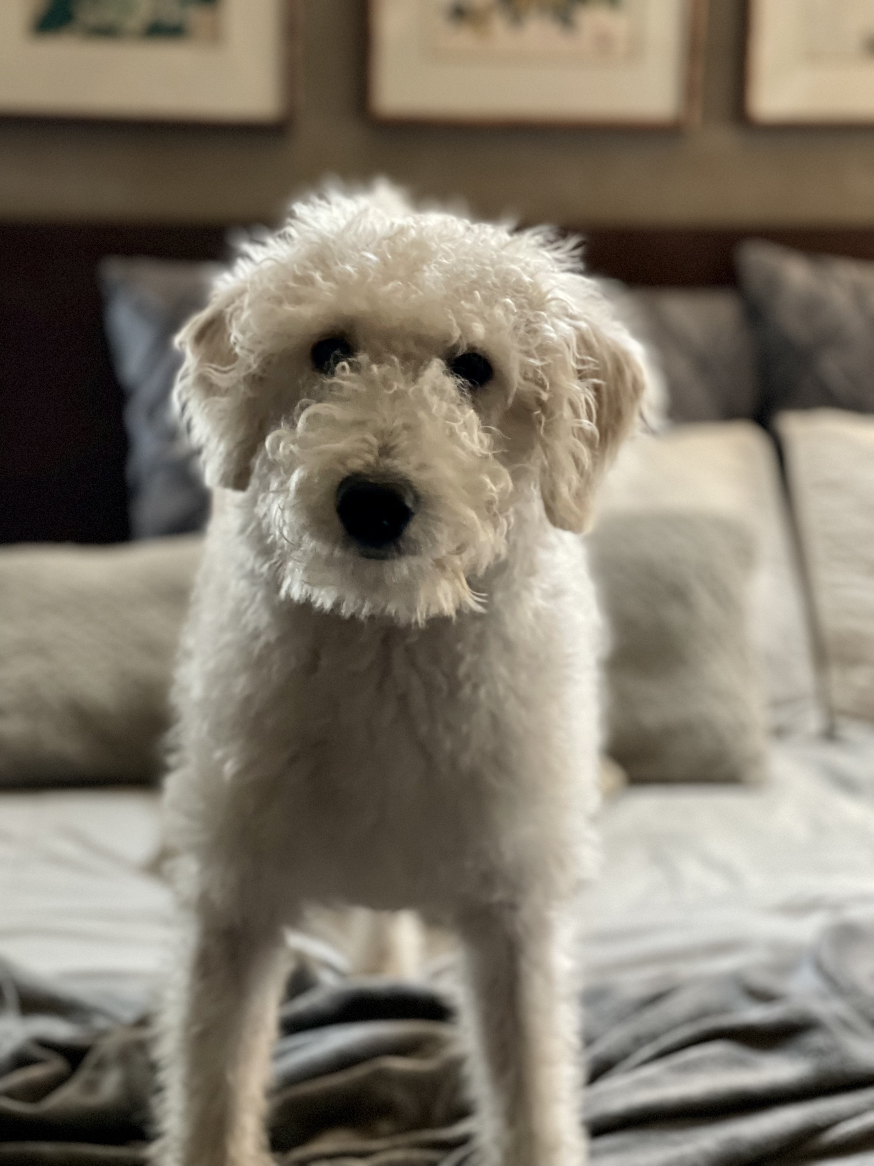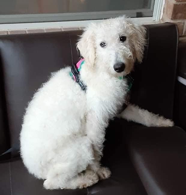 Hi I'm Betty White and I am a 1 Year Old, Female White Labradoodle. I shed, but with regular brushing it isn't a problem. Dainty describes my size as I am only 32lbs and foster mom doubts I will get much bigger.