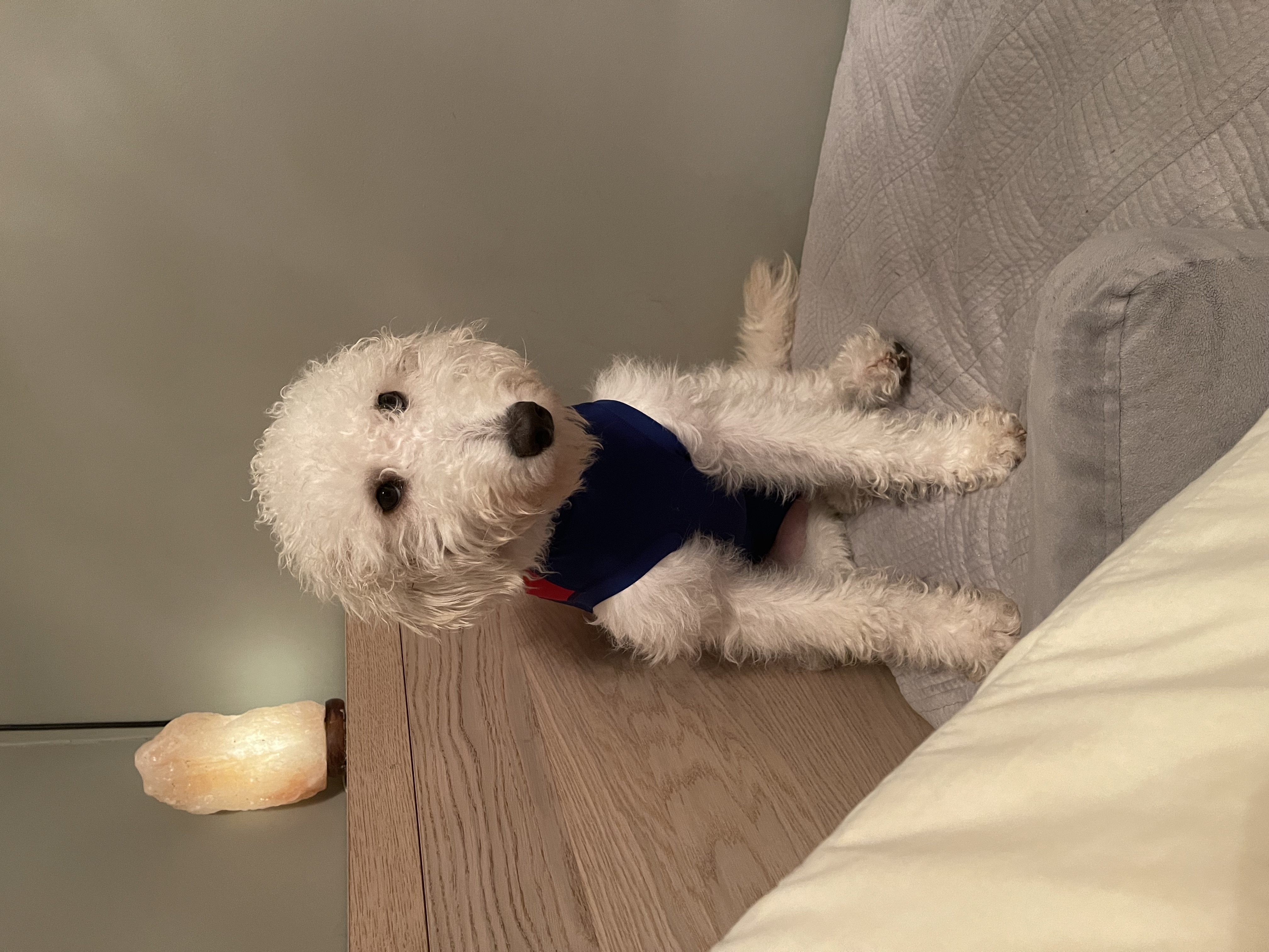 I go to bed with my foster grandpa around 10pm and I like to snuggle up by his head or somewhere near him. My days are simple I get up and have a little outside time before coming in to eat. The rest of my day is filled with playing napping, lots of potty breaks, and finished with a yummy dinner and more potty breaks. I still need to be watched pretty constantly because I am so quiet, the only way I let you know I need to go potty is by walking to the back door.