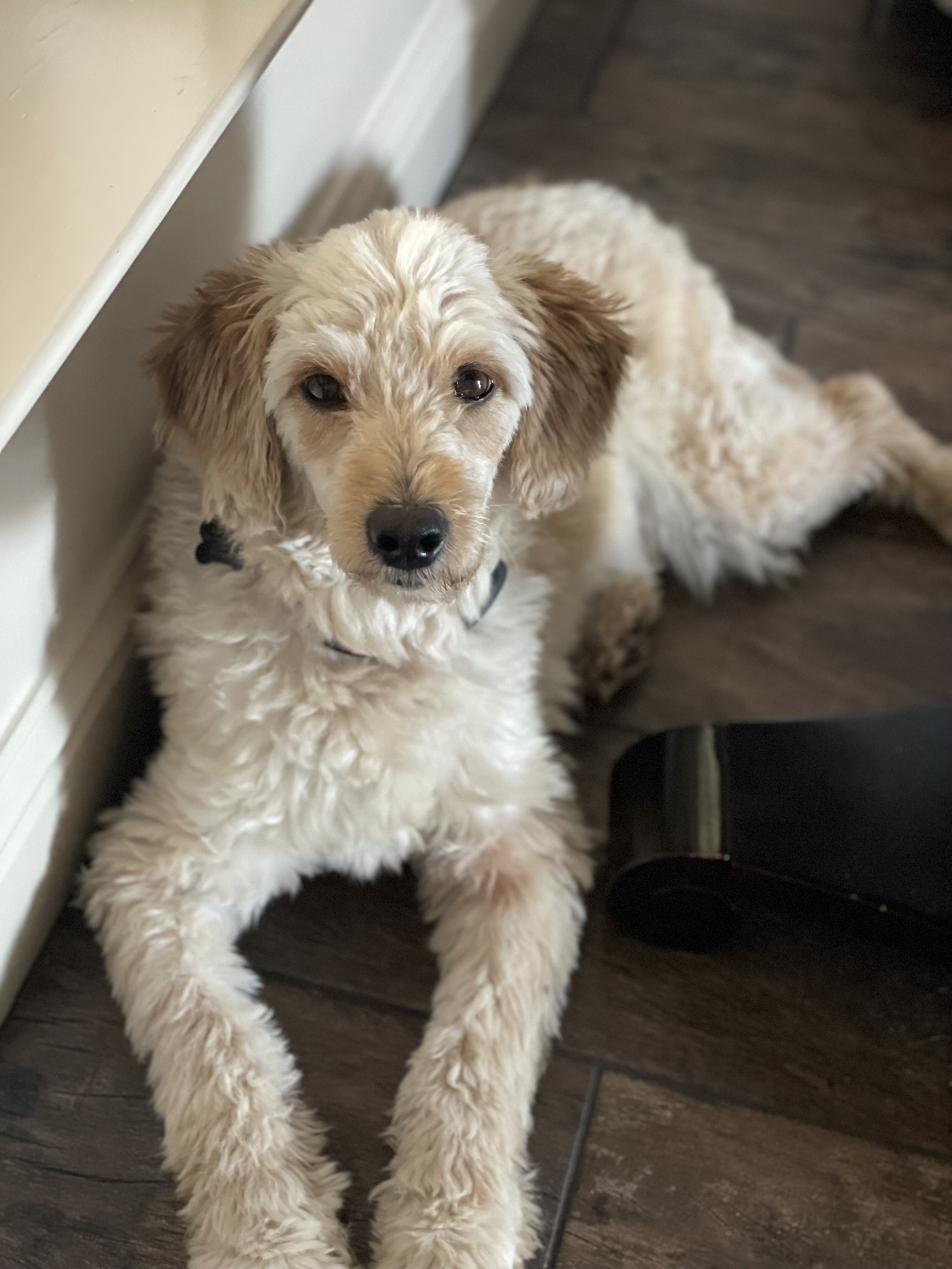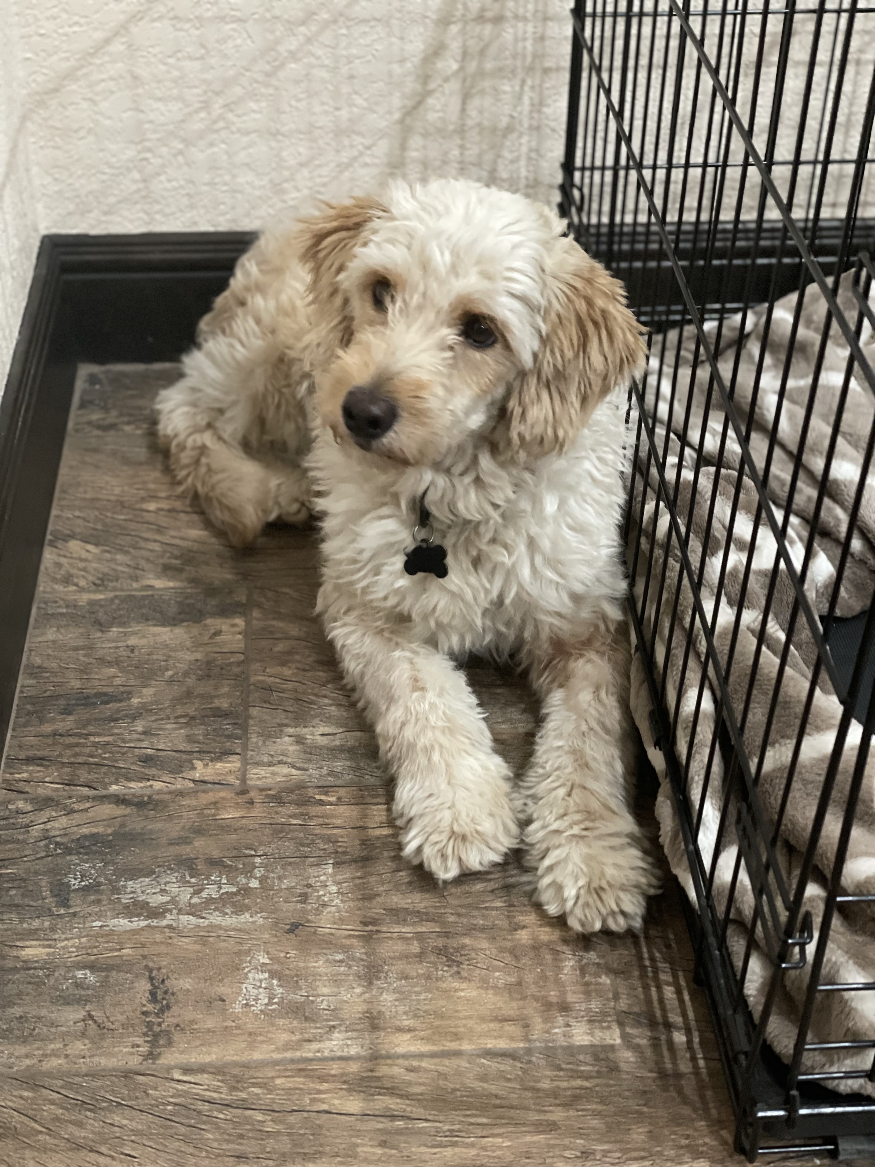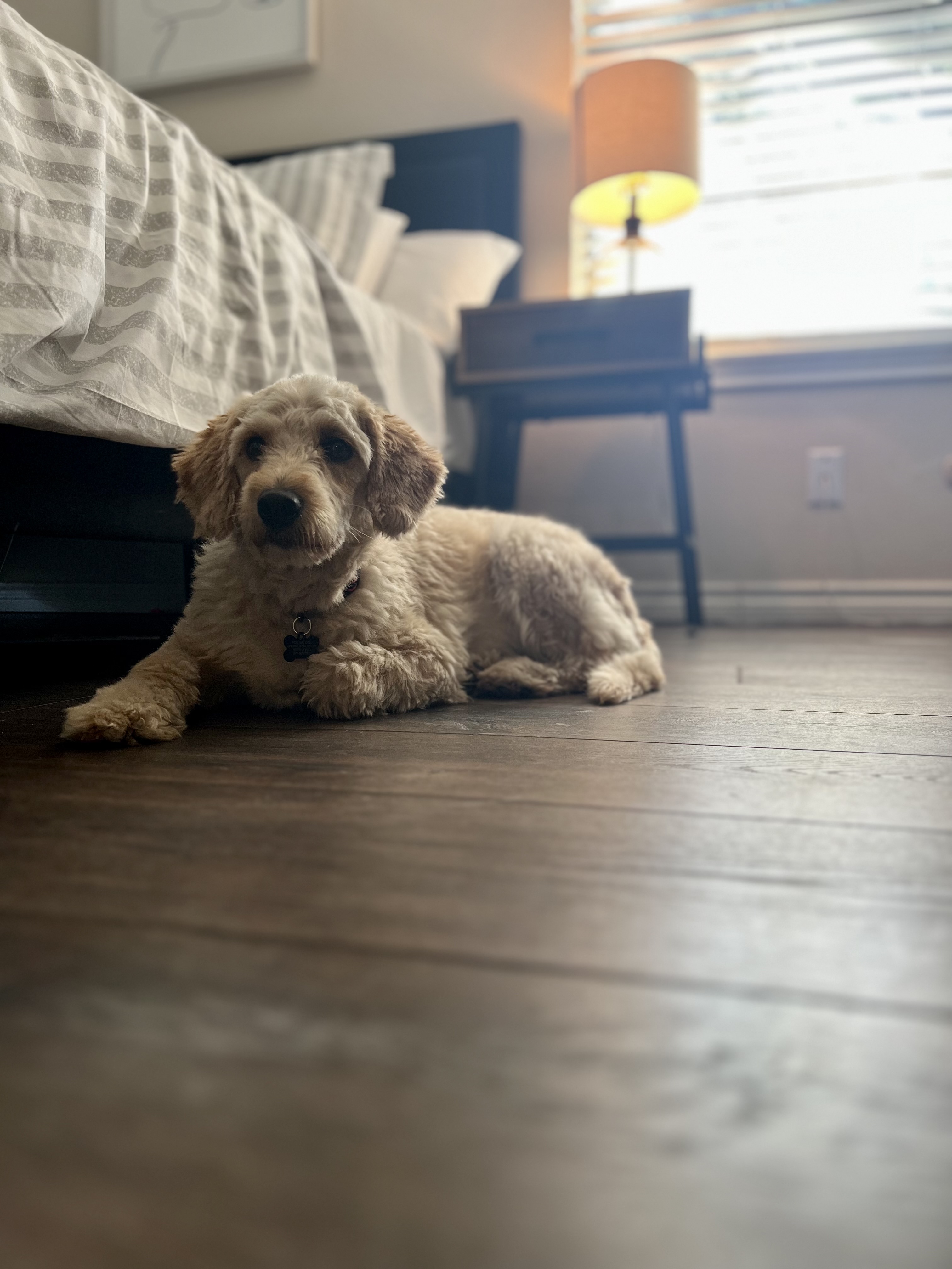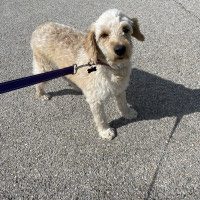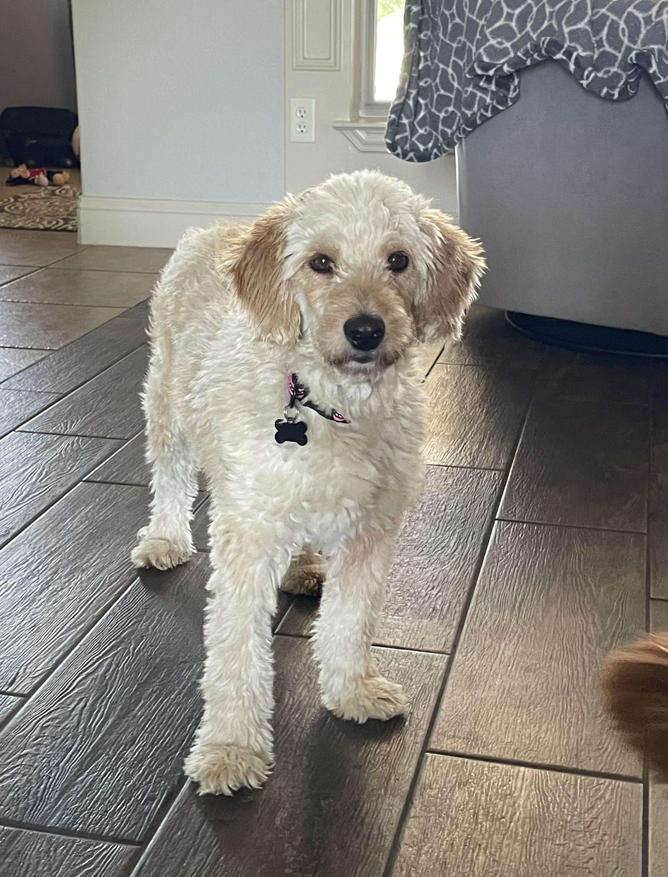 My name is Birdie! I am a 3 year old 23lb Female Labradoodle. I am still learning what the good life is! I’m a sweet girl who loves to play with toys. Once I get to know you, I do not leave your side. I will be wherever you are. I am timid around new people and loud noises, but I am coming around. I prefer to be with my humans or foster sisters I do not like being alone.