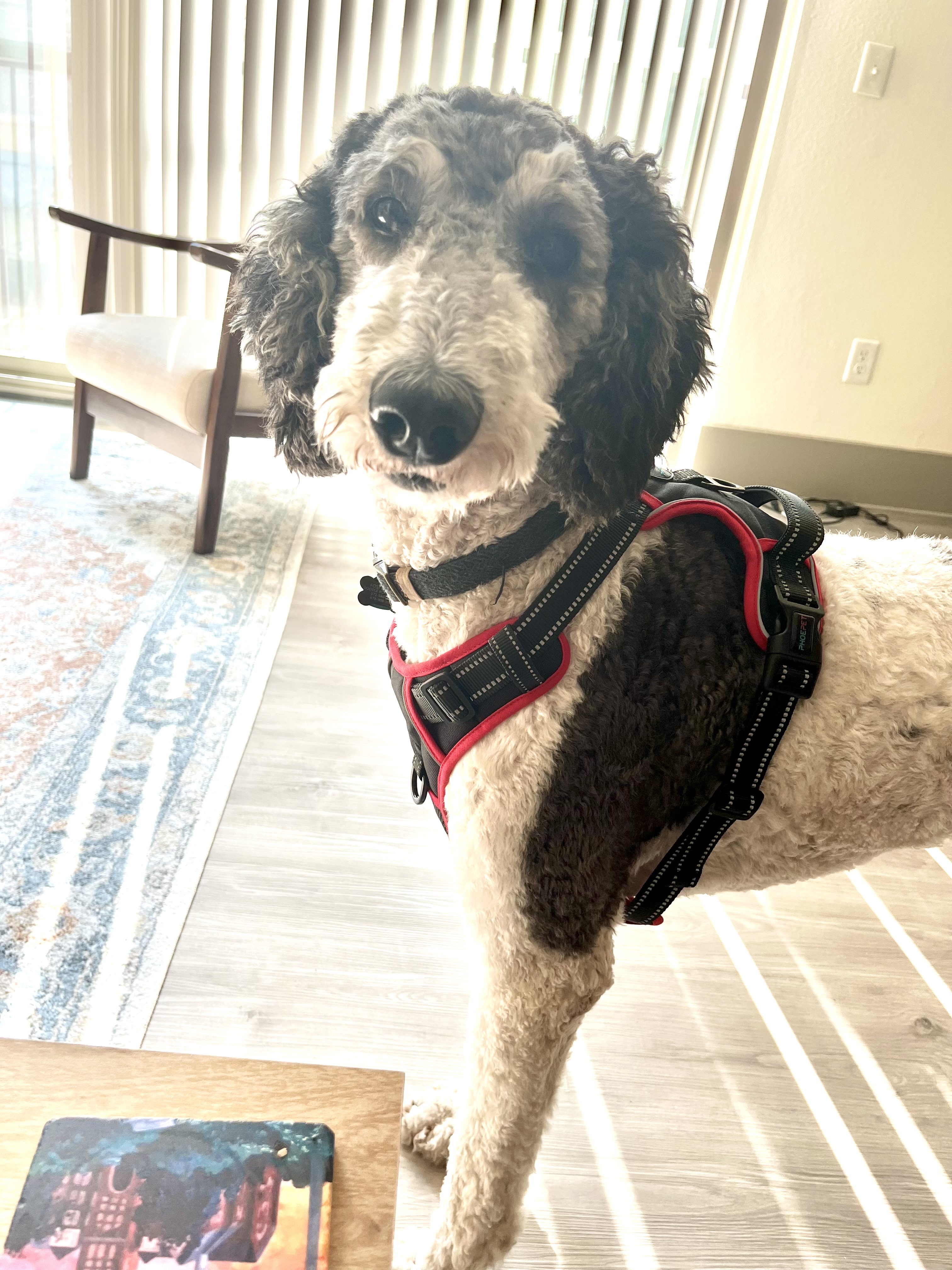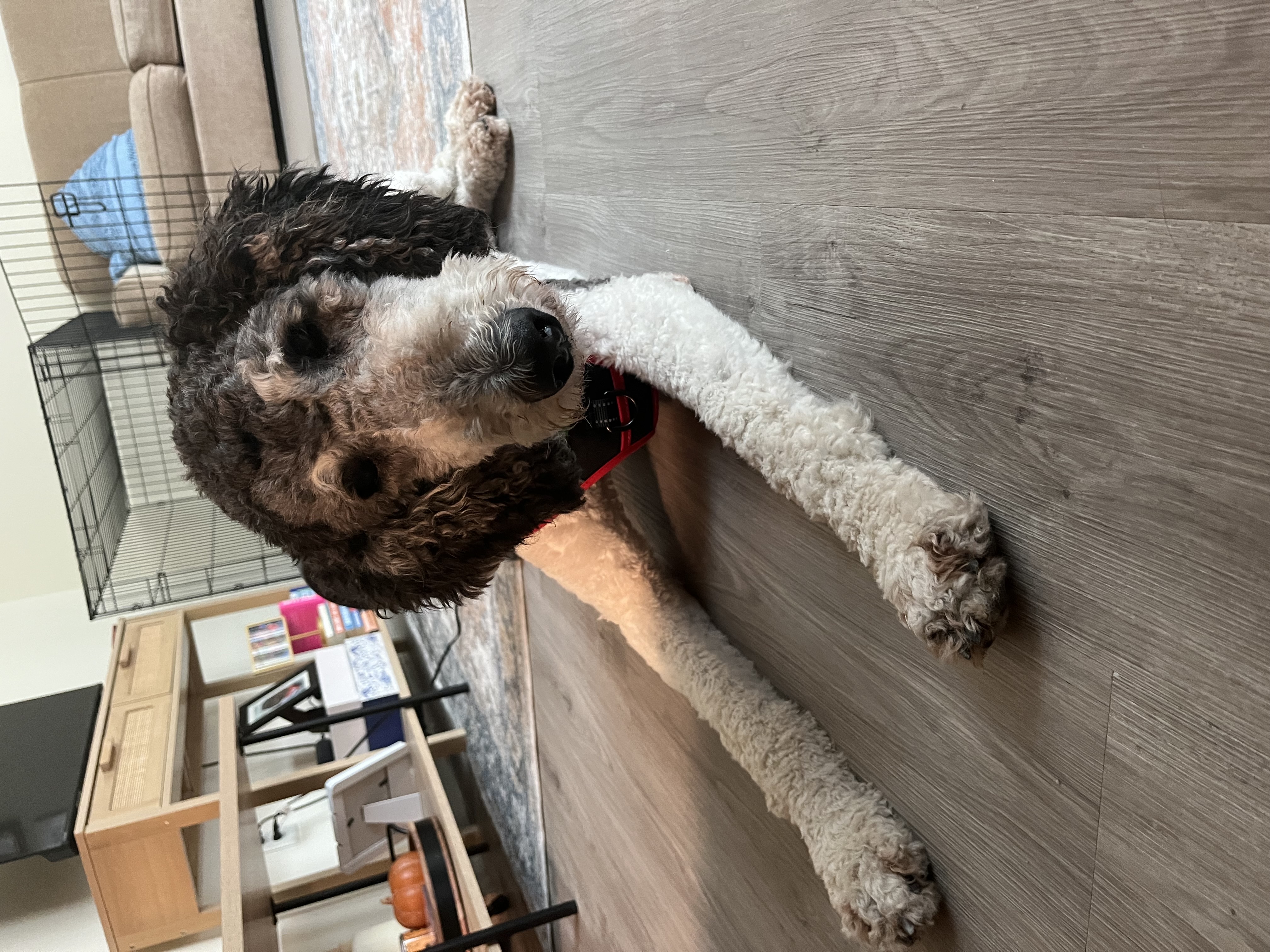 Don’t let his gray face fool you! Bob is a 2 year old Male Parti Poodle. He weighs about 70 pounds but could gain some more.