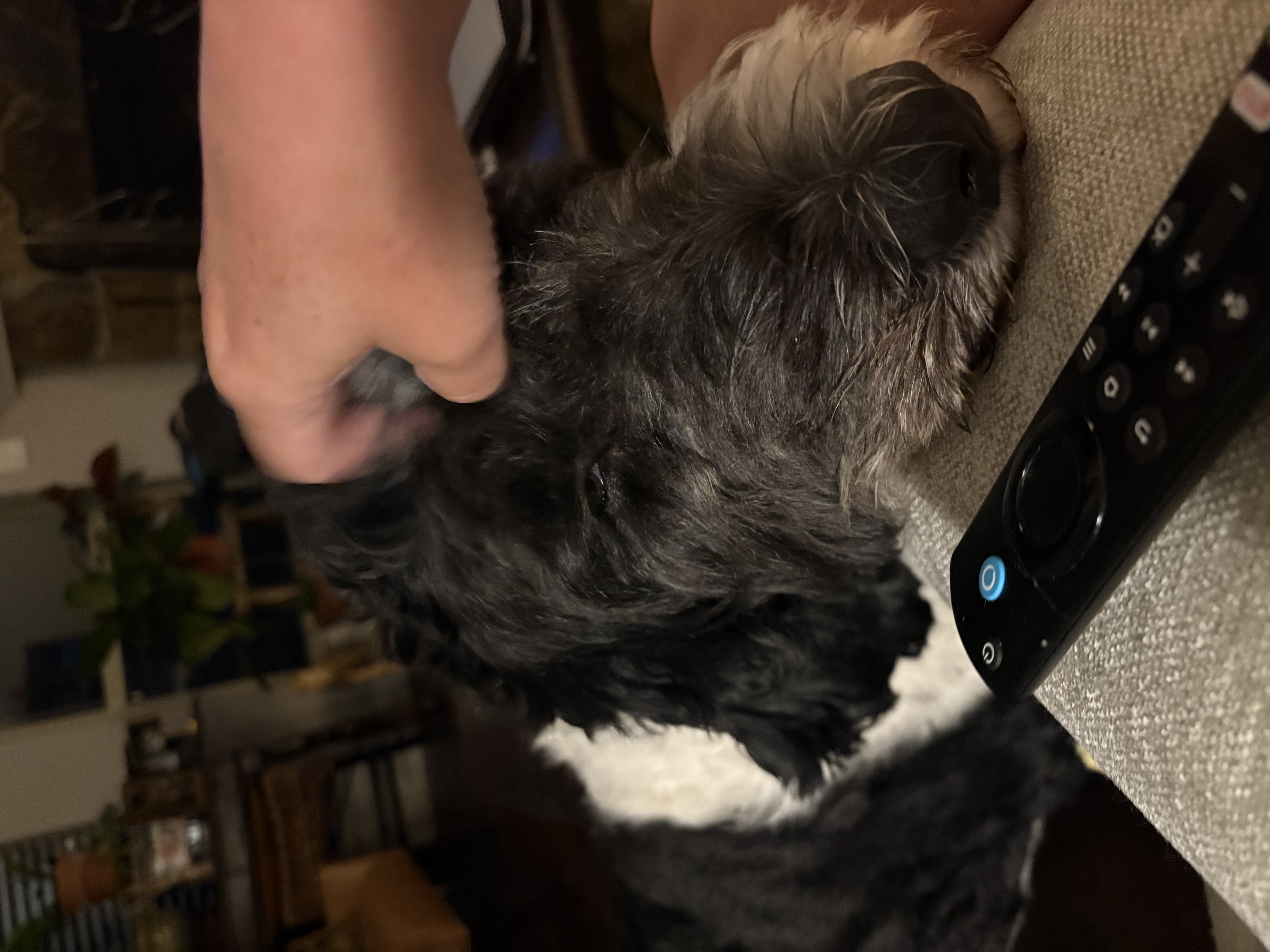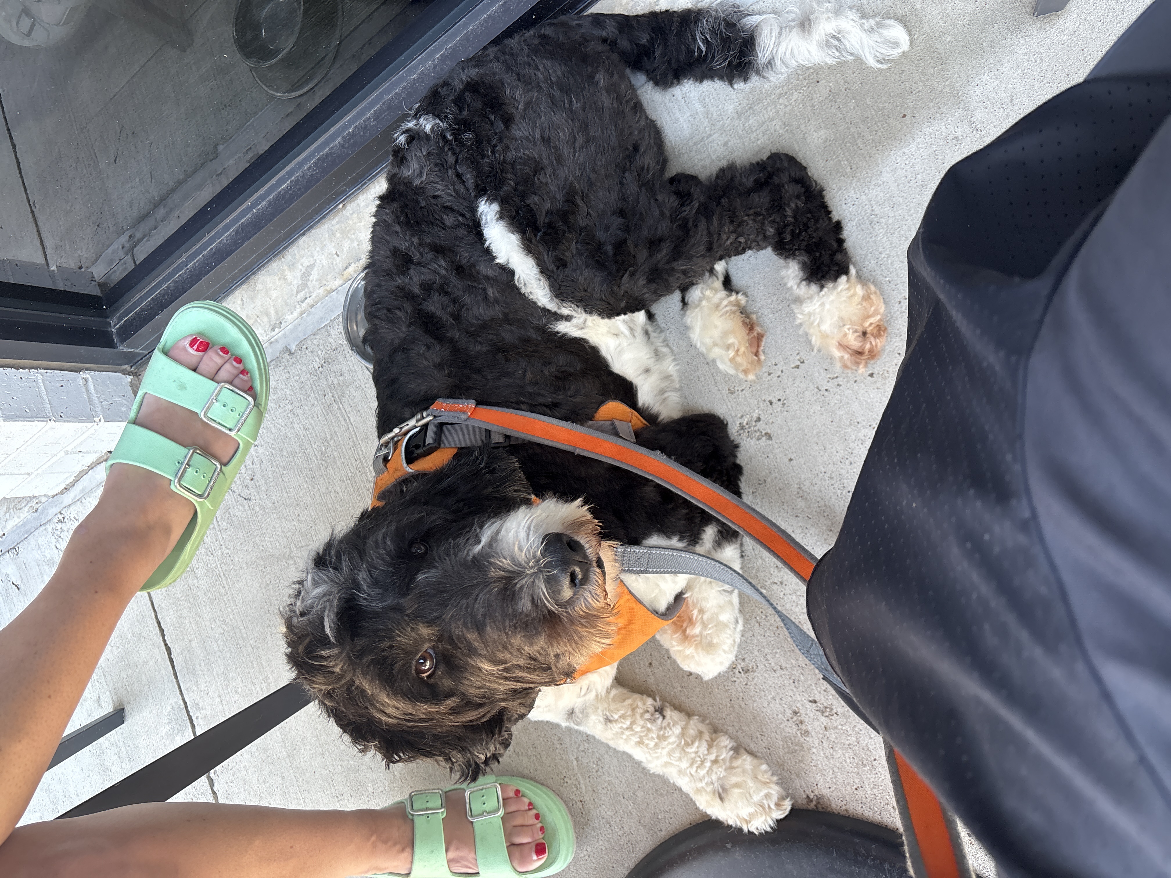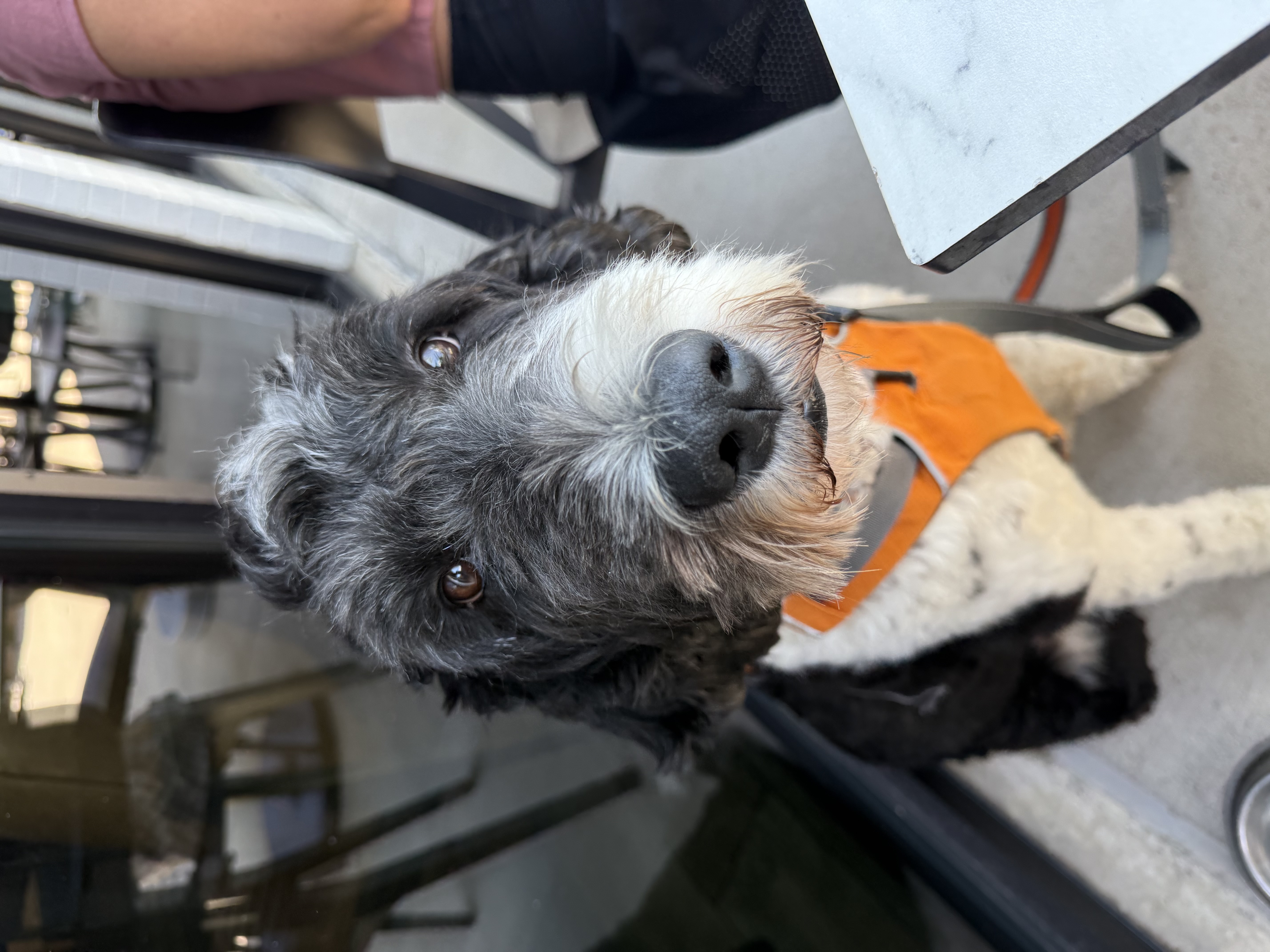 Our human has friends over, including kids. I prefer calm energy but don’t mind the action, especially when a gentle girl brushes my coat—I love it! We take rides to parks and patios for pup cups and ice cream, and I like resting under the table during outings. Evenings are for dinner, outdoor lounging, and early bedtime. I sleep through the night, dreaming of a forever home.