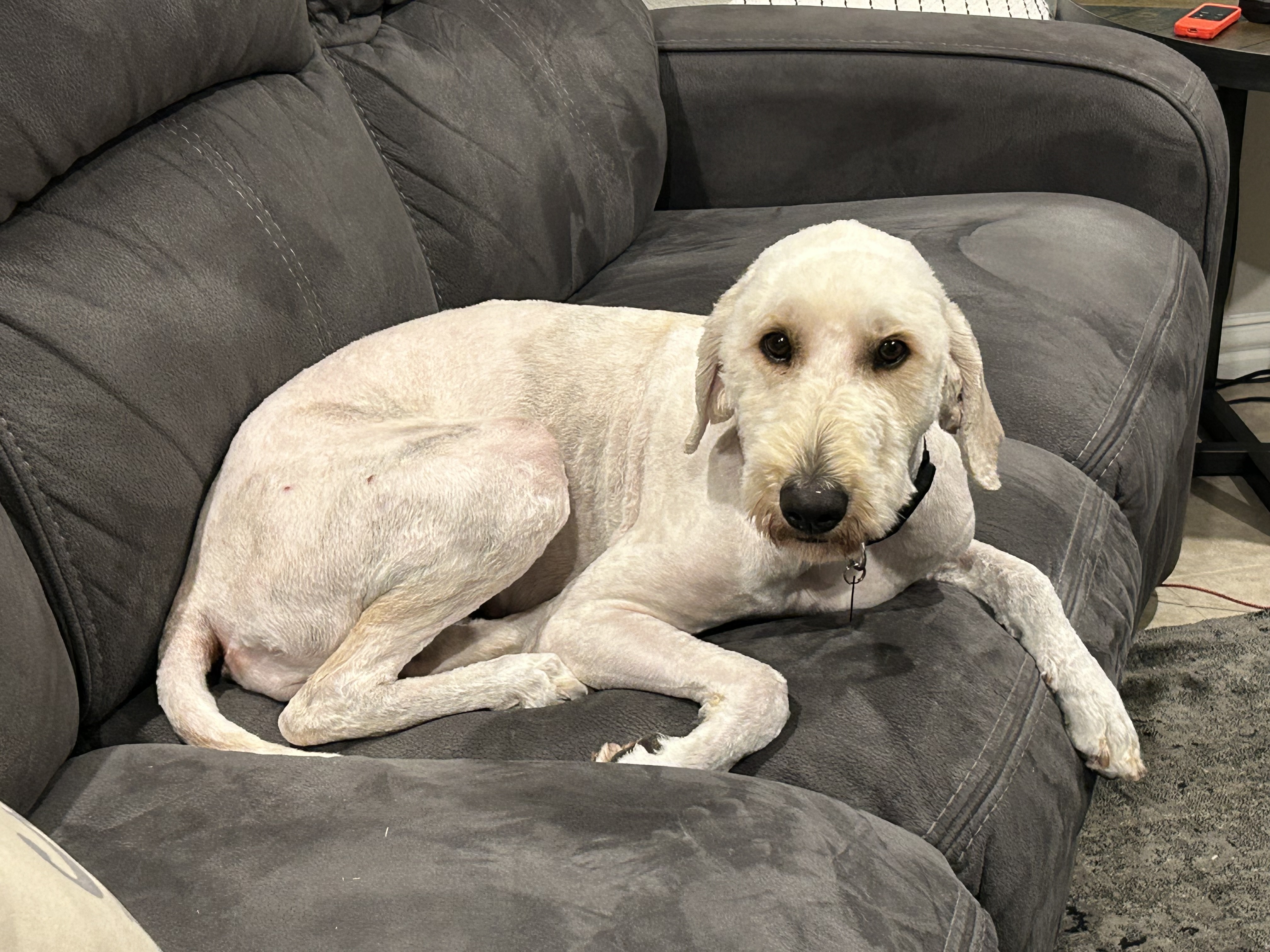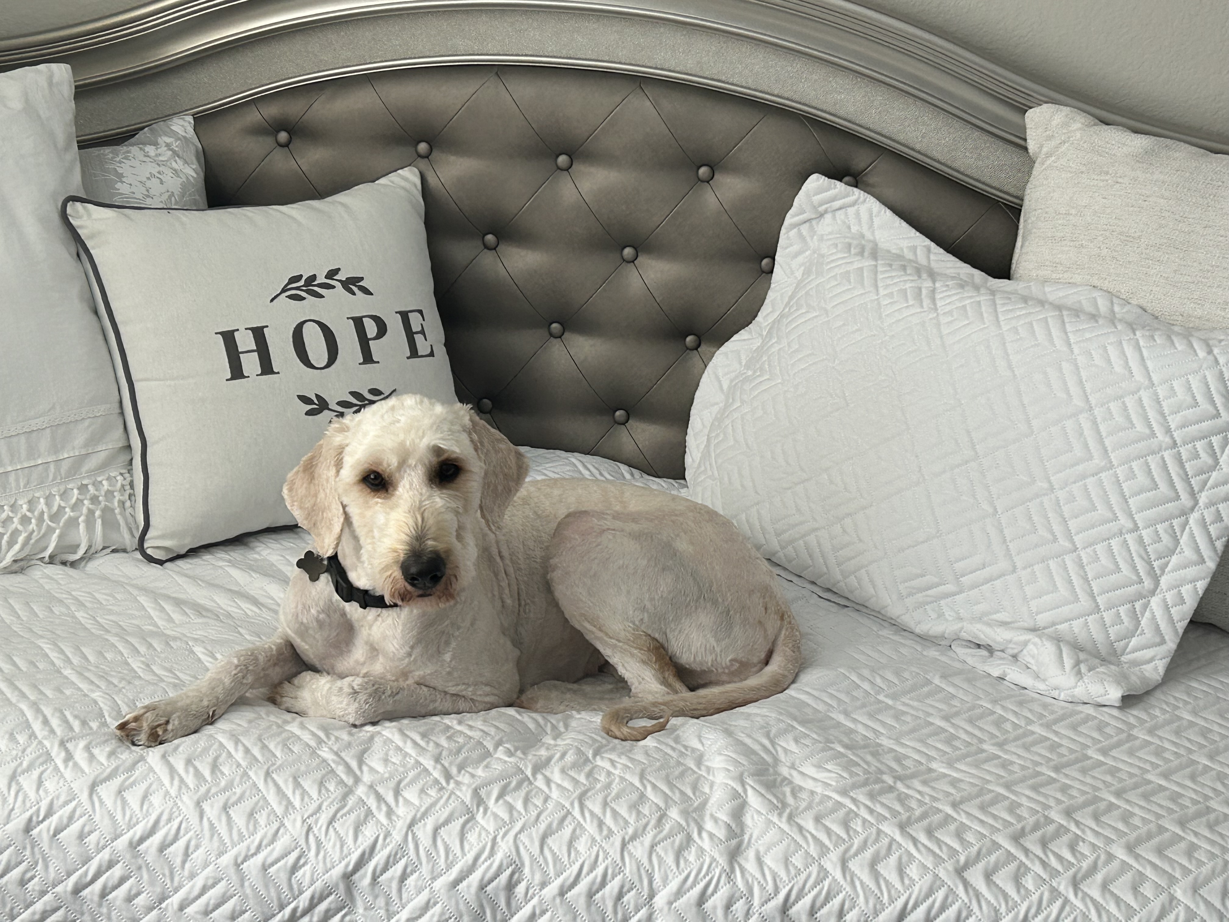 I don’t mind being left alone, but I prefer for music or the tv to be left on—and the lights too! I like normal people noises, but sudden, loud sounds frighten me! When I am nervous or excited, I’ll do zoomies around the yard and roll in the grass—just remind me to shake it off before coming back inside.