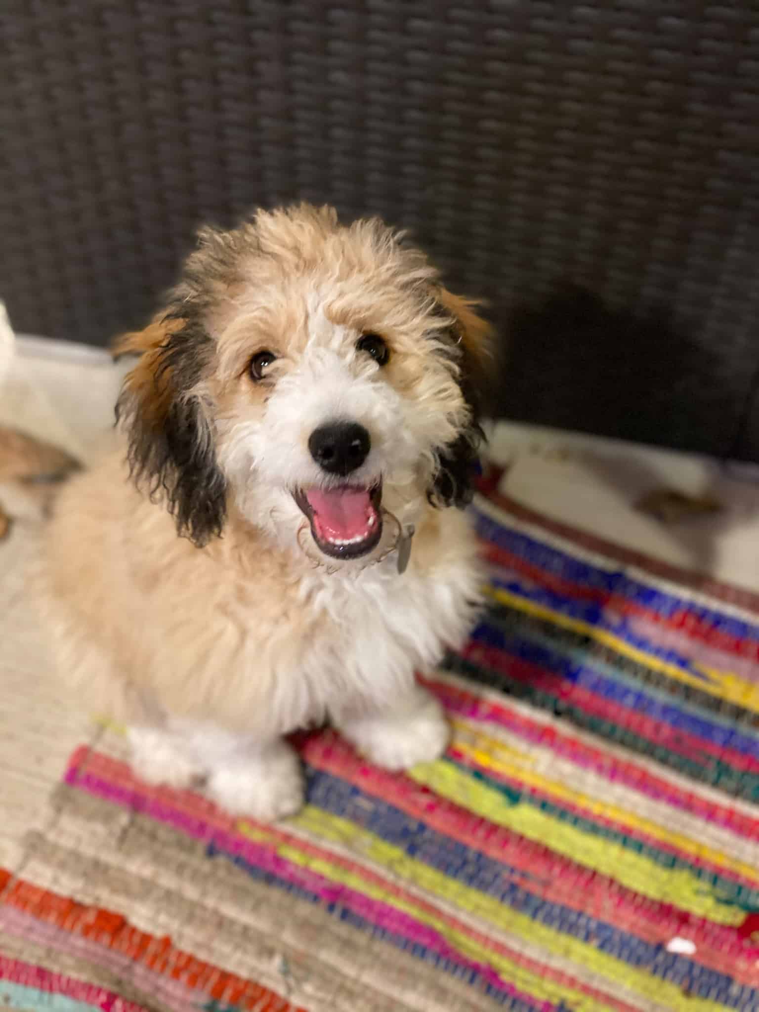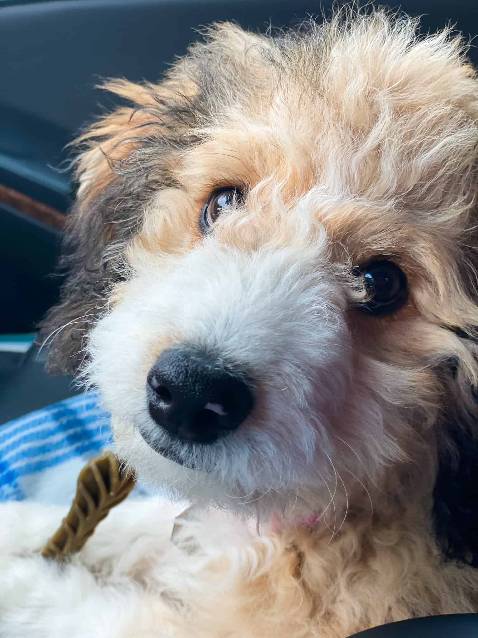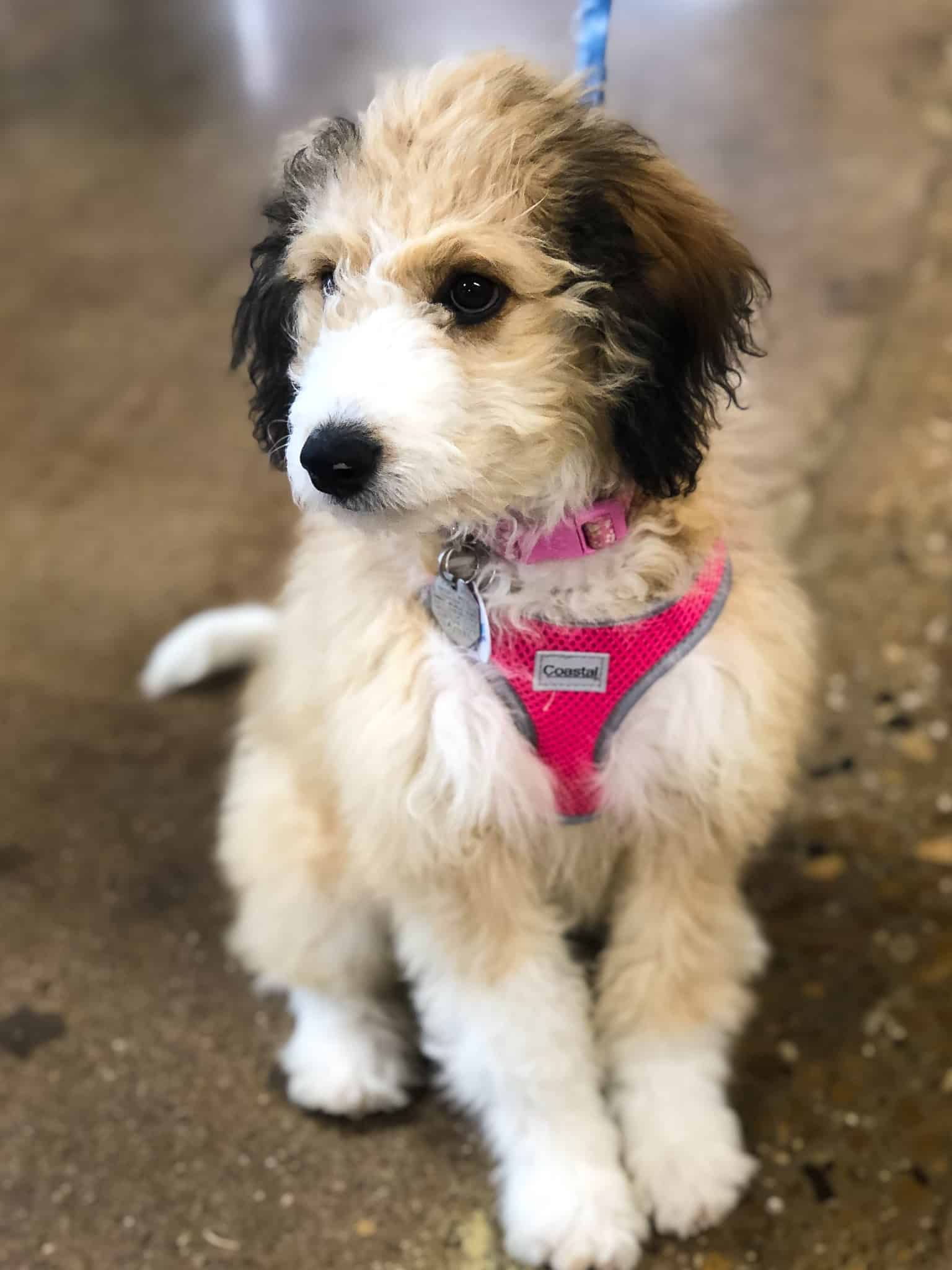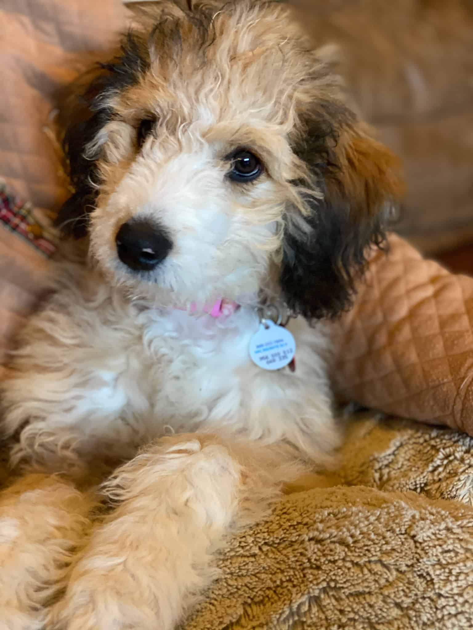 Hi, I’m Callie! I’m a 4-month-old, 19 pound, female “mini” Aussiedoodle. I’m “mini” but my dad was on the larger side, so I think I may be as well. I do shed, but very little.