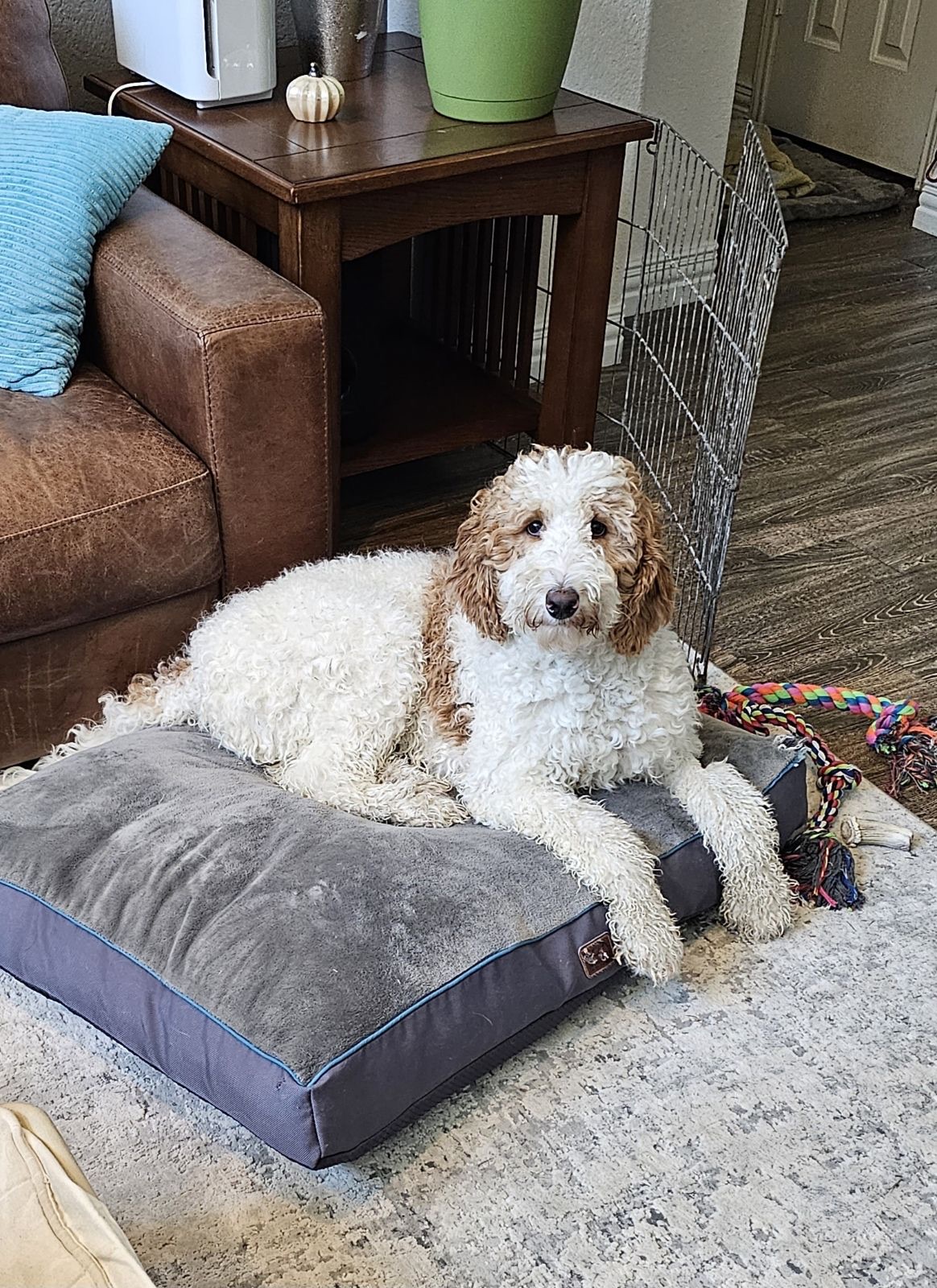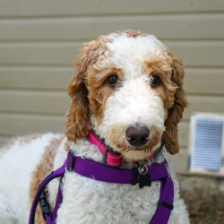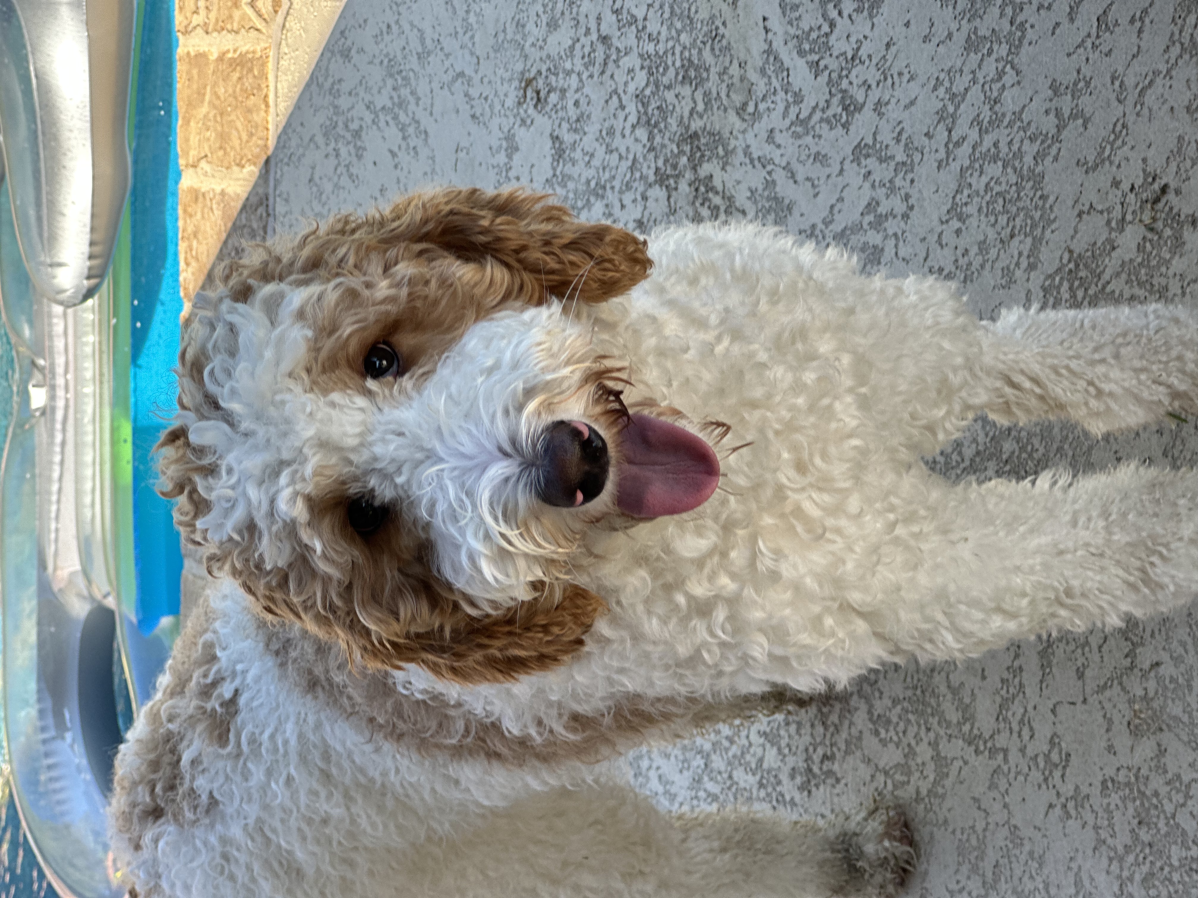 Hello! My name is Camilla. I’m a 1 yr old Female Standard Poodle. I have a cool brown/white parti coloring and weigh about 40 lbs.