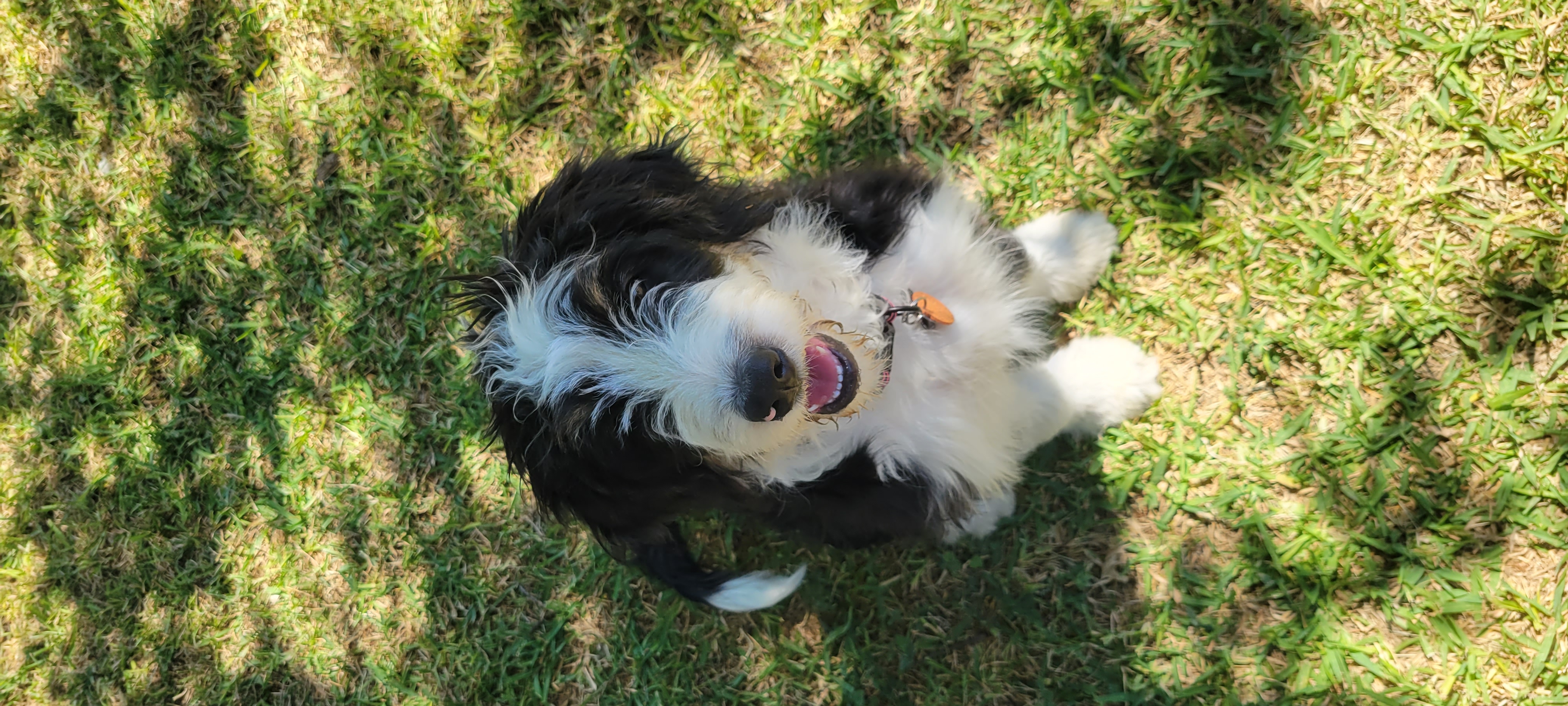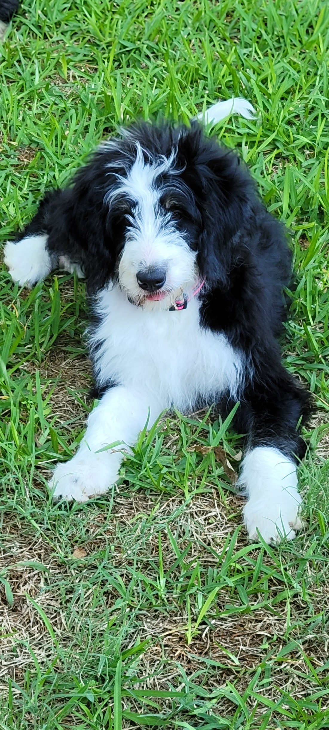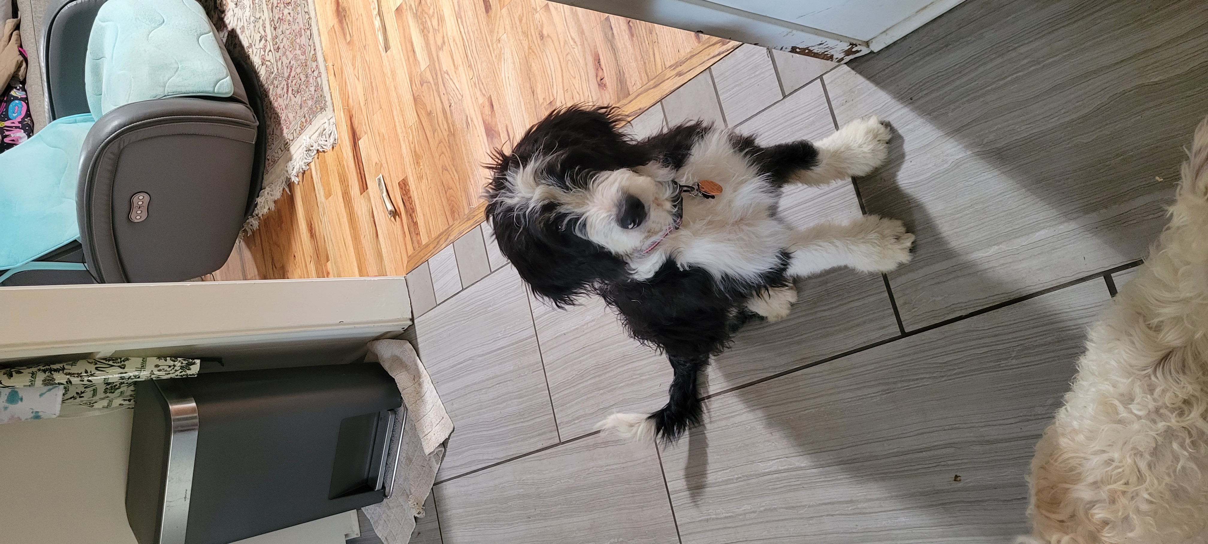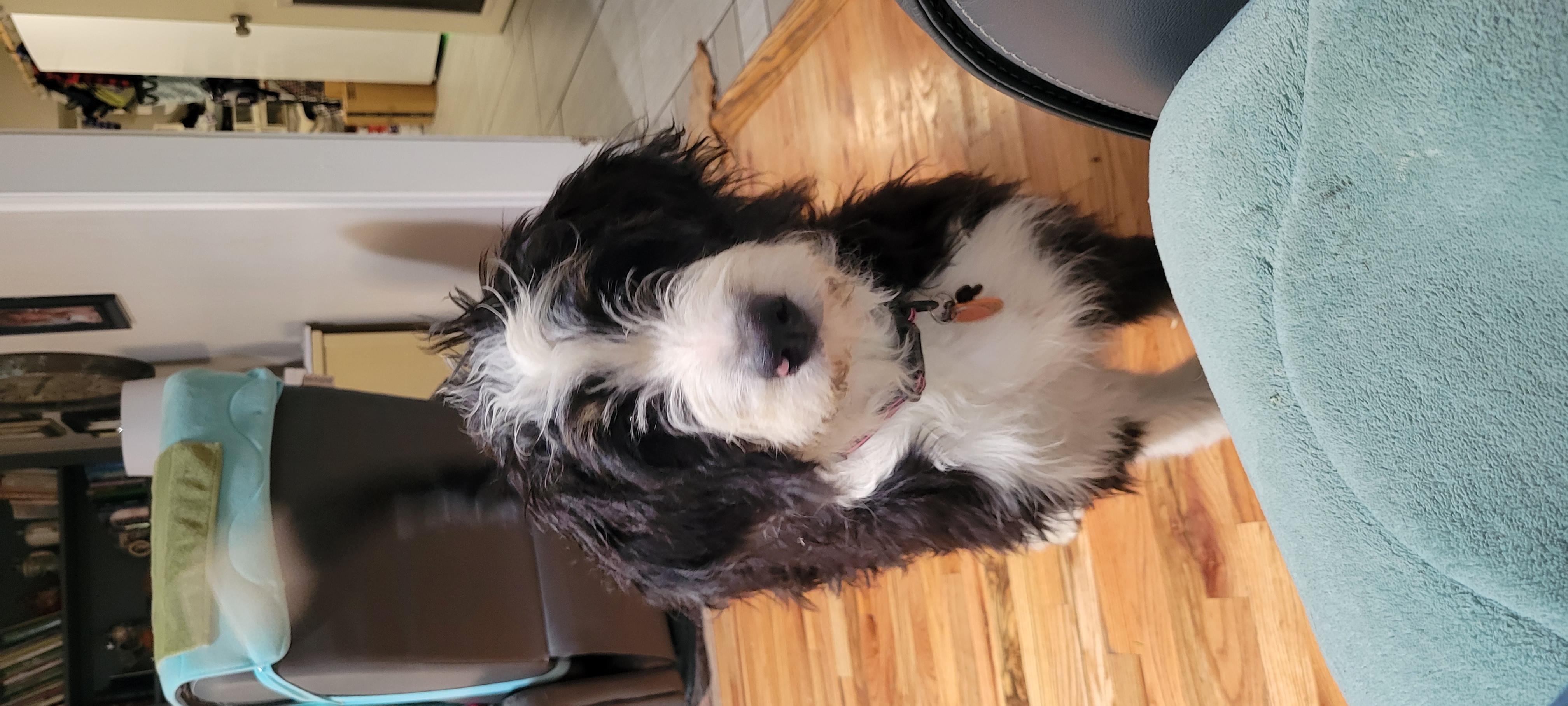 Hi everyone, my name is Candy Corn "CC". I am a beautiful 4-month-old, 38lb Female Bernedoodle. I love to give you kisses and snuggles.