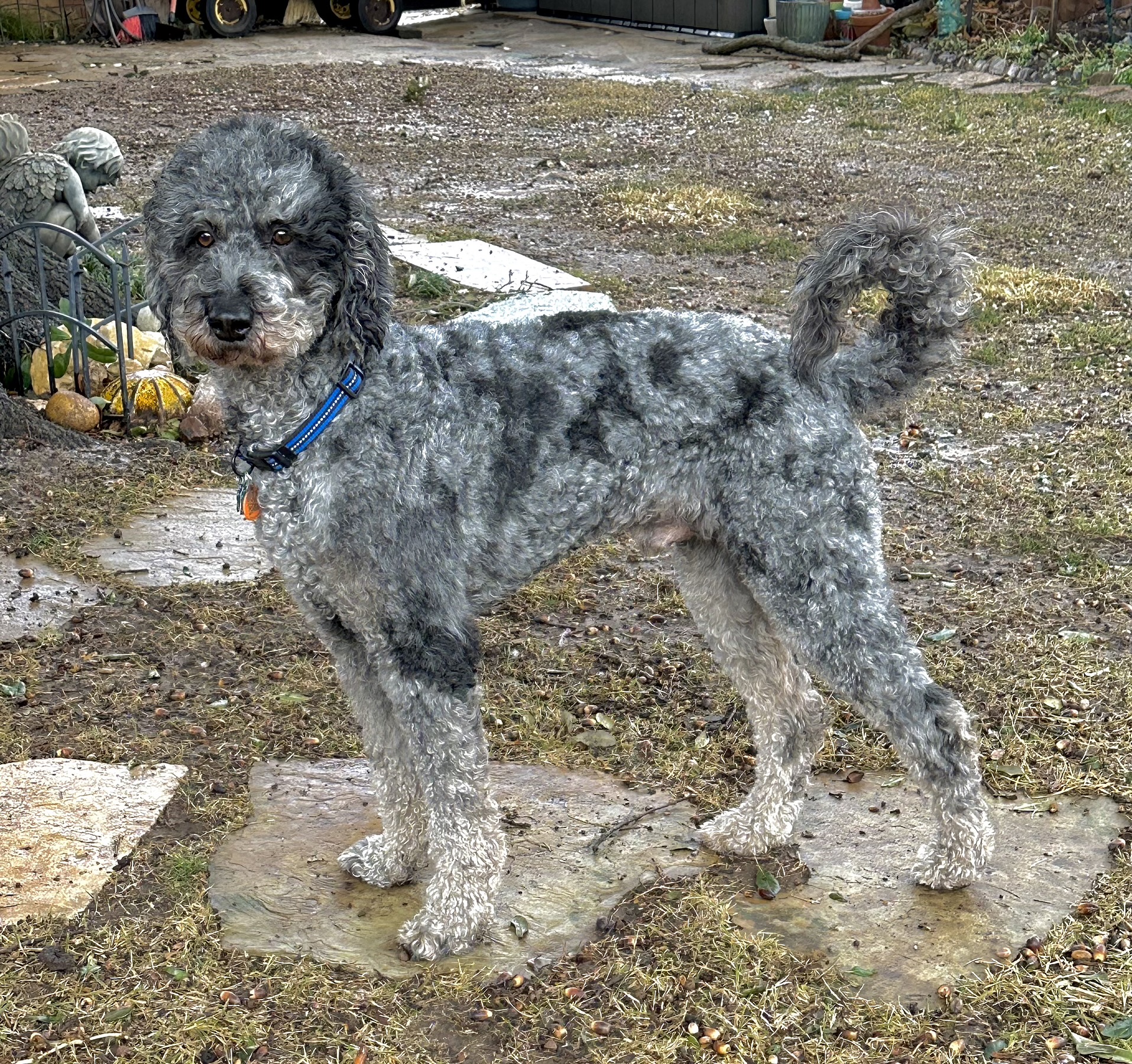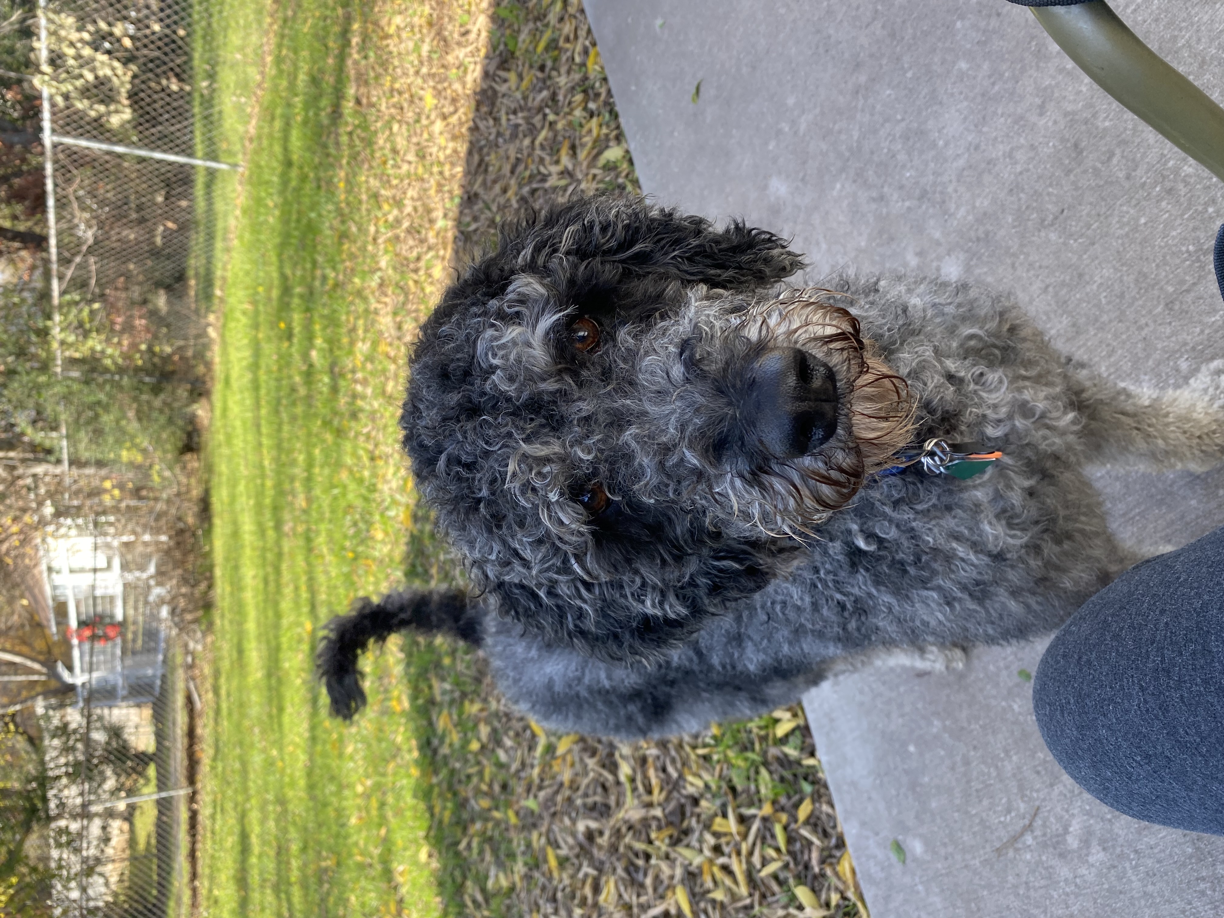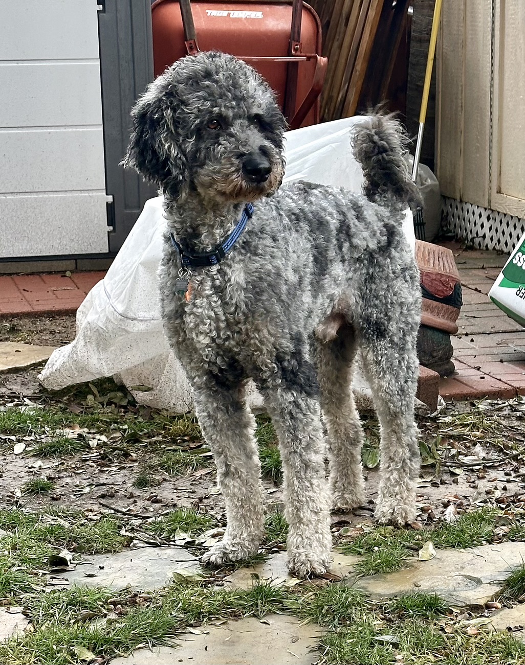 Hello there! I'm Chandler, a delightful 45lb, 3 1/2-year-old male Goldendoodle with a stunning merle coat (black/grey). I've got the longest legs, and I'm all about spreading joy! My foster mom says I'm the happiest, goofiest lap dog she's ever met. You'll often find me on the couch, as close to her face as possible, showering her with kisses and affection.