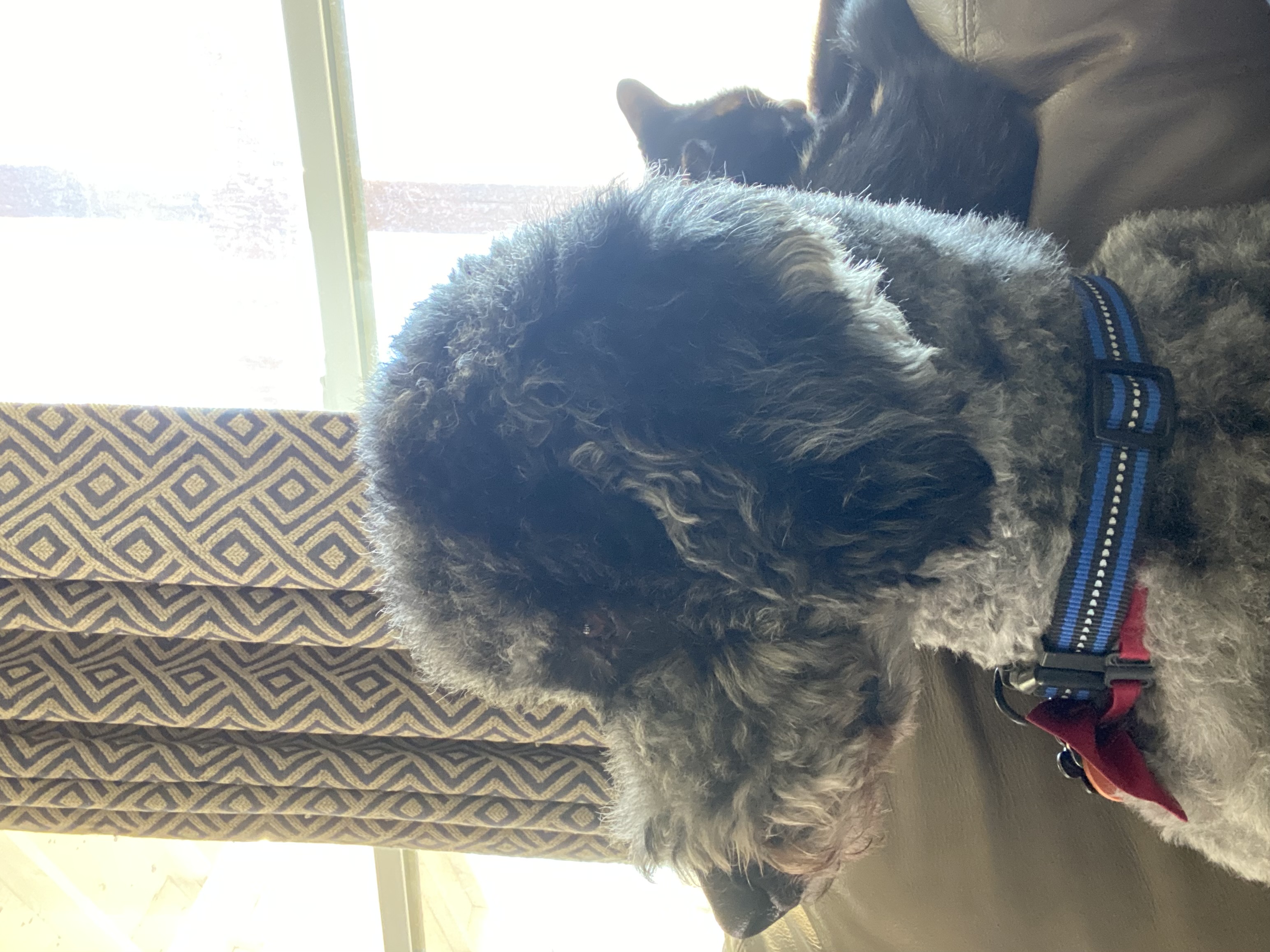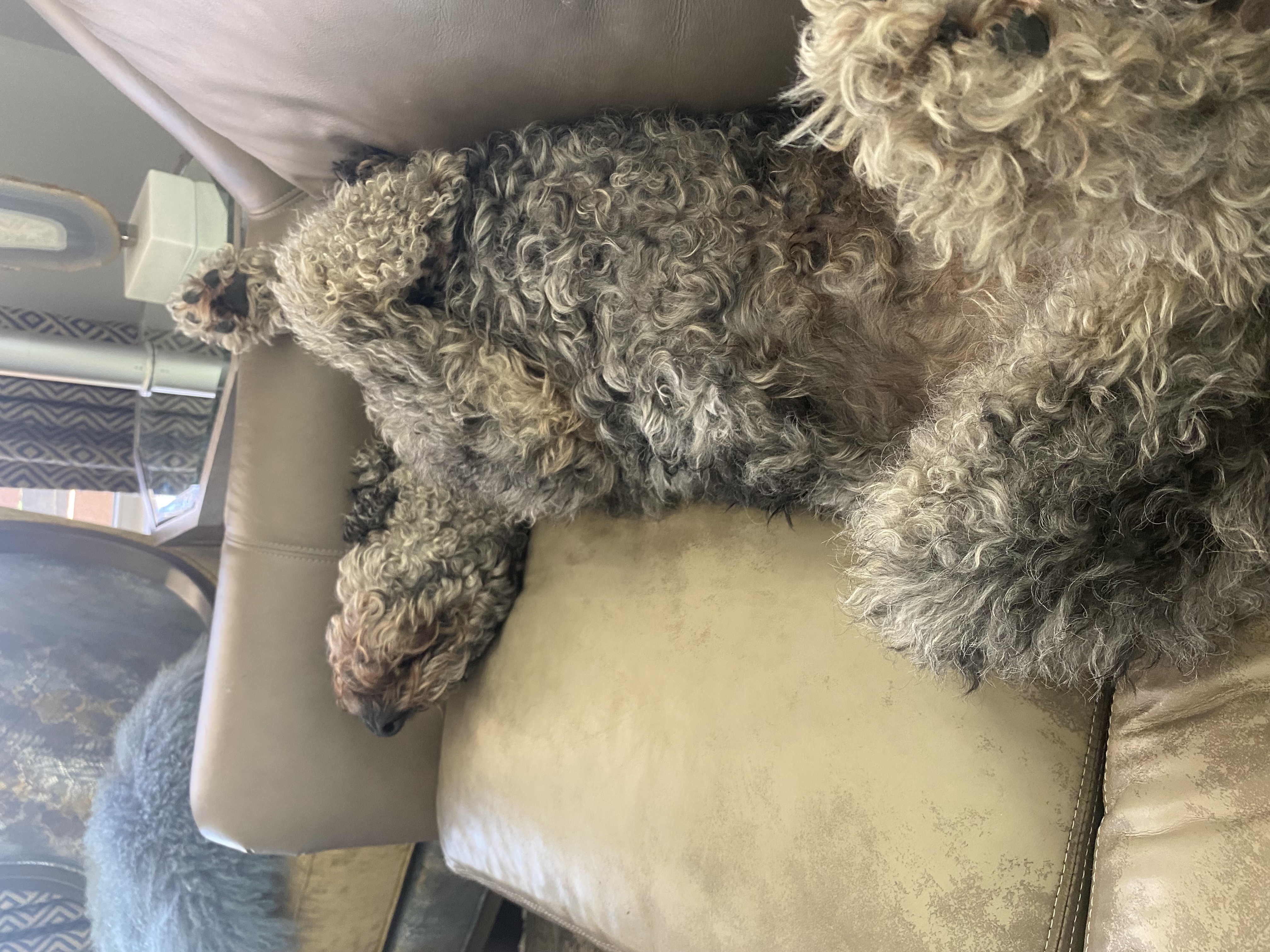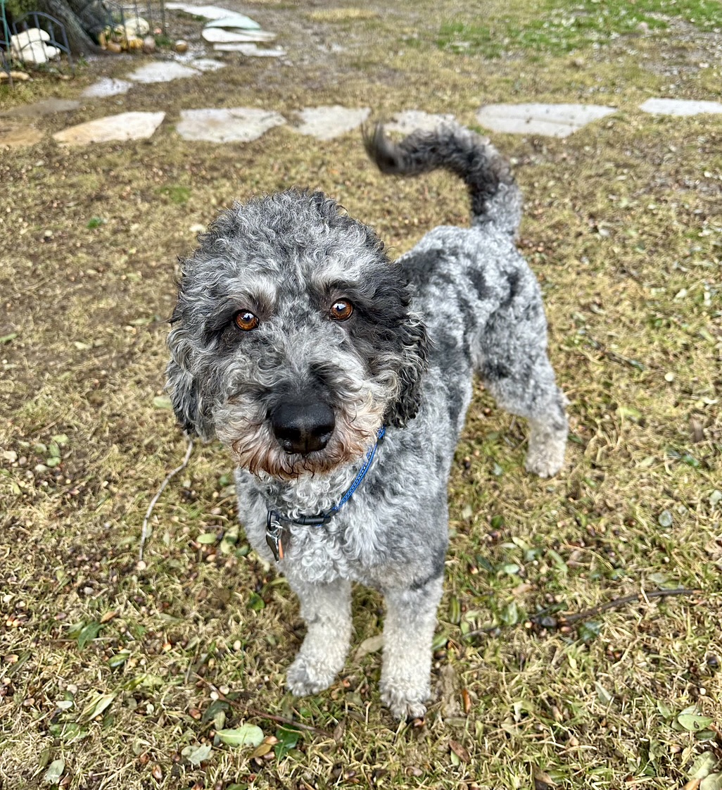 Hello there! I'm Chandler, a delightful 45lb, 3 1/2-year-old male Goldendoodle with a stunning merle coat (black/grey). I've got the longest legs, and I'm all about spreading joy! My foster mom says I'm the happiest, goofiest lap dog she's ever met. You'll often find me on the couch, as close to her face as possible, showering her with kisses and affection.