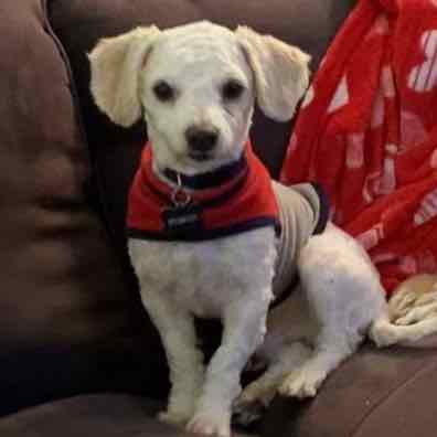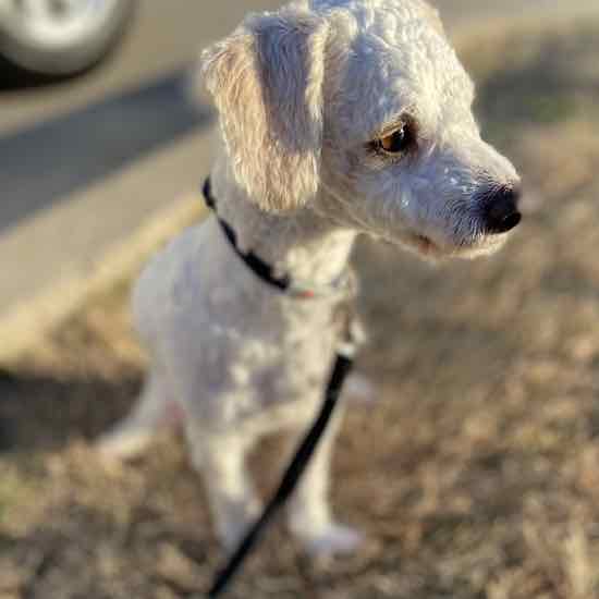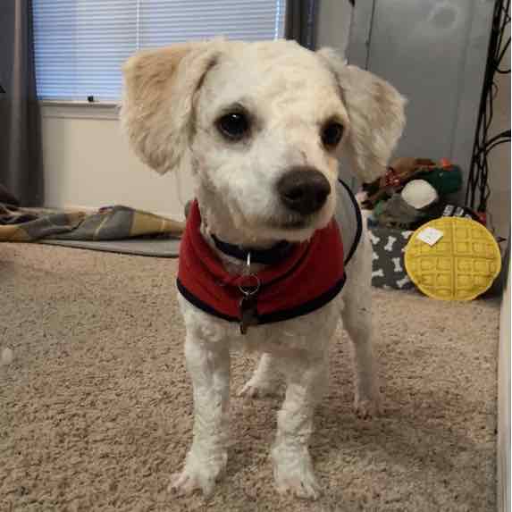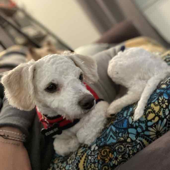 Hi! I’m Charlie and as you can tell, I love to cuddle. I am a 10-pound, 1+ year-old Adoradoodle! I have attached myself to my “little” foster mom. She’s about 12 in hooman years and man do I love it when she kisses me and carries me around. She even has this carrier that she takes me in — it is HEAVEN. And guess where I get to sleep at night? In bed with her! I stay right there at her feet all night and then I wake her up in the morning with lots of kisses.