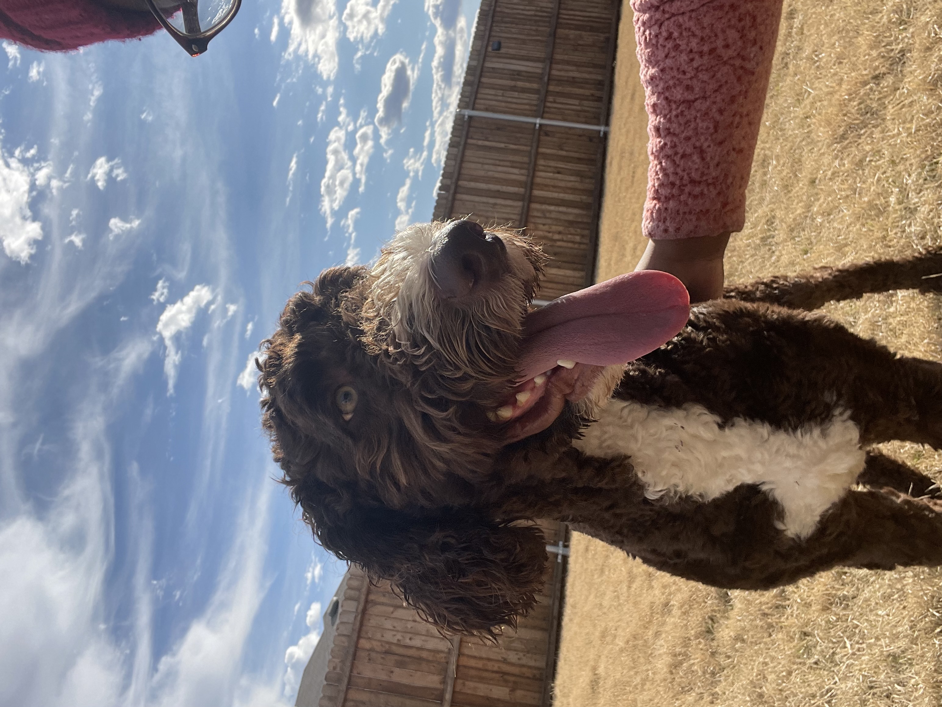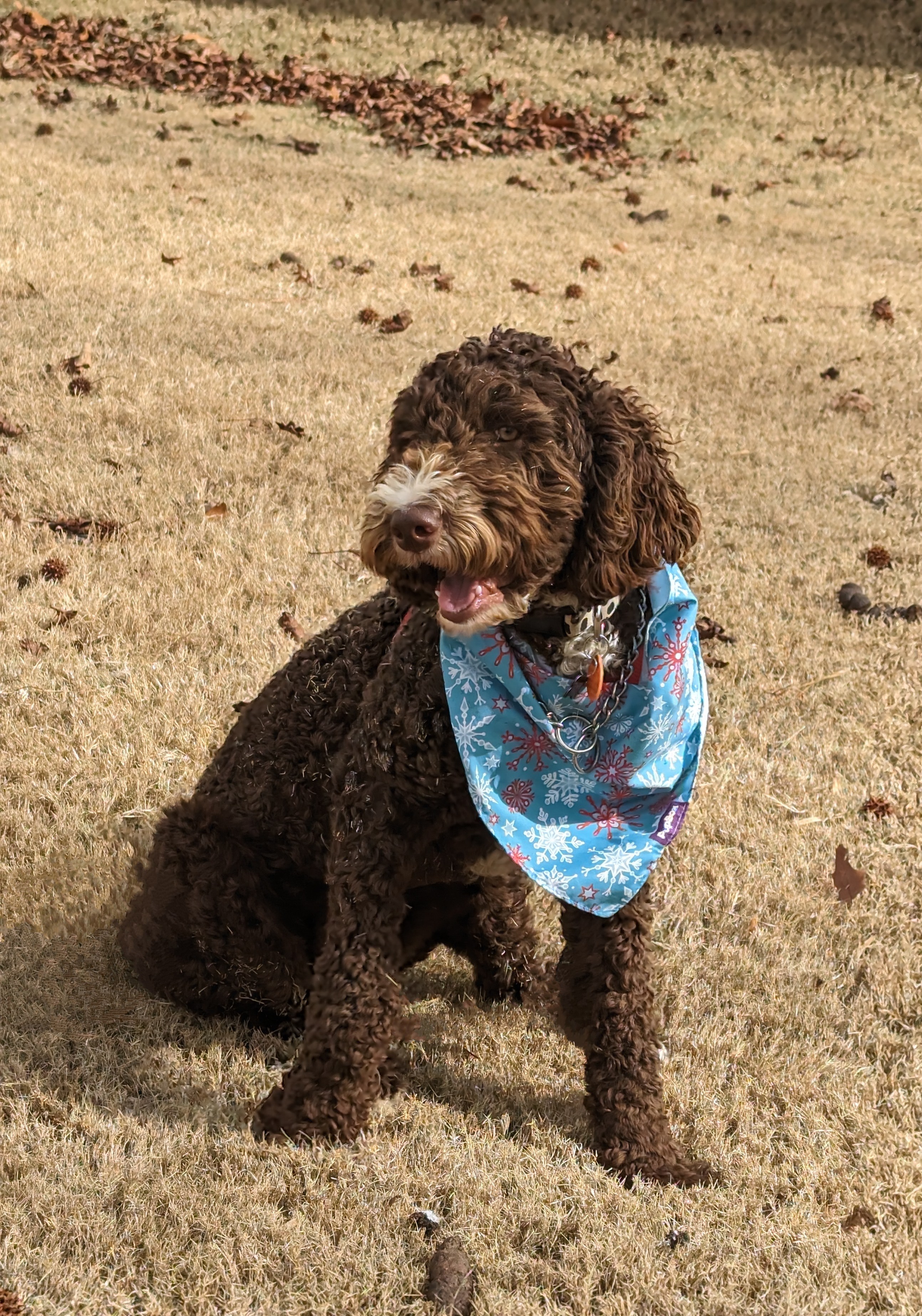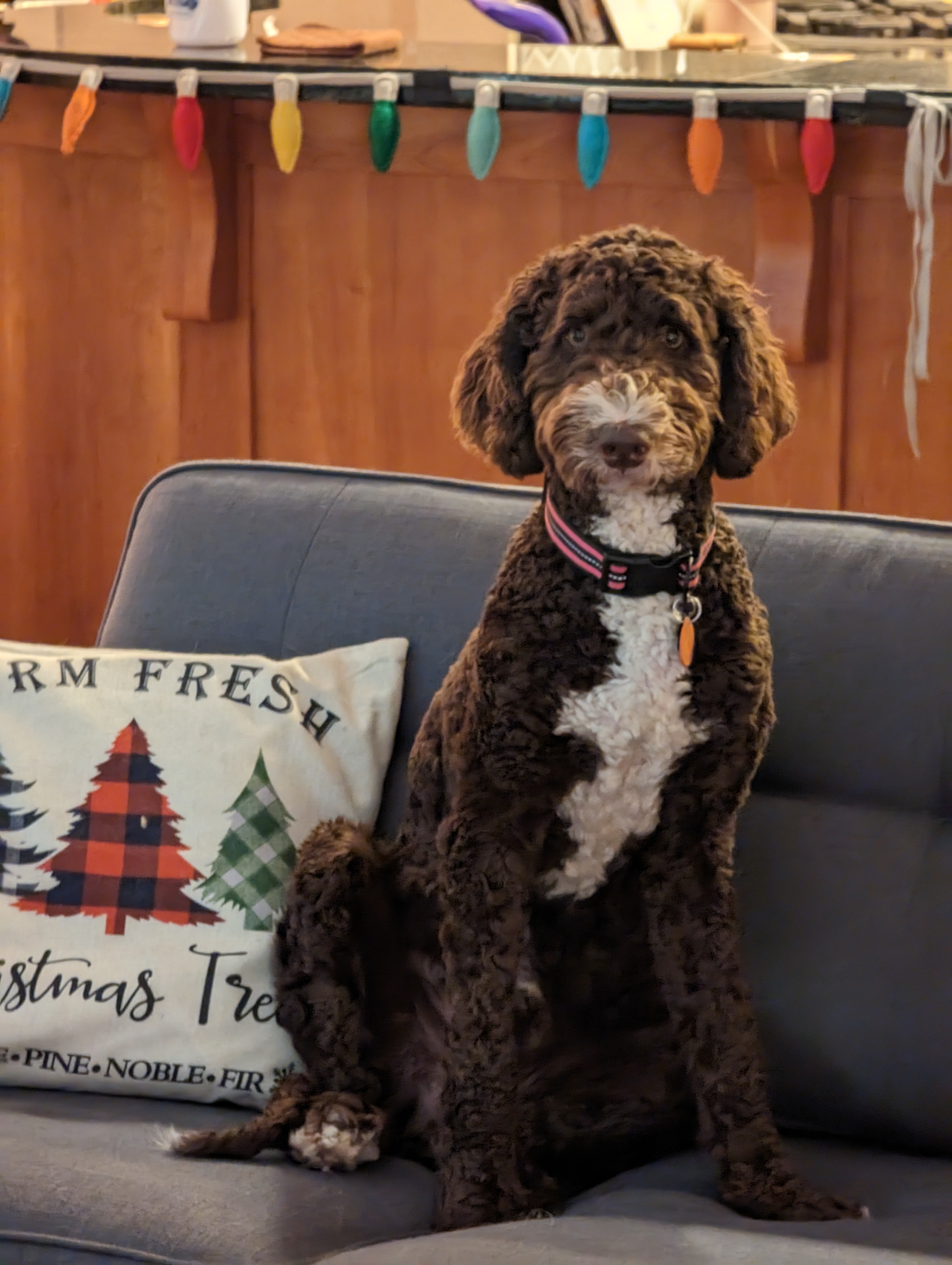 Happy New Year! My name is Chevy and I'm a 45lb, 9 month old Male Sheepadoodle. Although I was groomed to get rid of my mats, my new fur is chocolate in color, very soft and growing out in tight curls, meaning I will likely shed very little.