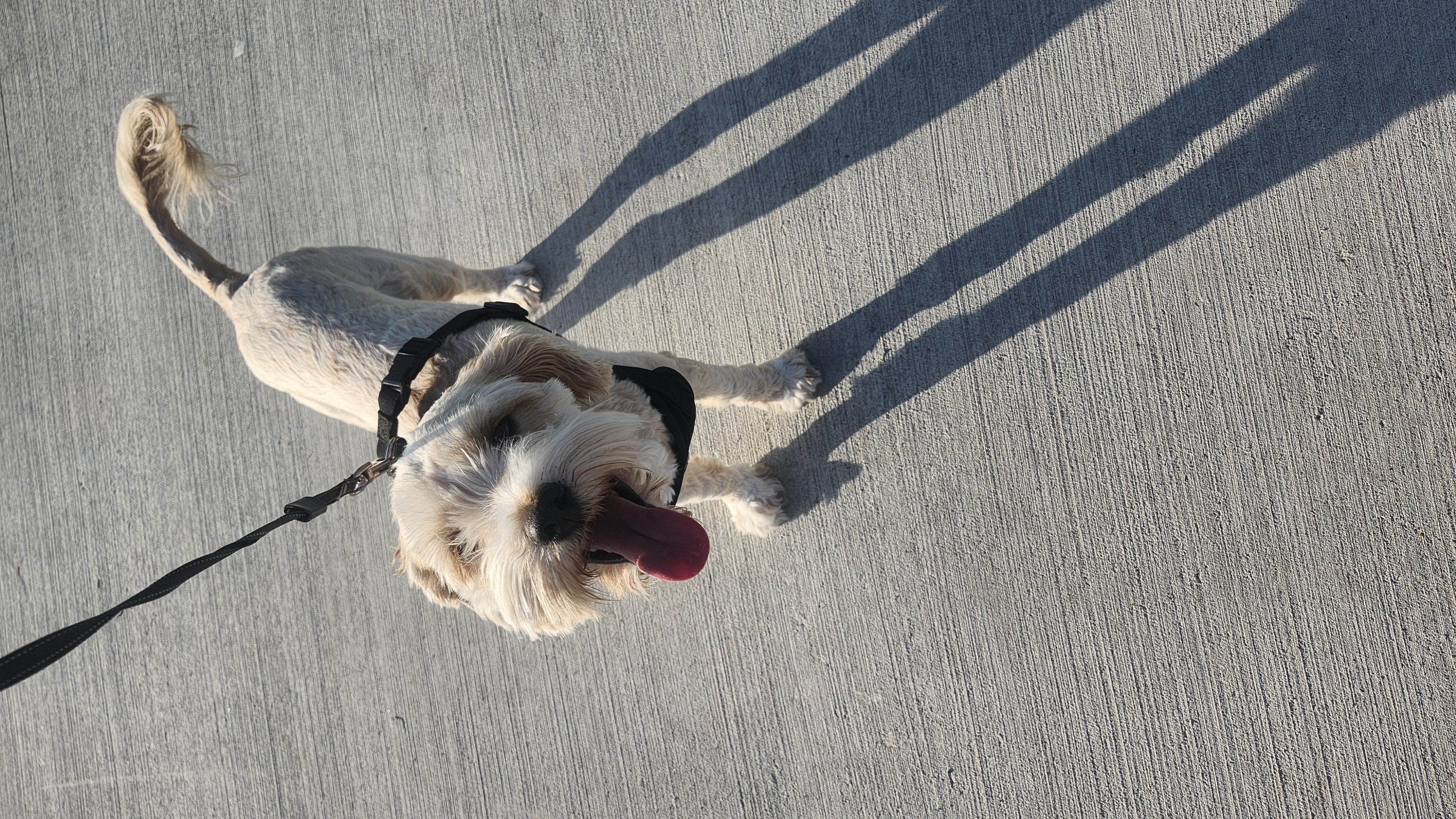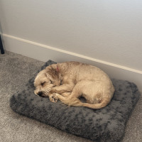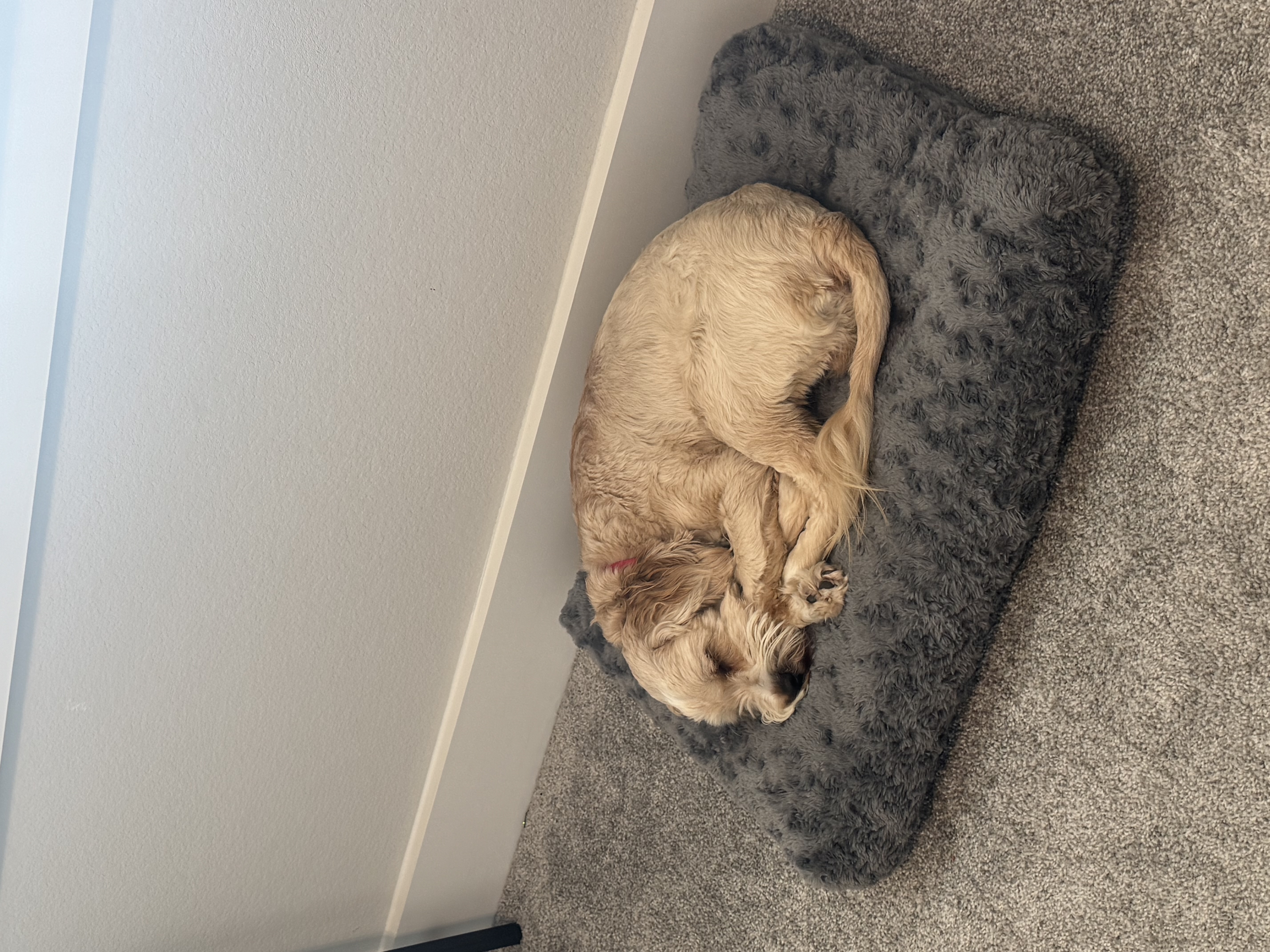 I wake up with my foster mom (early on weekdays, a little later on weekends) and start my day with a quick backyard potty break. I love going along for the school drop-off run, then it’s breakfast time and work-from-home snuggles. In the afternoons, I enjoy backyard playtime followed by a nap — I’m a big fan of resting in cozy corners. Evenings are the best: more play, a walk in the park, dinner, and winding down in my crate for the night. I’m a peaceful little guy with a very sweet routine.
