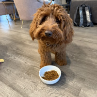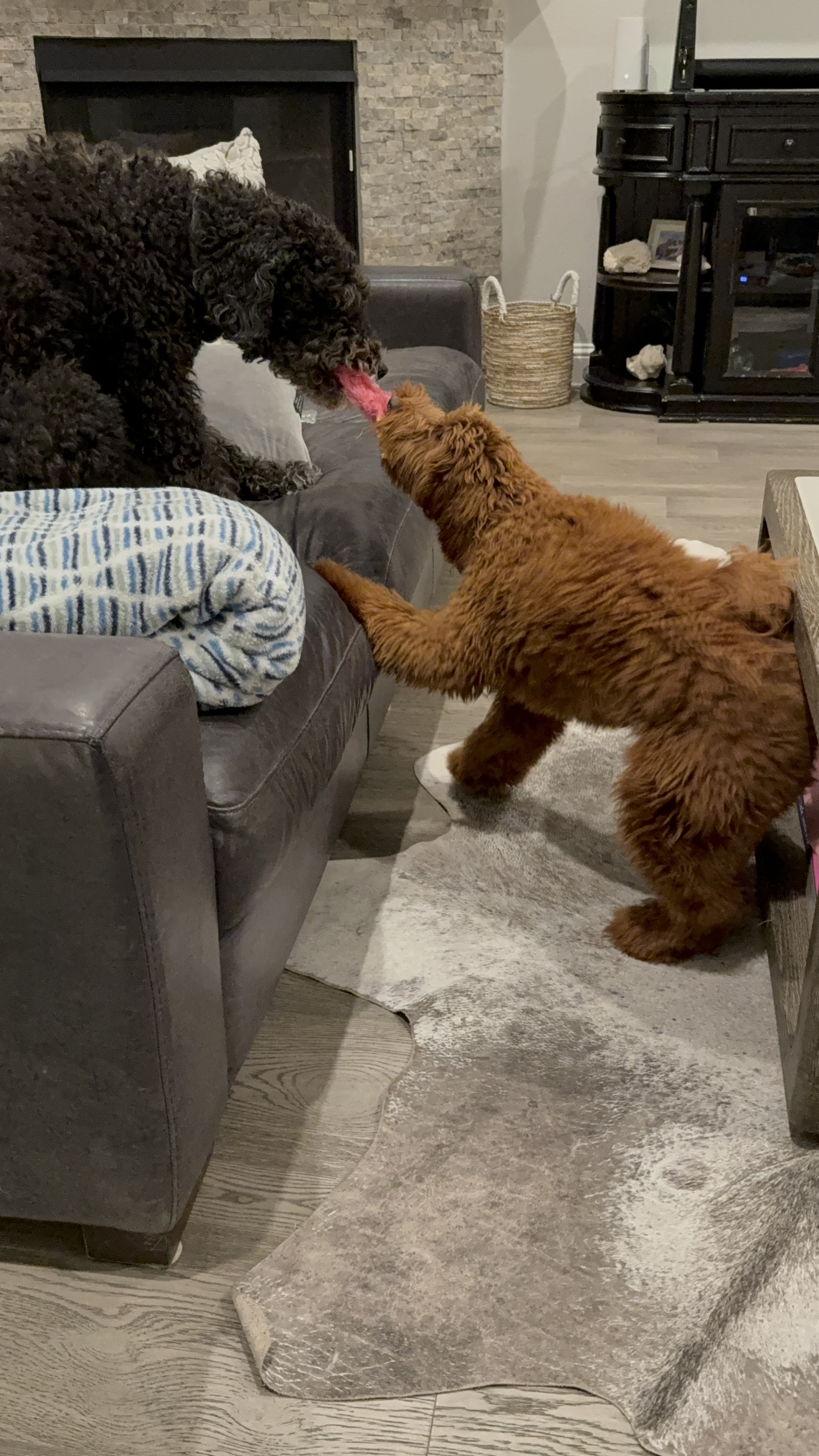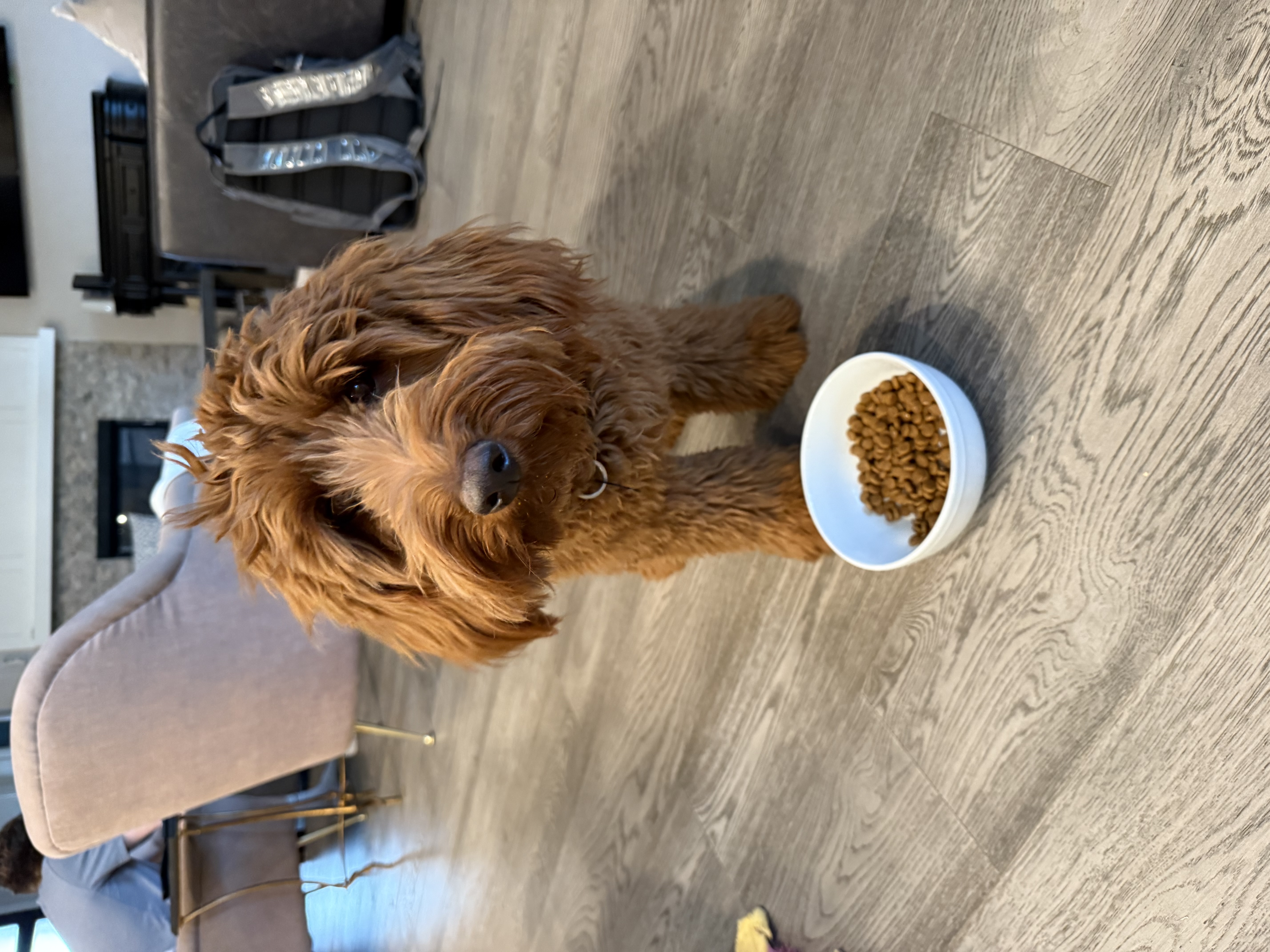 I wake up when the first person in the house is up and going. Adult or kid, someone lets me out of my crate to potty outside and eat my breakfast! I’m more of a grazer, so sometimes I wait and eat a little later. I love to greet all the humans when they wake. I love to play with toys, my midday nap, and a nice after dinner walk. The highlight of my day is snuggling my humans and playing ball!