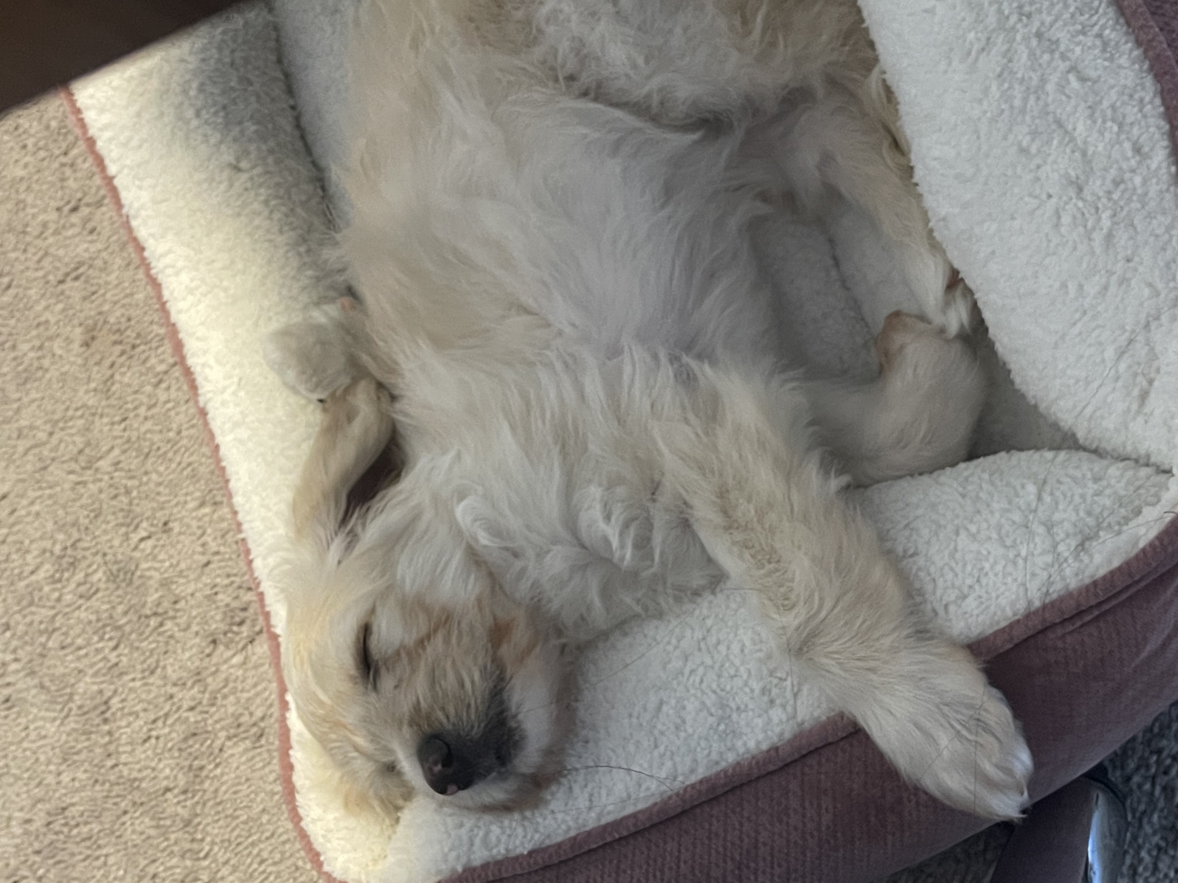 My days are full of fun and snuggles—I wake up around 7:30am, head outside for potty and play, then settle in for breakfast and a nap. I keep this happy little routine going all day long, with plenty of cuddles in between. I sleep through the night in my playpen with my sister, and nothing beats the excitement of seeing my foster mom in the morning when the whole adventure starts again.