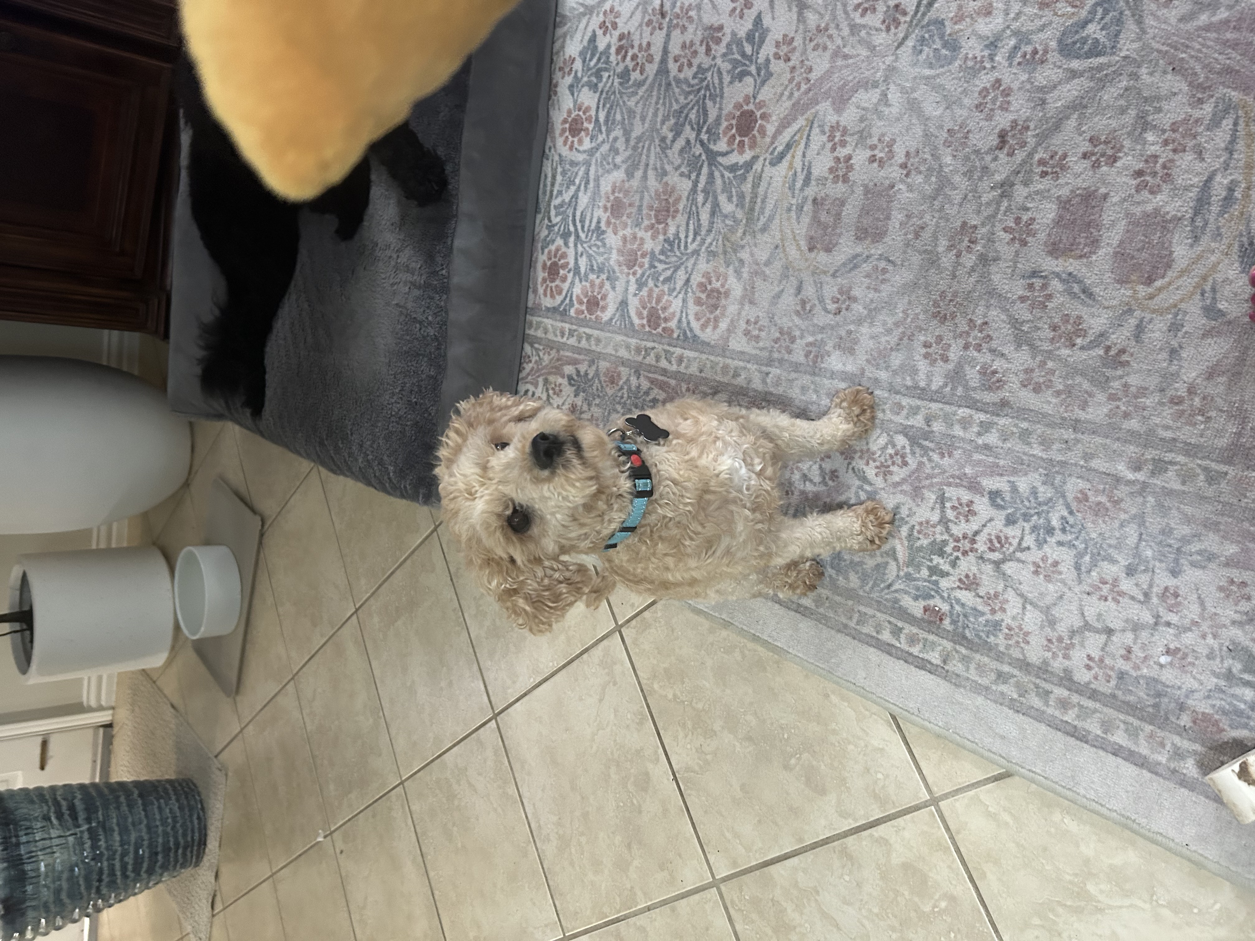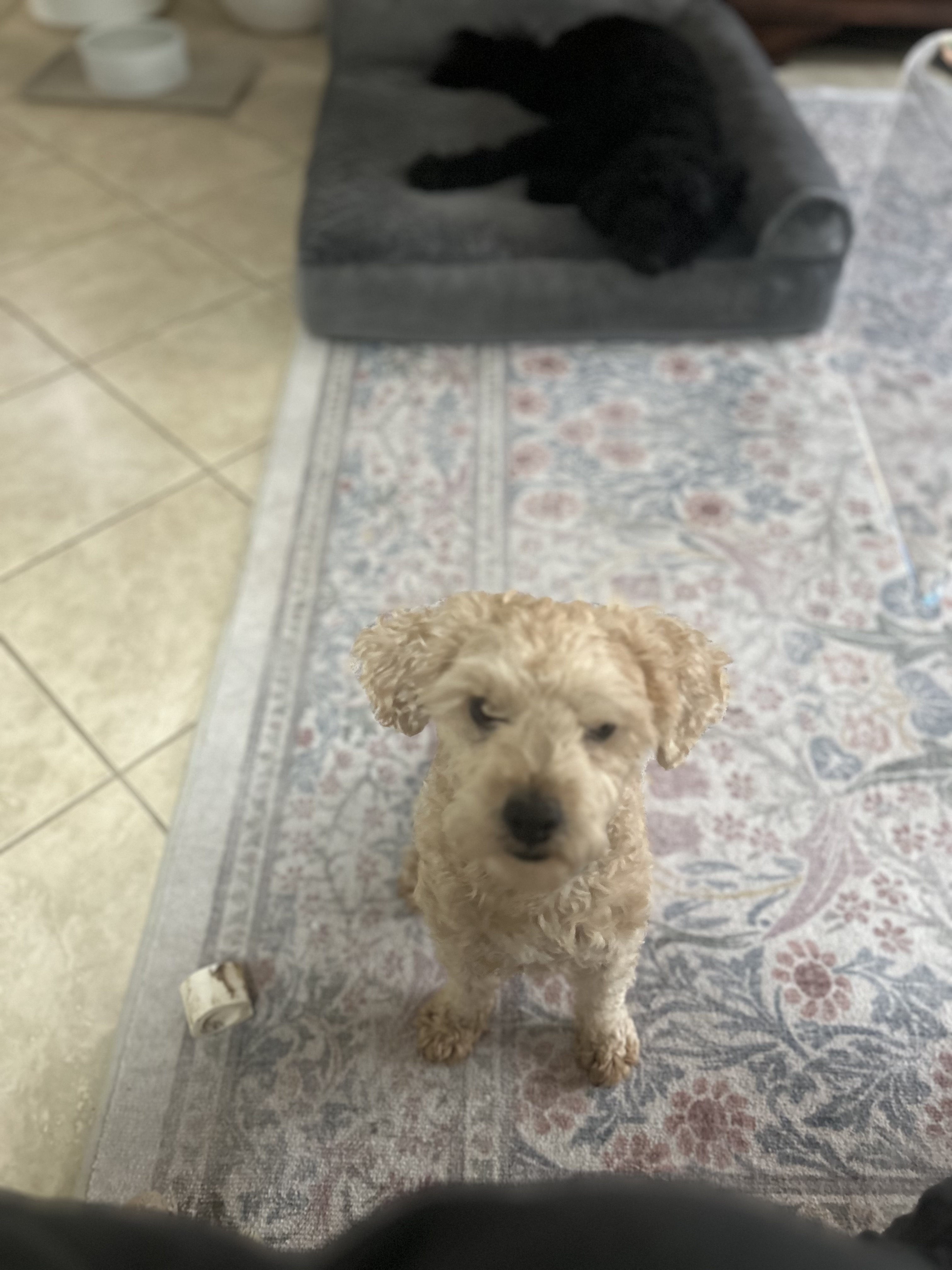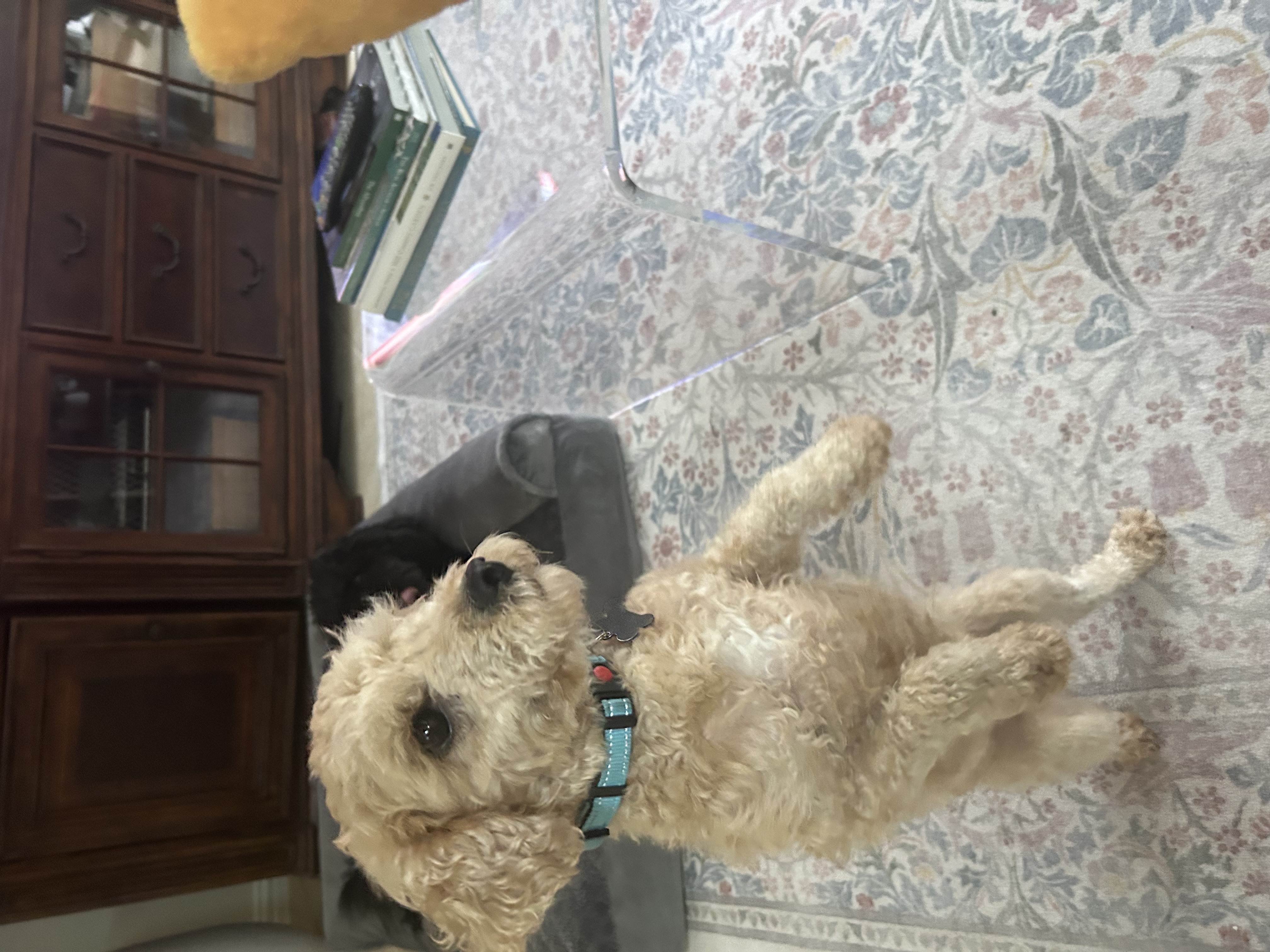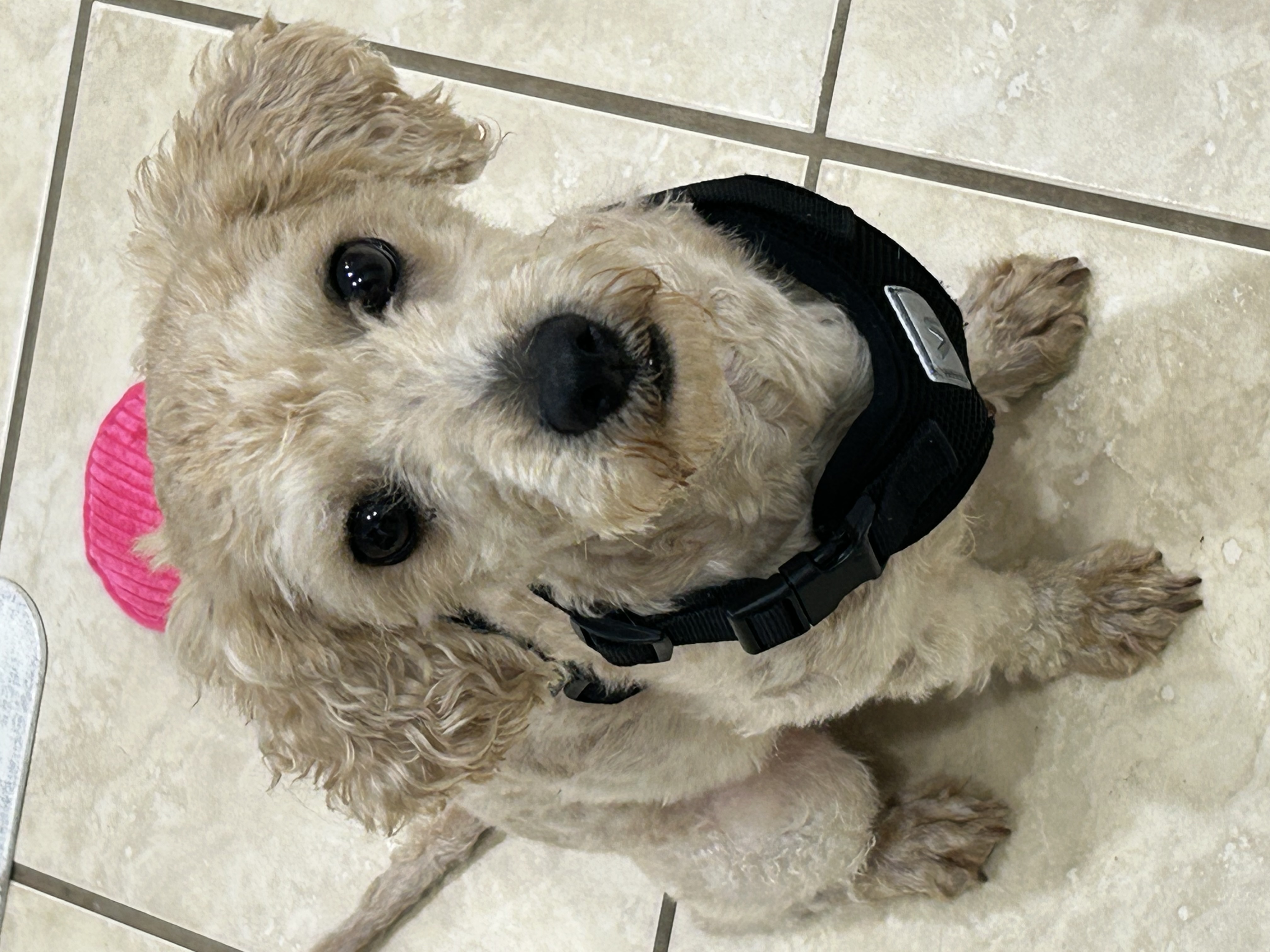 I start my day around 6:30 a.m. with a potty break (only if my humans come too!), followed by breakfast and another trip outside. I go out a few times during the day, enjoy a walk, and have dinner at 6 p.m. Bedtime is around 10 p.m., usually curled up next to one of my humans. I’m not a fan of the crate, but I’ll sometimes explore it if the door’s open.