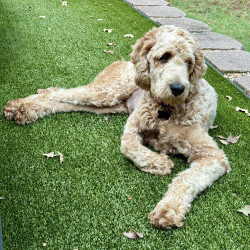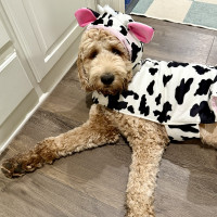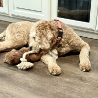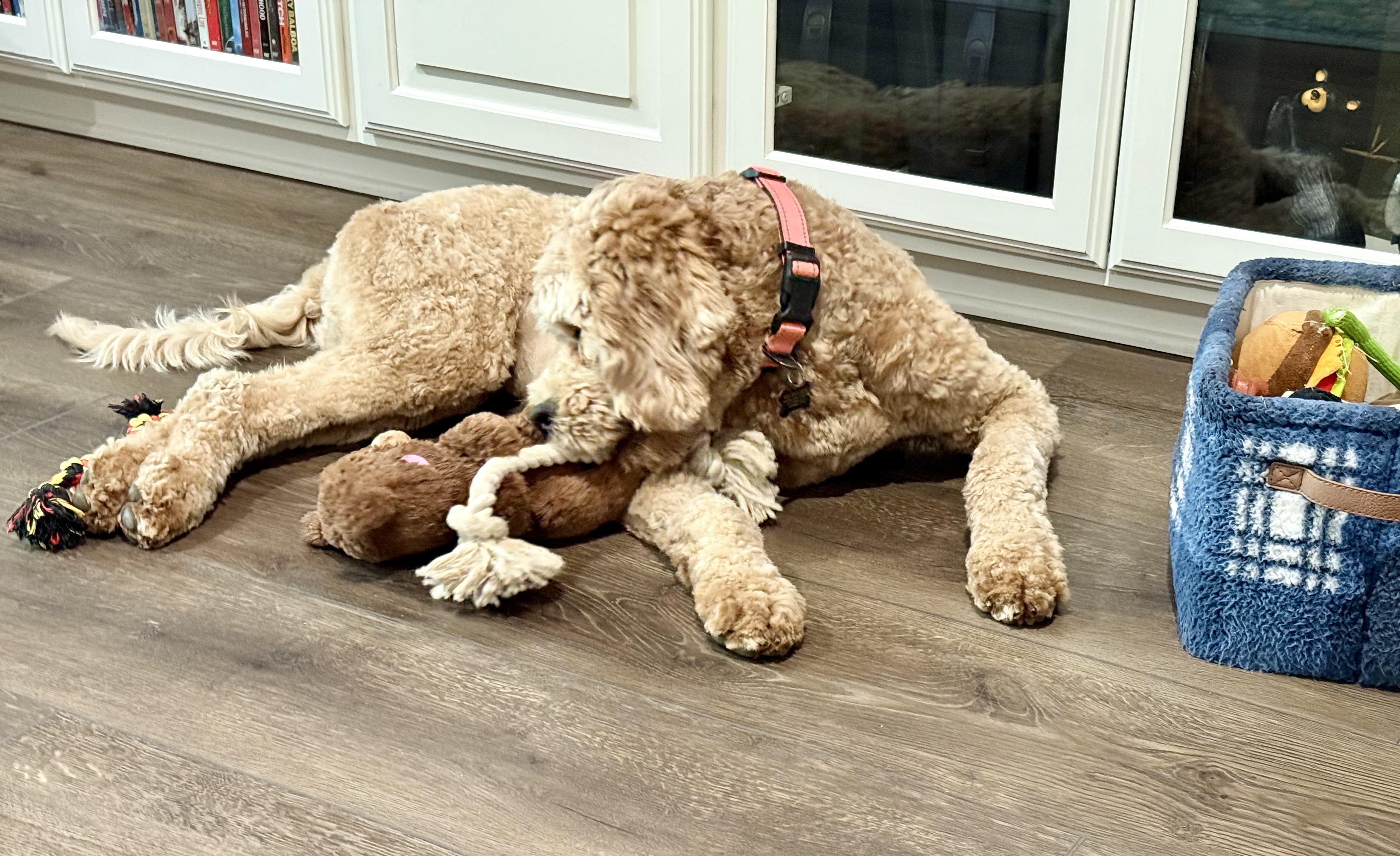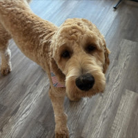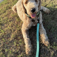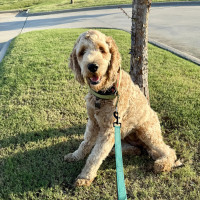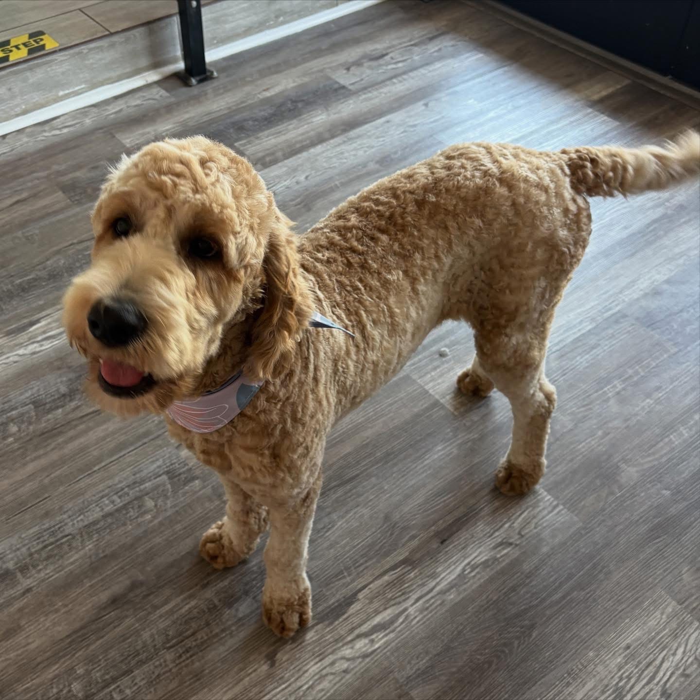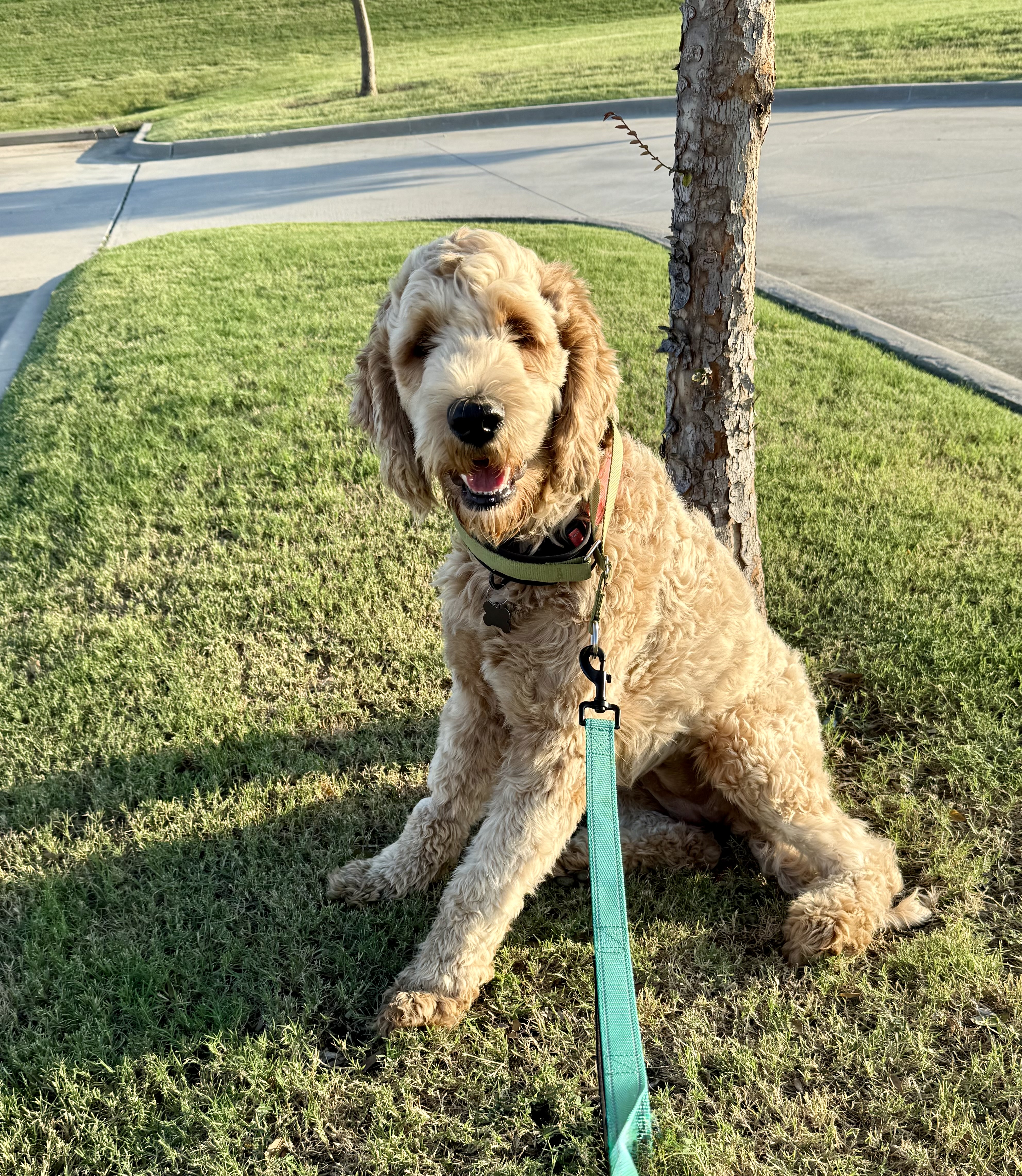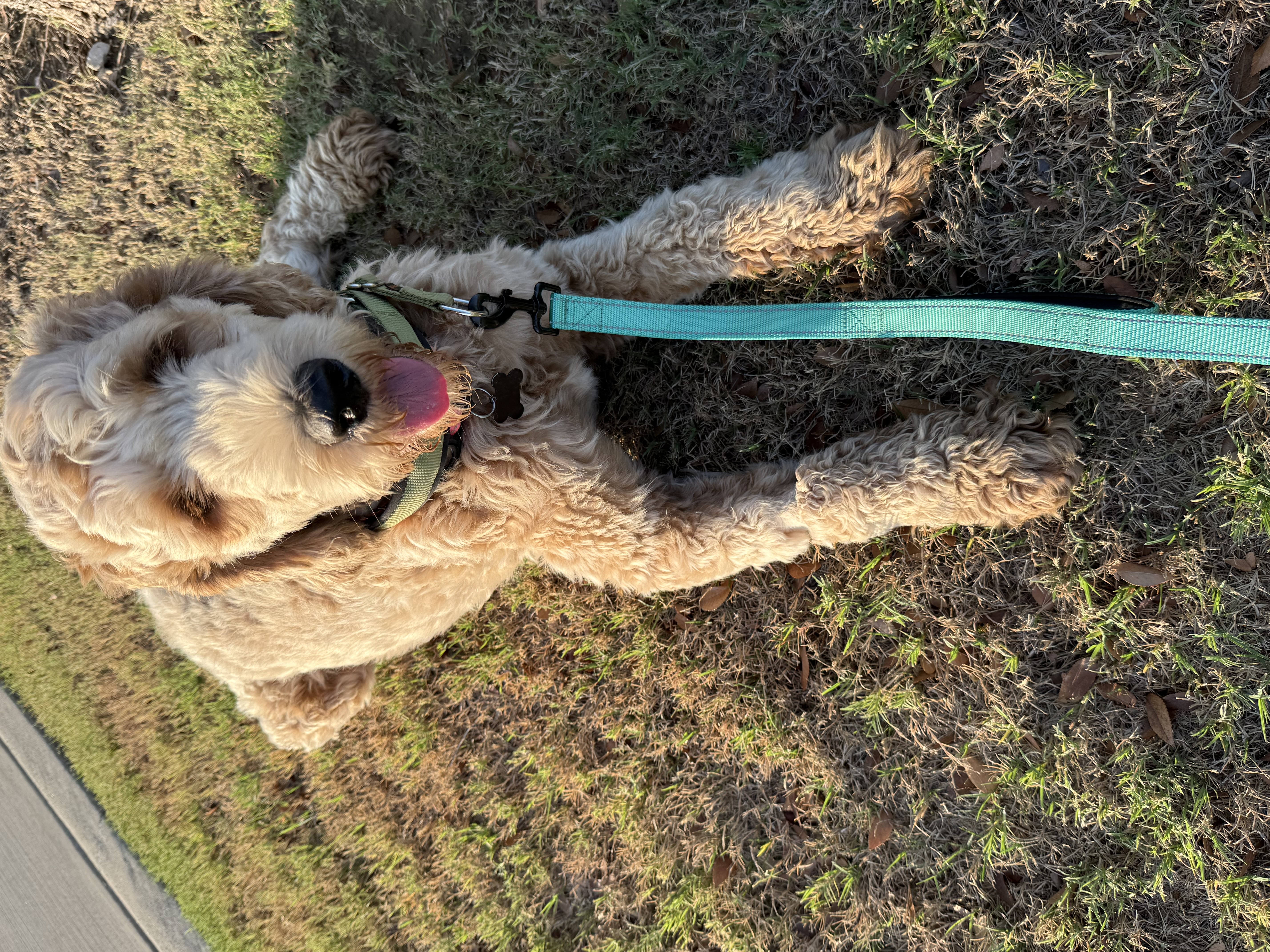 I’m still young and figuring out a few things—sometimes I get a little mouthy when I’m excited, and I can pull on the leash when adventure calls—but I’m a quick learner who responds well to gentle reminders. Because I’ve got a curious spirit and a knack for finding tiny escape routes, I’ll need a secure, tall fence to keep me safe during backyard playtime. And like most doodles, I need regular grooming, but I don’t mind being brushed and pampered one bit.