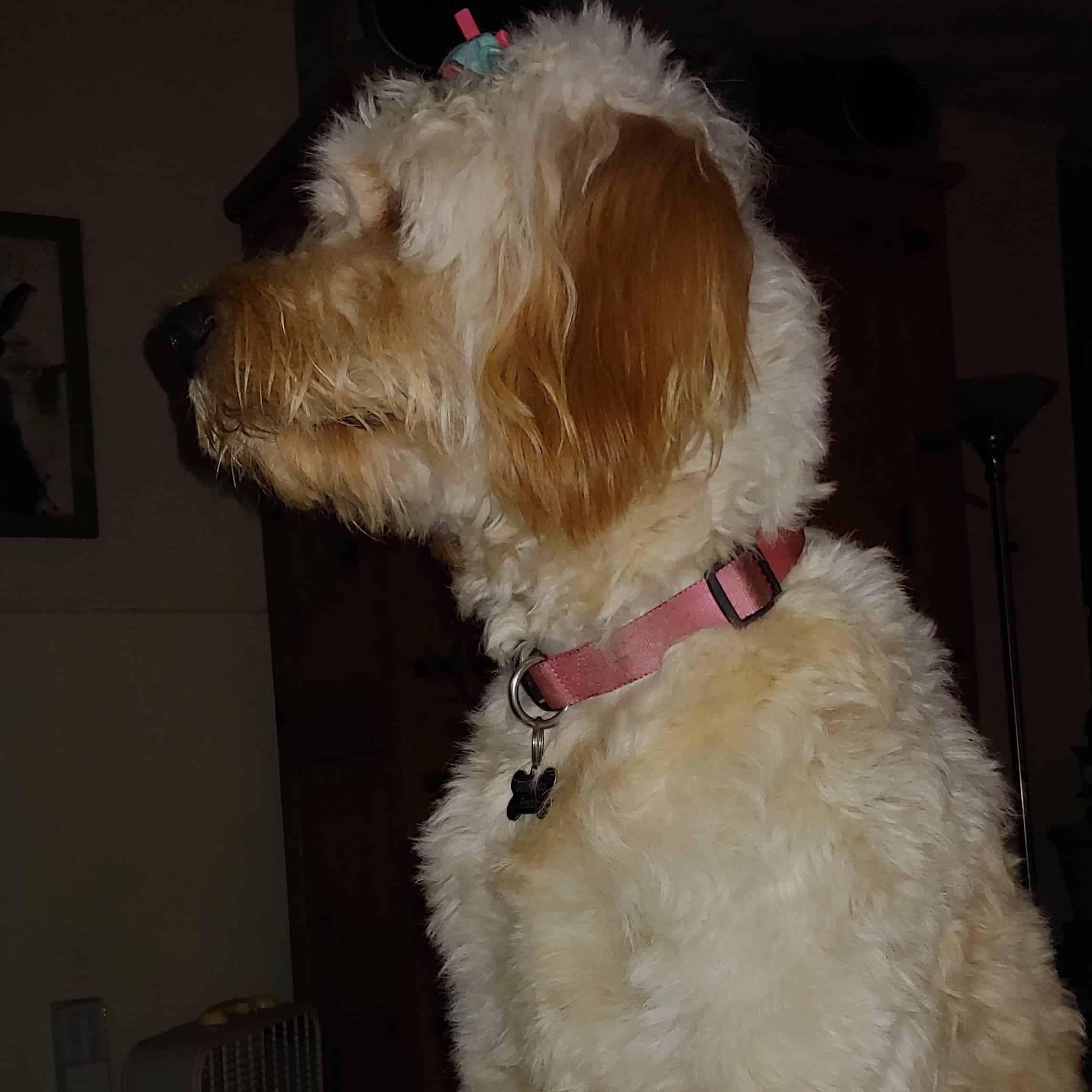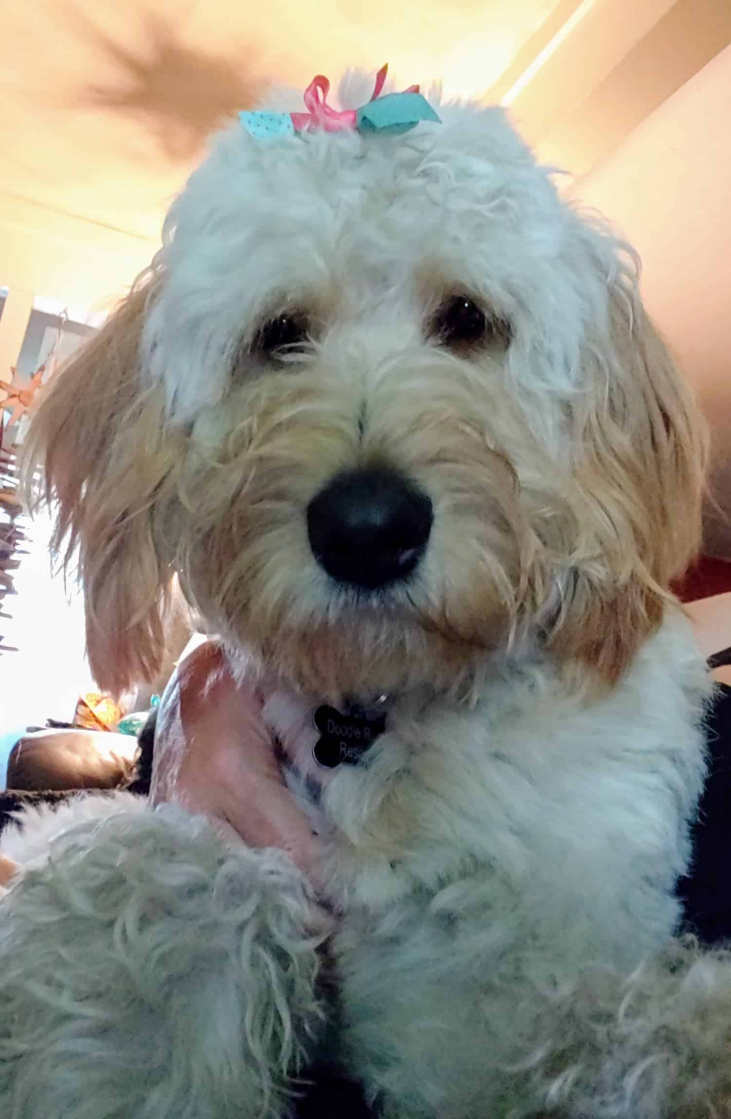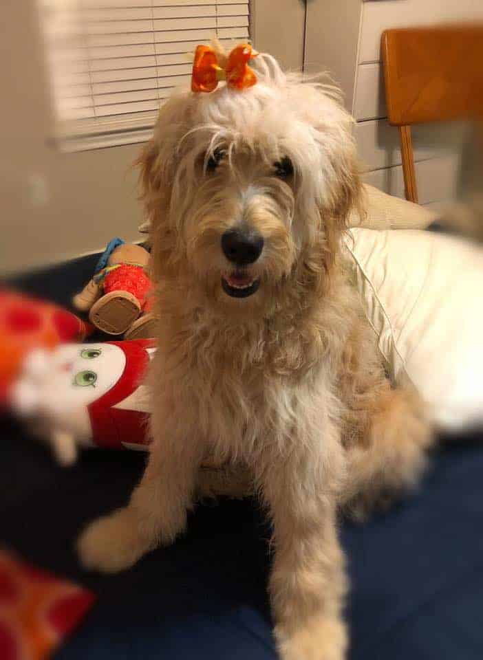 Hi! My name is Cookie and I am a very happy girl! I am a 17-month-old, 60-pound Goldendoodle, I love getting attention and being played with. I don't have very good manners, but my sweetness more that makes up for that. I am learning to not jump and not to be mouthy. I don't have a mean bone in my body, I just want to make sure you know I am waiting for some lovin. My foster mom says we are working on my basic skills, but I think she is really playing with me!