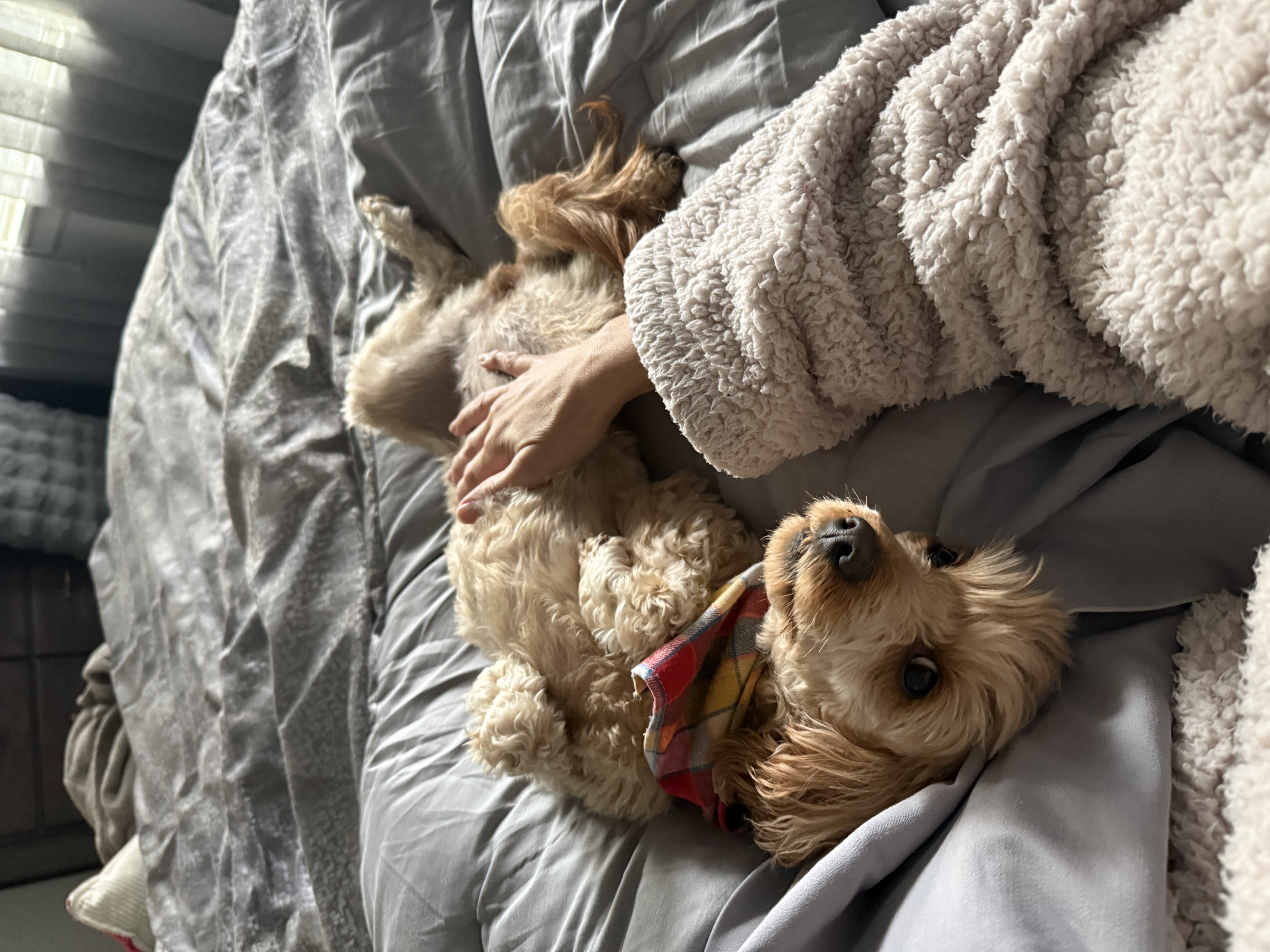 At night, I love to snuggle up in bed right next to my foster mom, sleeping soundly through the night. I can’t resist morning stretches, snuggles, and kisses, and I just adore gazing into her eyes.