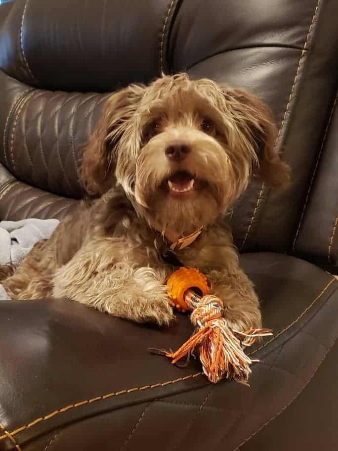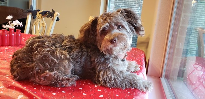 Hello! My name is Dior and I'm the cutest little teddy bear around! I'm a 9-month-old dachshund poodle mix, or a Doxie-poo! I don't shed, and will need a weekly brush to keep my gorgeous wavy fur mat-free. I'll also occasionally need a visit to the groomer for a haircut. I'm just a little lady, coming in just under 10 pounds. And do you know what? Even though I'm little, I have the biggest heart around! I just love to love! I snuggle, cuddle, and give kisses like a pro! I especially love kids- the kind that know how to treat a little dog like me. My two legged siblings are the best- they play all my favorite games like throwing my balls and tug-of-war and keep away. I've never shown even a hint of aggression, I'm 100% love-bug! Still, these kids know that while I have the best time playing and just love to snuggle on sitting laps, I wiggle too much to be held by them- they leave that part to the big people. And I've never met a stranger! Every person I meet, big or little, is my new best friend! Oh, and I have the best 4 legged foster sister dog, too! At first I was kind of scared of her- she was sooo big! But then I learned that she's also very gentle with little pups, so now she's also my new best friend! We occasionally do the zoomies together, but she mostly sleeps and that's just fine with me. I met some guinea pigs- they're so funny! I had to give one a kiss. I haven't met a cat, but hopefully if I do they would play, too! Soo.. I'm still a puppy and sometimes do puppy things. It's still hard for me to know which toys are mine and which belong to the kids, but I respond to 'no' pretty well! Also, I've never destroyed any of my toys! I'm not a big chewer and I don't bite, which is pretty awesome, though sometimes I steal socks. I really like to be up high, and I'm allowed on beds and couches, but for some reason my foster mom doesn't like me on the table??? I'm happy to learn all these new things! And because I'm still a puppy, I have to go potty often. I need a family that has someone home to be with me. Not only because I just loooove to follow my people around for snuggles and play, but I need to be let out regularly. It's true; I've had a couple of accidents here, but I know where I'm supposed to potty and as long as we work together I do great! Even though I'm crate trained, I'd much rather run errands with you, and sleep with you! I do so well sleeping at the end of the bed or next to you all night long. The last thing I'm working on learning is to not bark or whine when I don't get what I want. I'm not too yappy, but I will occasionally use my voice when I'm excited or frustrated. My foster mom says I have the best personality, and with the right help, I'll grow out of all these puppy things and be the best little lady ever! So, are you the right family for me? Are you ready for an incredibly affectionate and playful pup to be part of your life fur-ever?? Then I'm your girl!