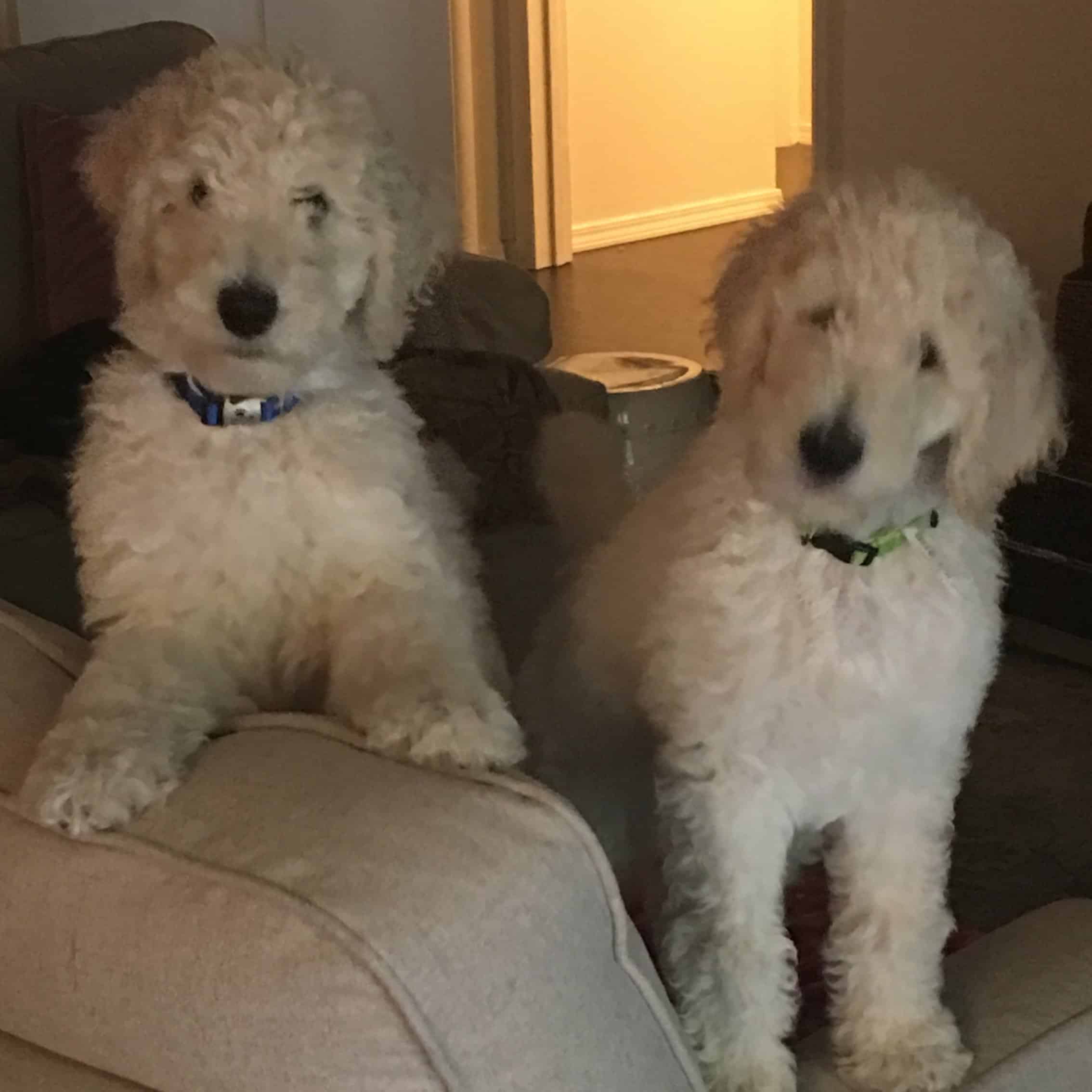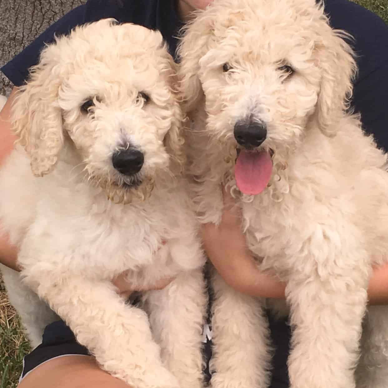 Hello! Our names are Dutch and Quill. We are 12-week-old, male Standard Poodle Puppies. Our foster family says we are perfect in every way! We are so similar they are having trouble telling us apart! We are soft and cuddly but love to wrestle and play, with each other and with our foster doggy siblings. They tell us we are very smart too. We already understand what to do when they take us outside and say “go potty” but we are still learning not to “go” inside. I’m sure we will learn fast! We are working on knowing what we are allowed to chew but those shoes sure are tempting. We are also learning not to nip at ankles and calves when trying to play with our foster humans.