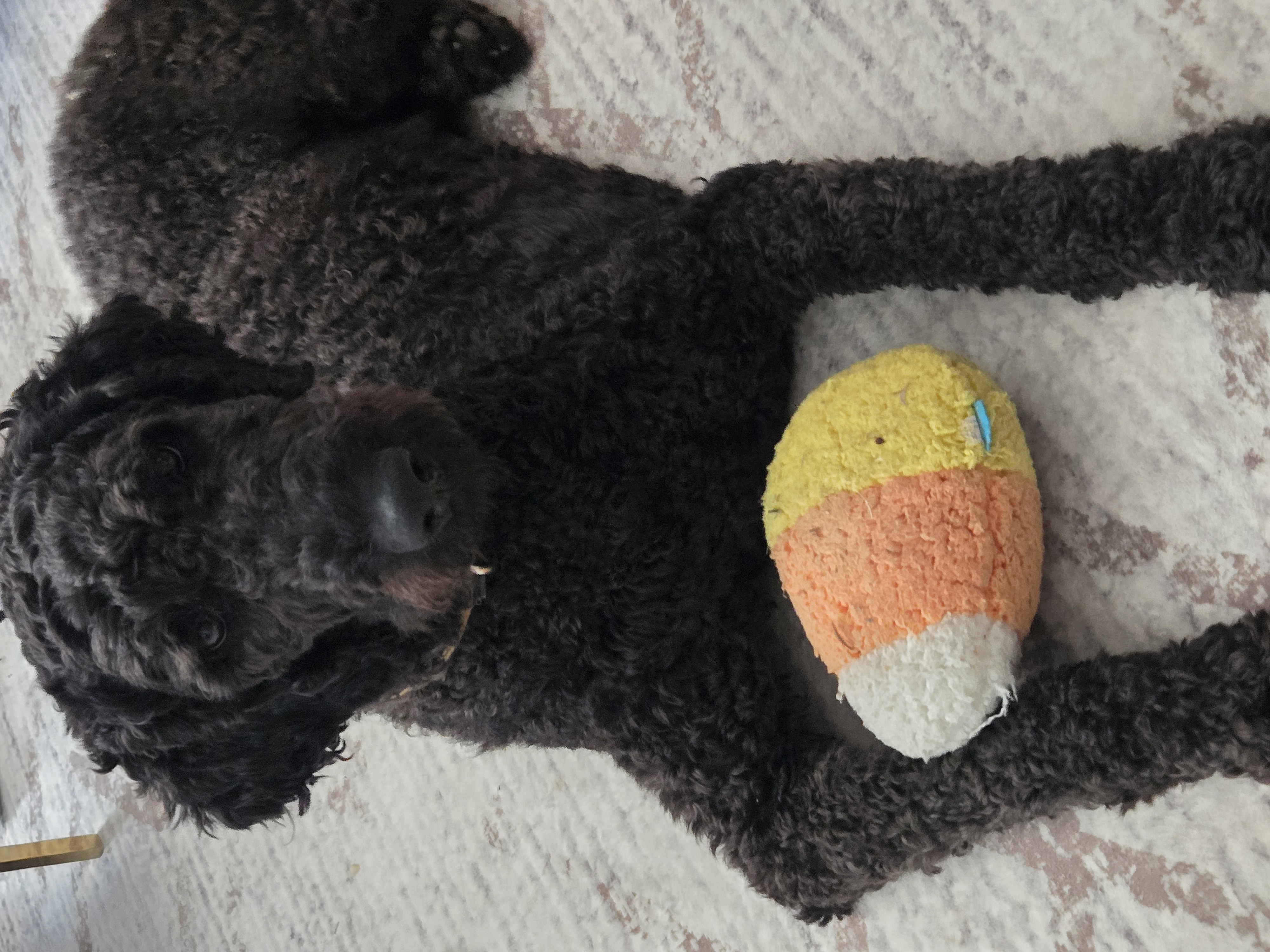 I’m house-trained, frequent potty breaks during the day are a plus since I drink LOTS of water. I sleep in my crate with the gate open & I love a good snuggle if you invite me in bed ☺️. I sleep wonderfully through the night & love being near my people as much as possible! My foster mom works from home so I lounge nearby for the occasional head scratch or belly rub.