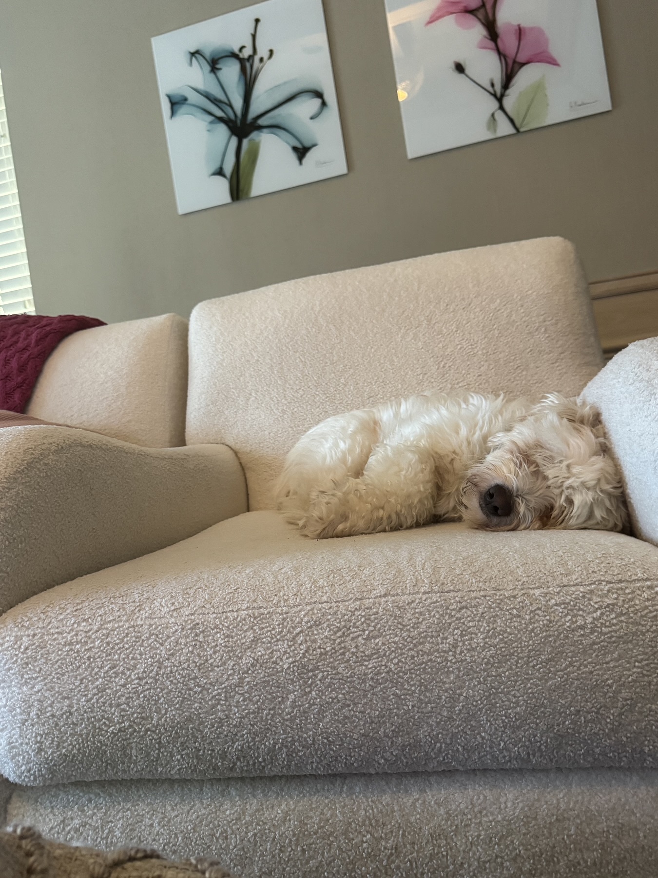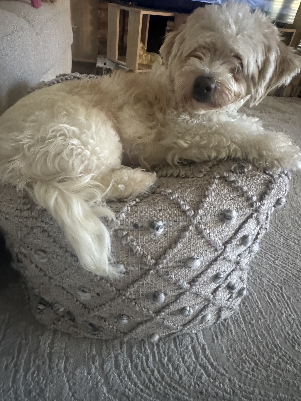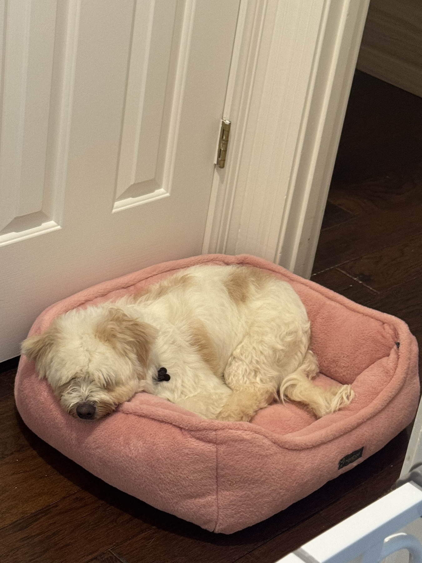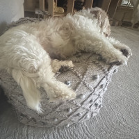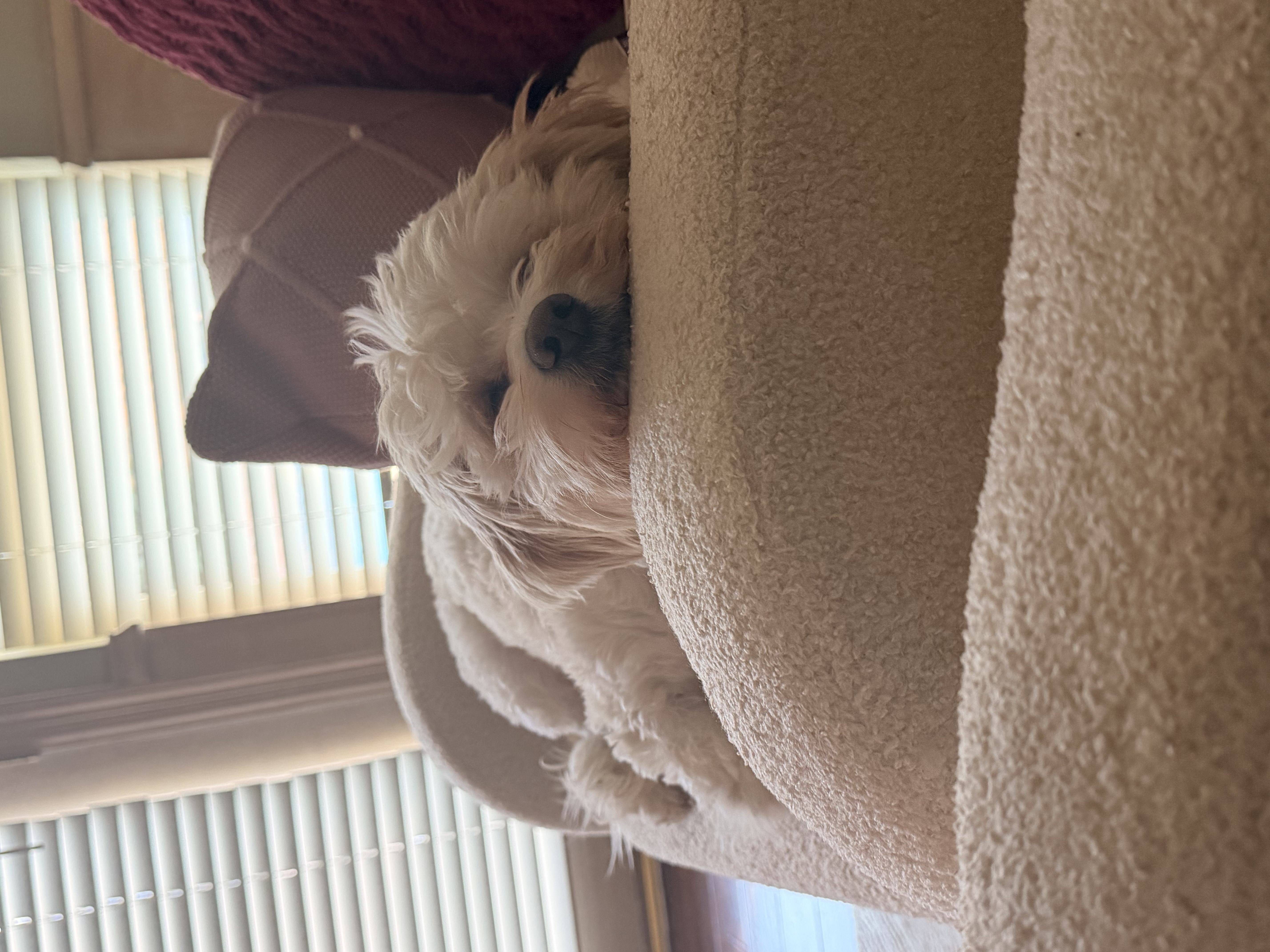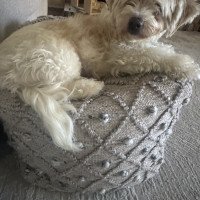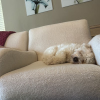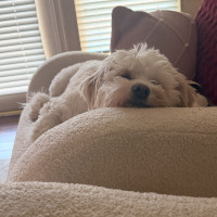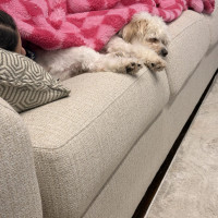 My days are simple and cozy. I start the morning with a walk around 7:30, then I’m happy resting nearby while you work, mixed with a few short walks throughout the day to stretch my legs and explore. I’m not crated and sleep through the night in bed without moving much at all—I just like being close. I can stay home alone for a couple of hours, but I do best when my person is around most of the time, especially someone who works from home and can reassure me that everything is okay.