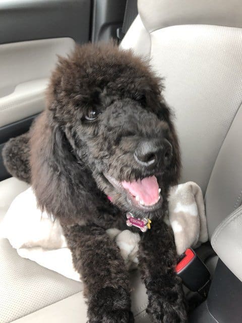 Meet sweet Ebony! This girl is a 5-month old Standard Poodle. She was a shy girl when we first met, but she is becoming more confident and adventurous. Ebony loves to run and play chase. She is a polite toy stealer, she just comes up beside her foster brother and starts to play with his toy and he walks away. She will chew kid toys and shoes, but usually drops them quickly when asked. She loves to snuggle with people, and has been great with my kids (age2 & 7). She goes to her crate when asked, but does expect her treat for doing it! She does bark a little once in, but calms down after a minute. She has met a few dogs out in public and did fine, but does remain a little shy. She’s never met a cat. She’ll just need more practice meeting fellow fur friends. She is learning to walk(prance!) on a leash with encouragement. Potty training is her biggest difficulty, so she’ll need you to be diligent with taking her out and making sure she goes potty outside instead of just playing. Car rides are scary for her, but she is improving at that as well. Ebony is a fun pup looking for a loving active family to help her blossom!