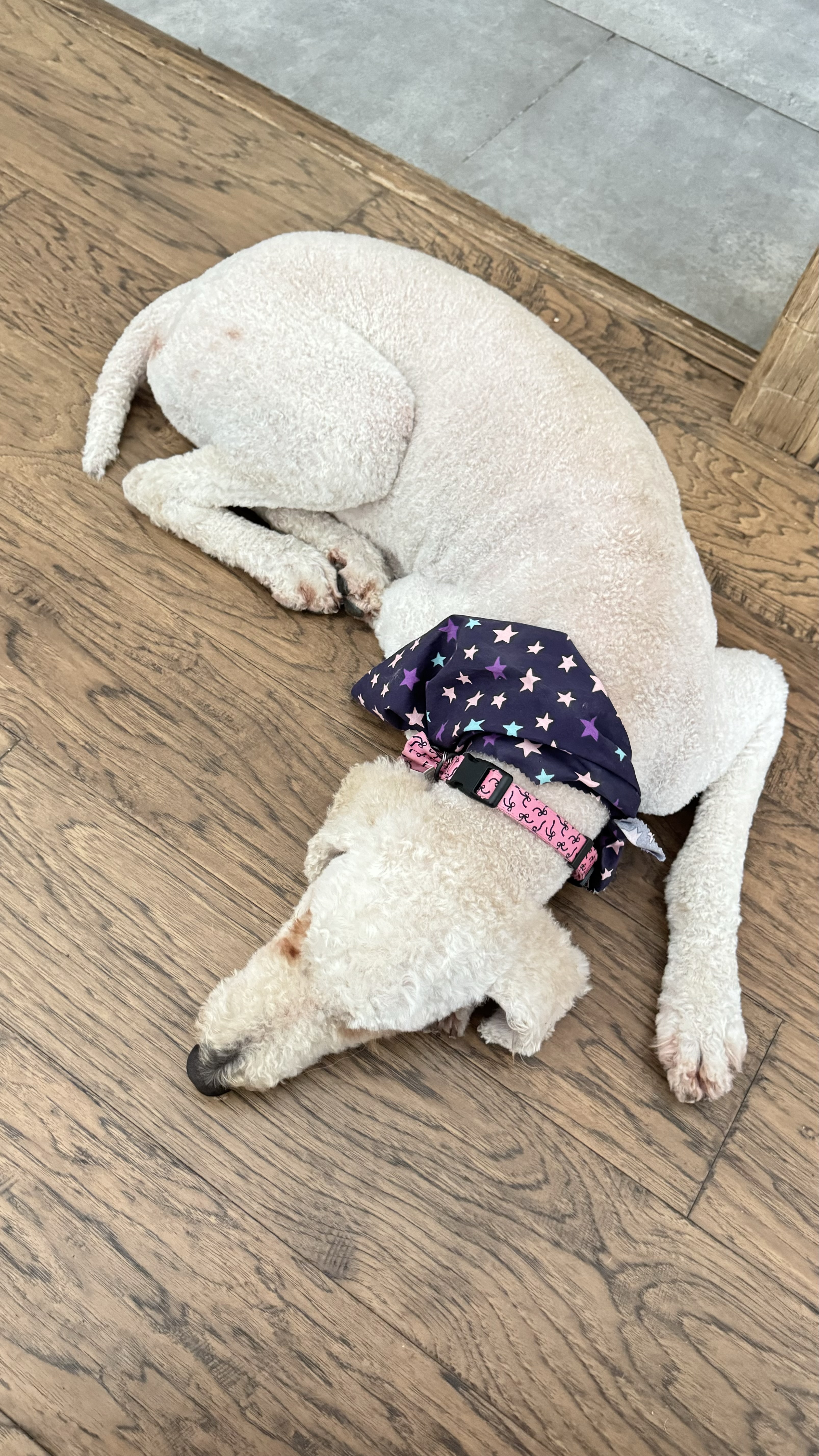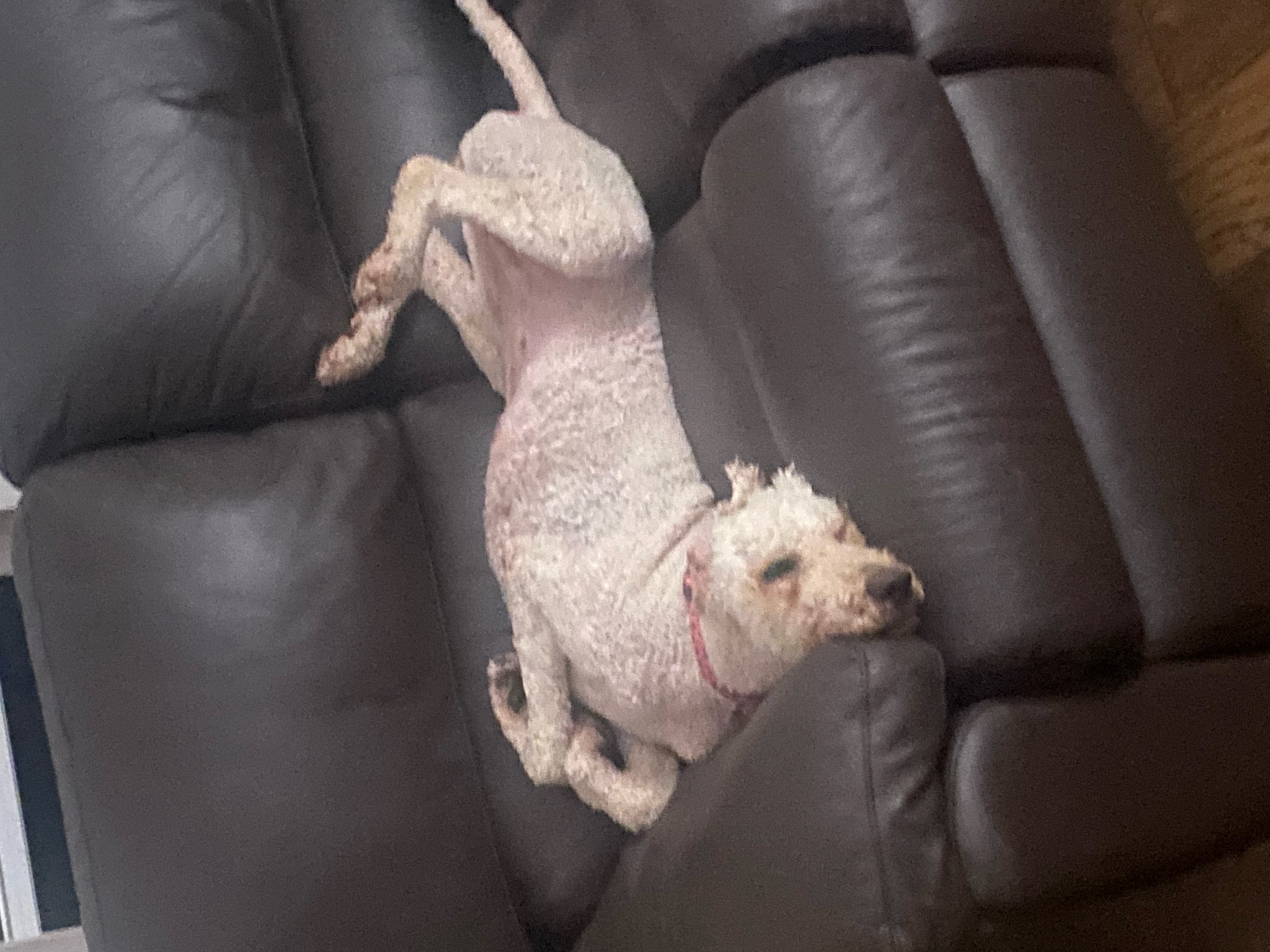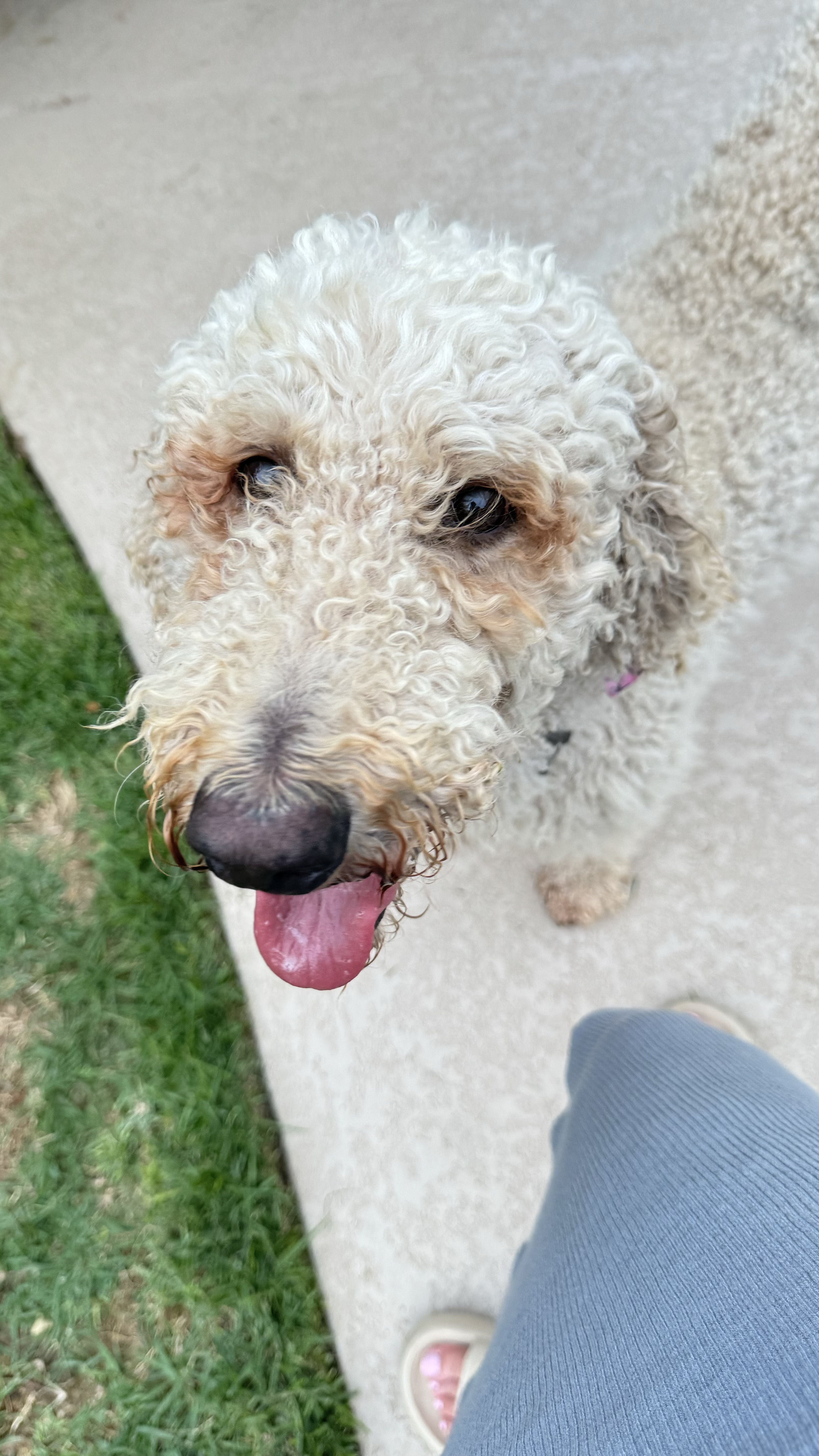 I am very elegant, with an aristocratic personality. I will sit gracefully and cross my front paws for extra cuteness, like most poodles do. I have tight white curls and I don’t shed. Due to excessive matting when I was found, I have had to get a short hair cut but my hair is growing back already. I have grooming requirements just like any other doodle and I do very well on the grooming table.