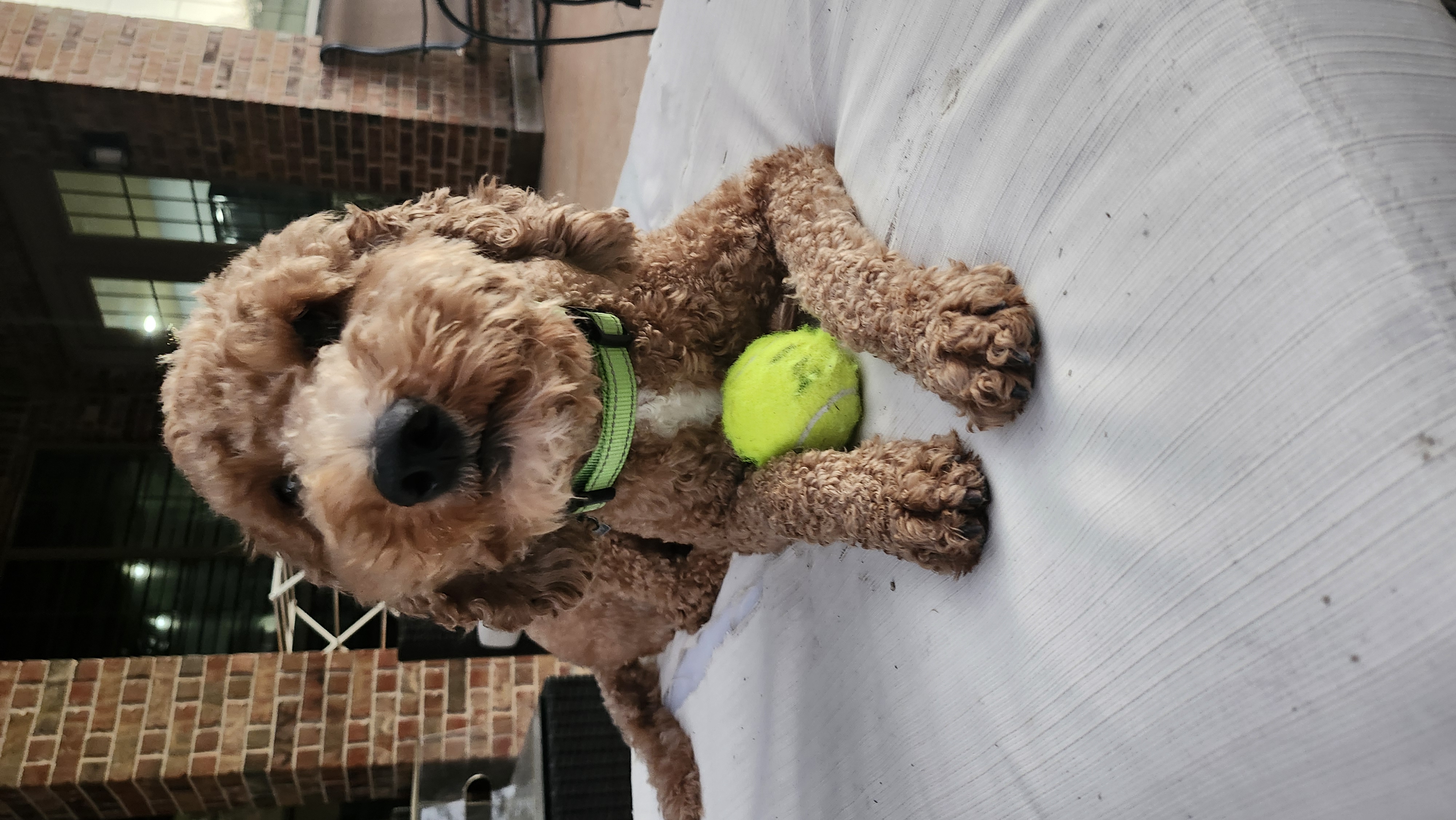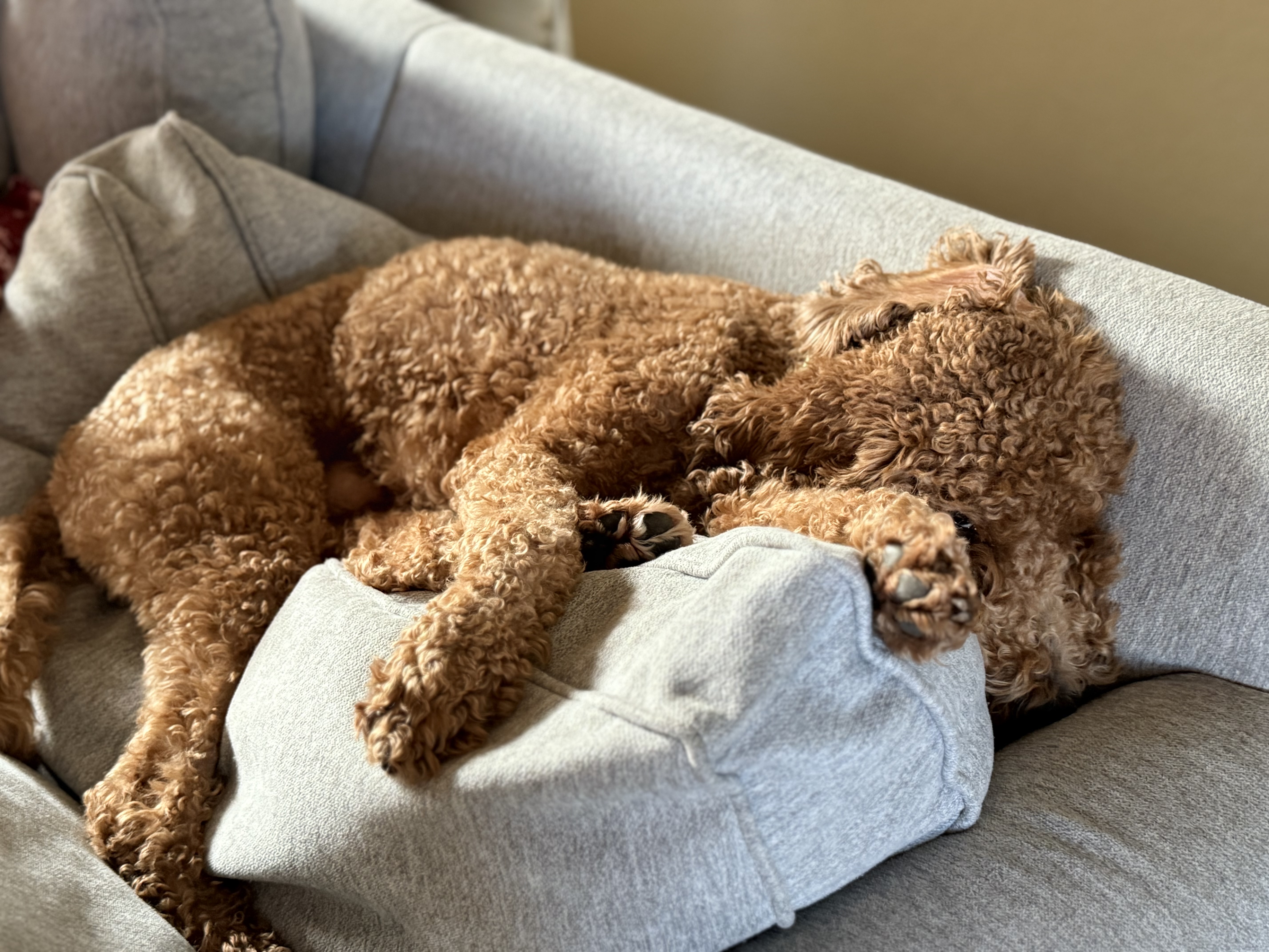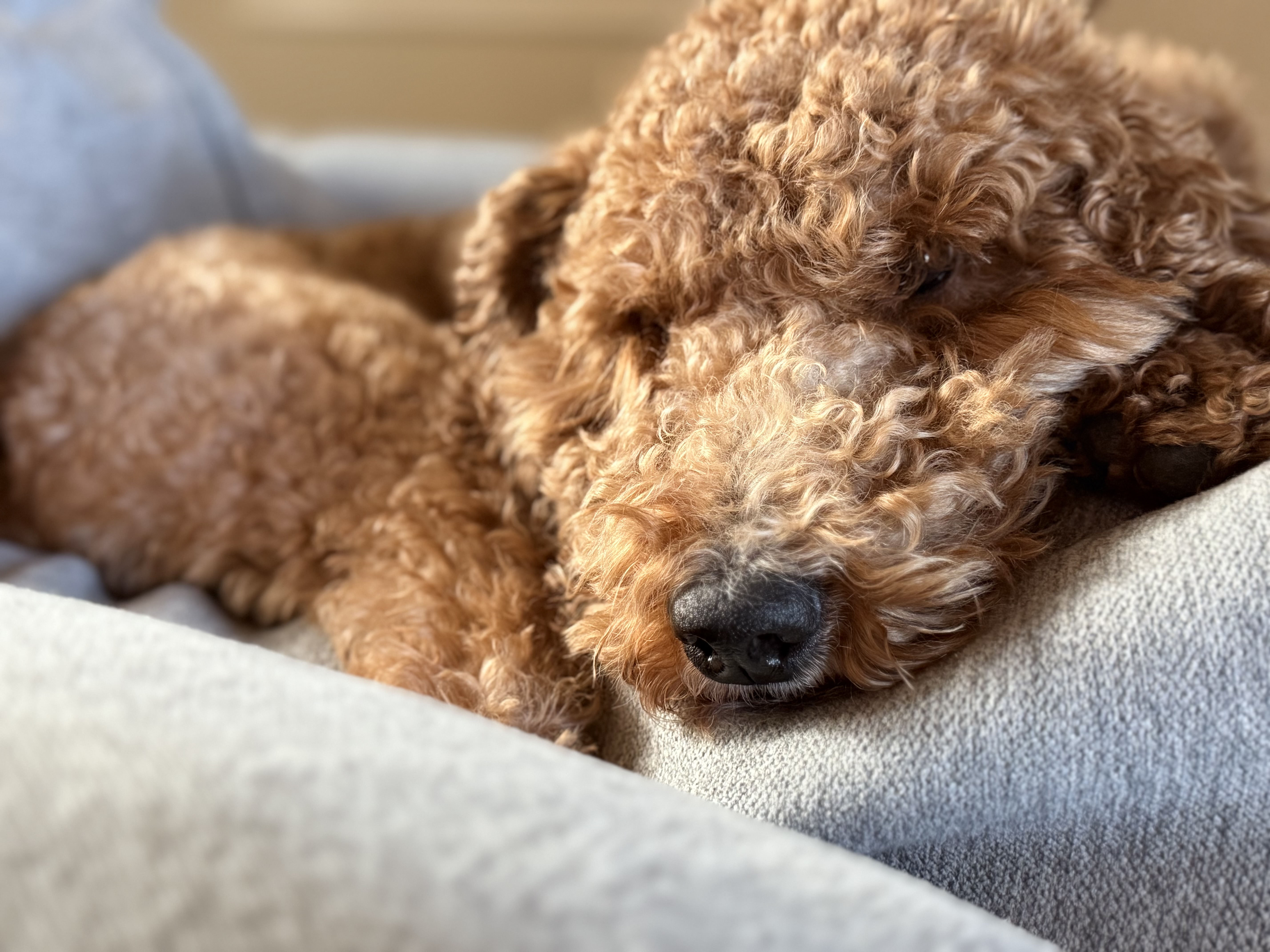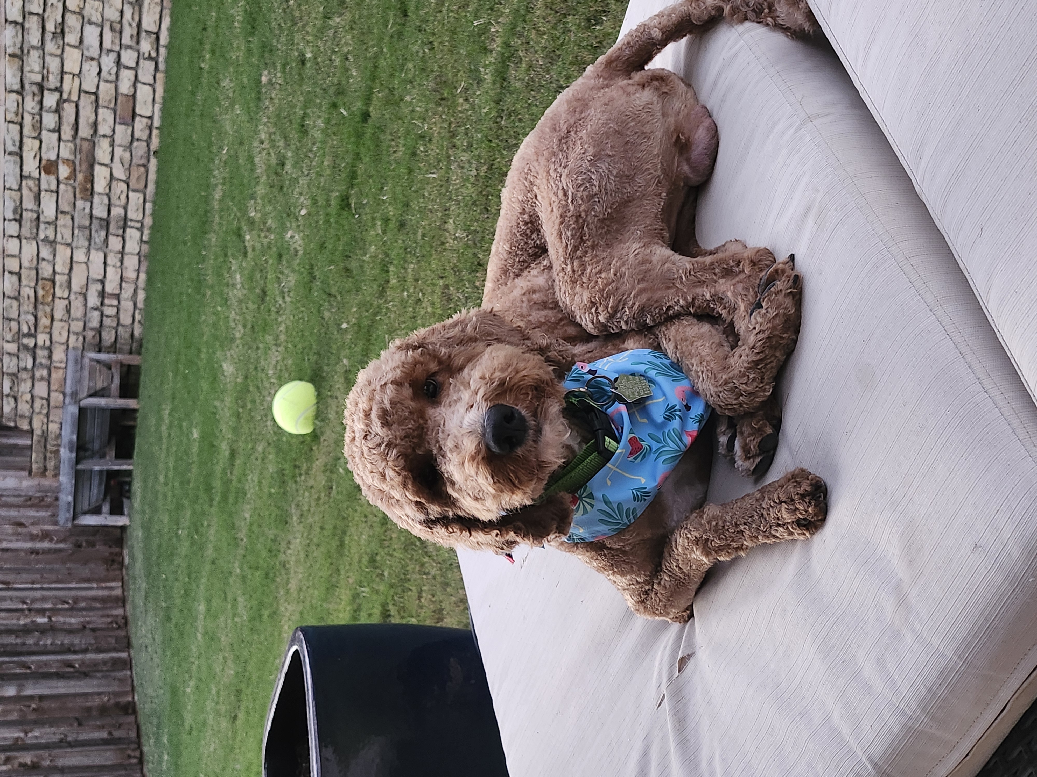 Hi there, I’m Eragon—a 4-year-old mini Goldendoodle weighing in at just 22 pounds of pure love! If you’re looking for a cuddle buddy, I’m your guy. I’m happiest when I'm right next to you, whether you're working from home or relaxing on the couch. Sure, I enjoy a little game of fetch, but what I love most is lounging on the patio, keeping you company while you enjoy the outdoors.