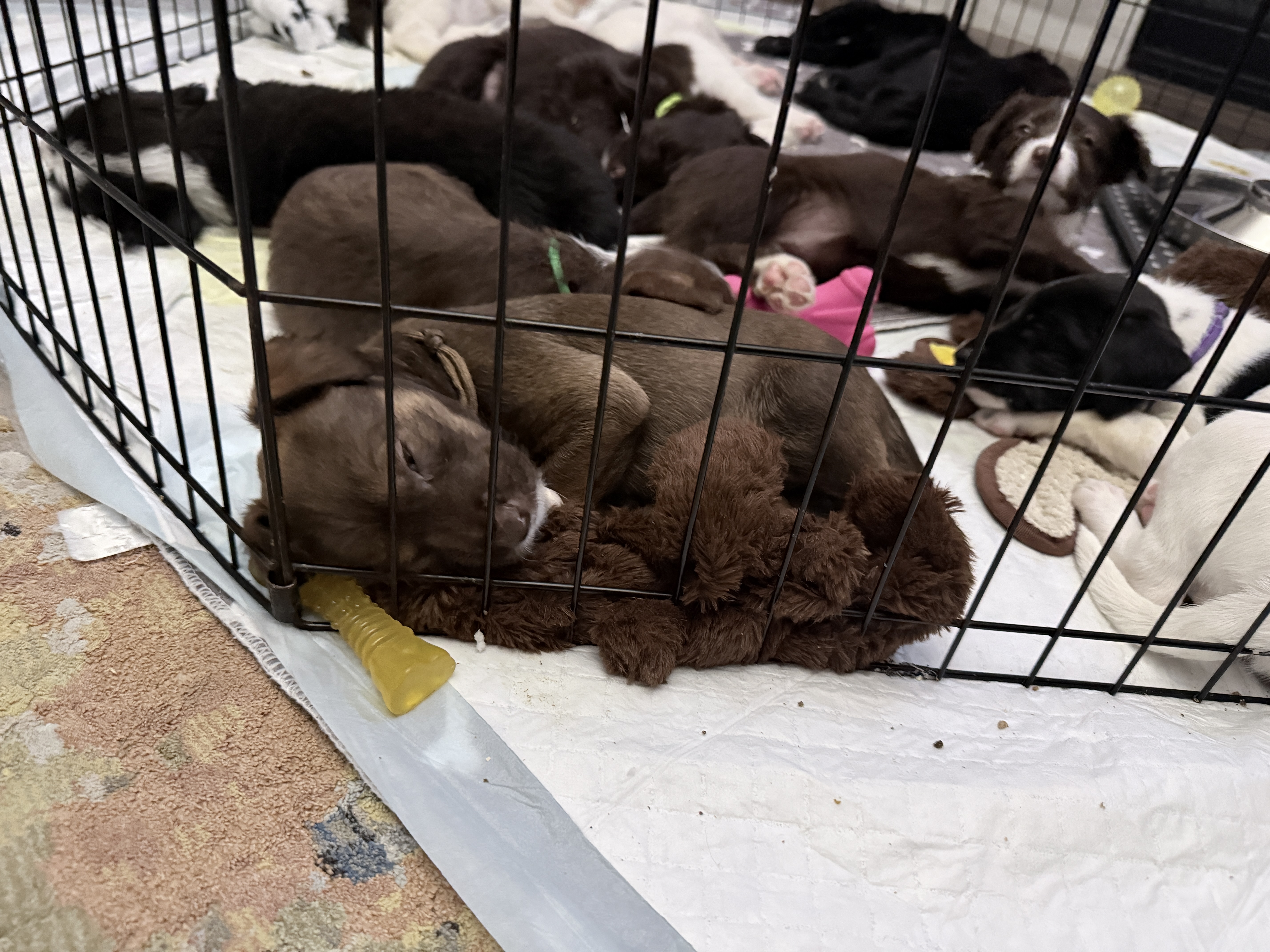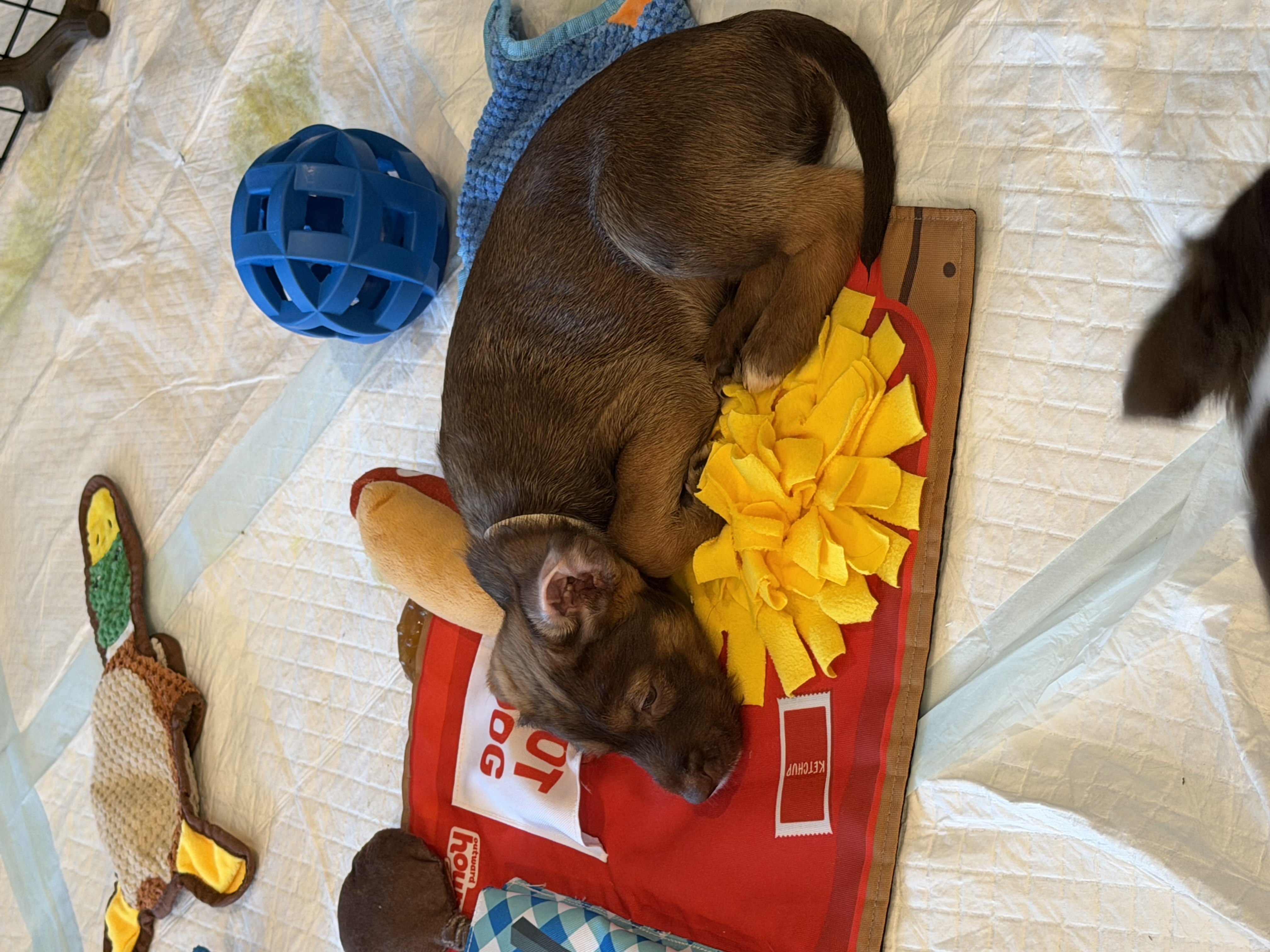 My days follow a steady routine built around four meals at 8am, 12pm, 4pm, and 8pm. Between meals, I rotate between playtime, exploring my world, and long puppy naps to recharge. I spend lots of time with my littermates and foster family, which is helping me build great social skills. I’m still young, so my schedule will change as I grow, but right now consistency helps me feel safe and confident.