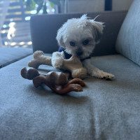 I’m a lover boy with a big, lively presence and a little Napoleon complex—I truly believe I can take on the world. I love cuddling, sitting in your lap, and curling up on your legs at night just as much as I love being outside running around or sunbathing. Between my big, expressive eyes and my adorable little underbite, my face tends to win people over pretty quickly. I move with a charming bunny hop that doesn’t slow me down at all, and when it’s time to play, I’m fully committed. I absolutely adore food and will enthusiastically gobble up just about anything you put in front of me. I’m also known to have a weakness for shoes and socks if they’re left unattended. Toys I can shake are a favorite, and Benebones are my chew of choice.