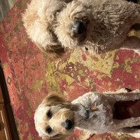 Hi! I’m Gisele (the Gazelle), the prettiest Female Goldendoodle you’ll ever meet. The vet says I’m somewhere between 6 months to 1 year, 45lbs and growing, with LONG legs and large feet, so they say I’m going to be a big girl. I don’t shed or make humans itch.