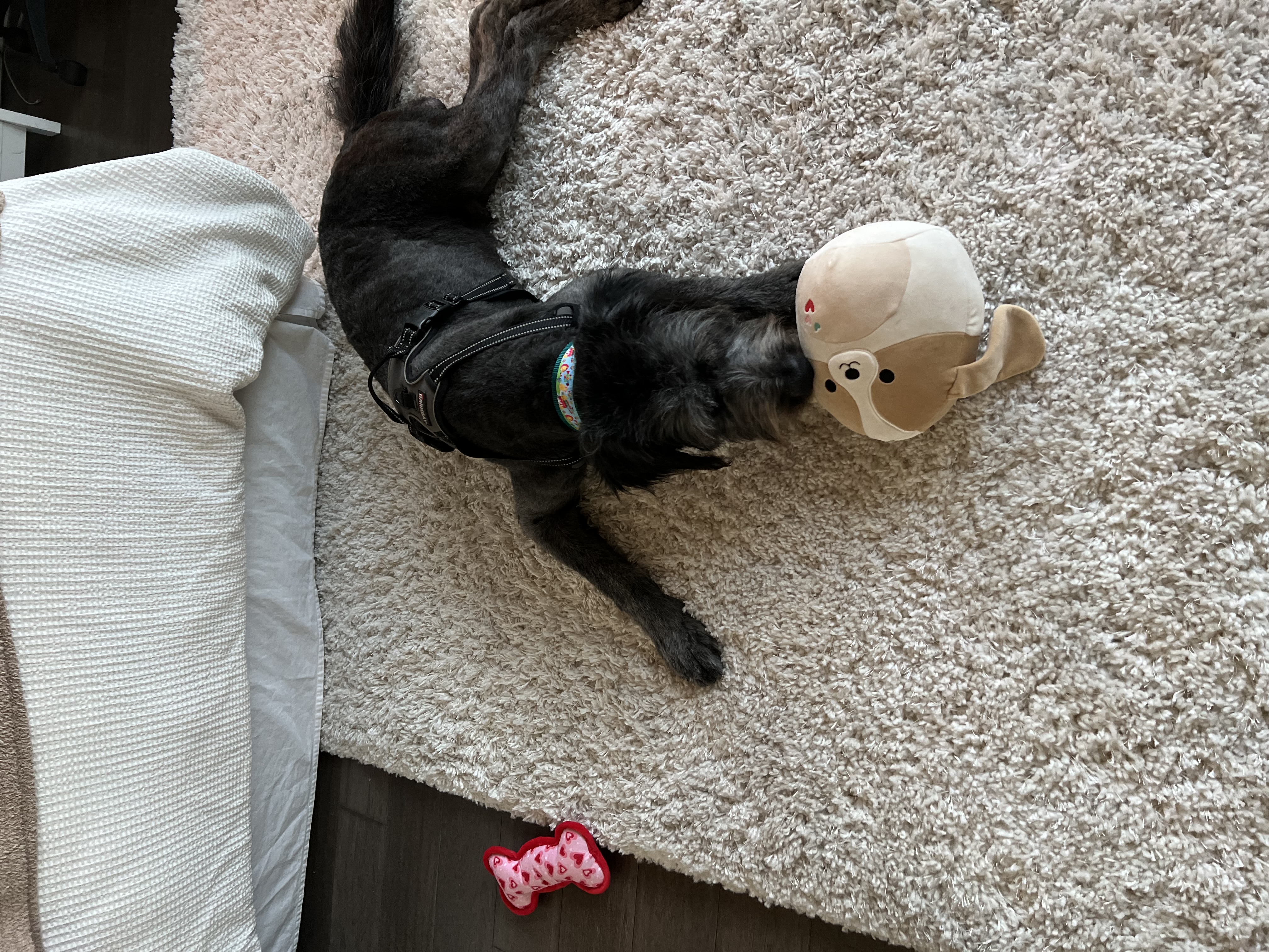 I am fully potty trained and comfortable in my crate - I don’t mind being in there. However, if left alone outside my crate, I’ve been known to jump on tables and pull things down. I’m still working on my leash manners; sometimes, I grab the leash, but I’ll drop it when told “No”. I’m a smart pup who knows how to sit and respond to my name, and I’m continuing to learn commands like “stay”, “down”, and “here” for recall. I’m eager to keep learning and improving! I’m currently recovering from my neuter surgery so I have been wearing a cone and have had to lay low. I can’t wait to be fully healed so I can go on long walks and run / play outside with other dogs.
