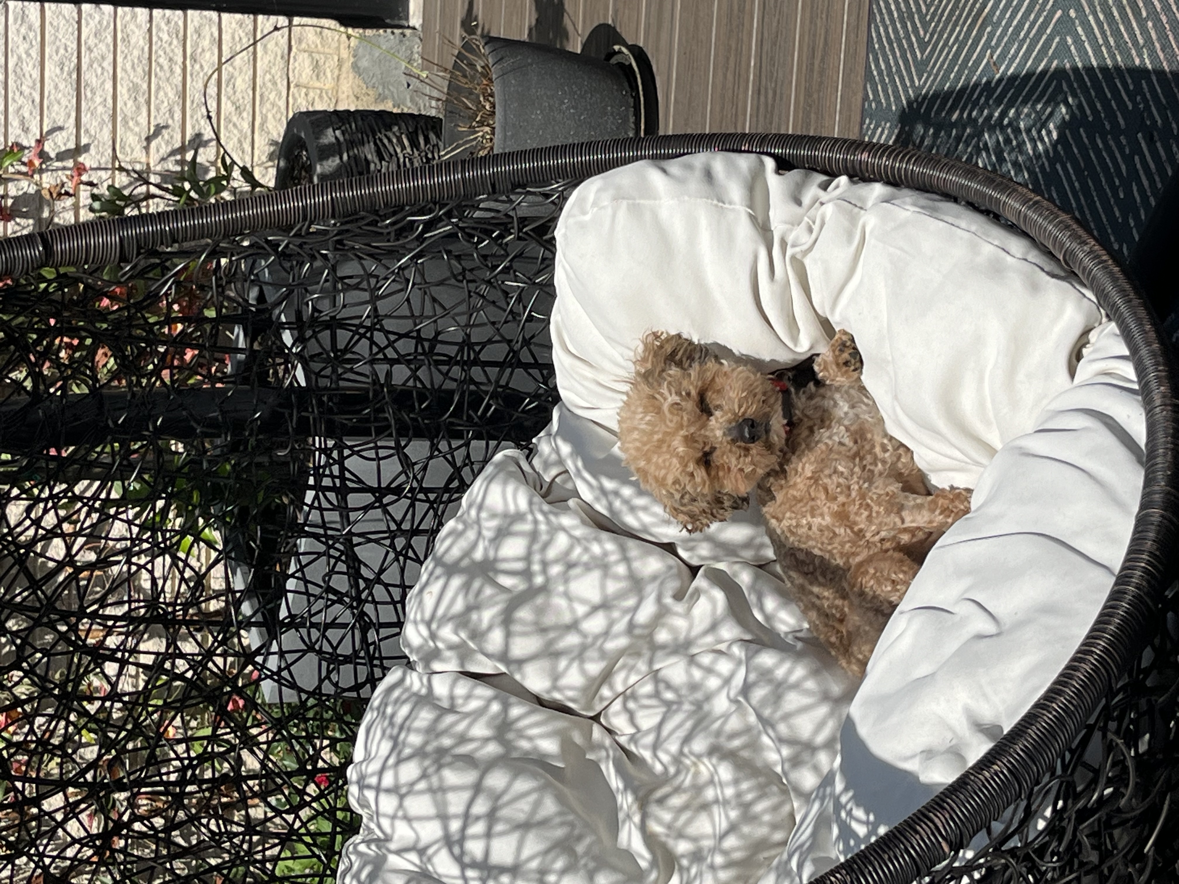 I go outside to potty first thing in the morning, then eat breakfast. I have a terrific appetite! I will, however, attempt to sneak sips of your coffee. Then I play, nap, and cuddle on repeat until it’s time for 6 pm dinner. I usually go to bed around 10:30 pm with one last bathroom break before settling in.