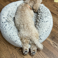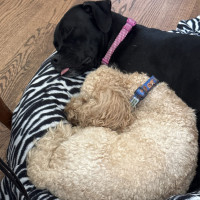 I am a professional cuddler and an expert nap companion. A couple of relaxed twenty to thirty minute walks a day is perfect for me, then I am very happy to settle in for couch time. When my people leave, I rest calmly in a gated hallway without fuss. At night I sleep in my crate in the bedroom because I feel safest knowing you are close by.