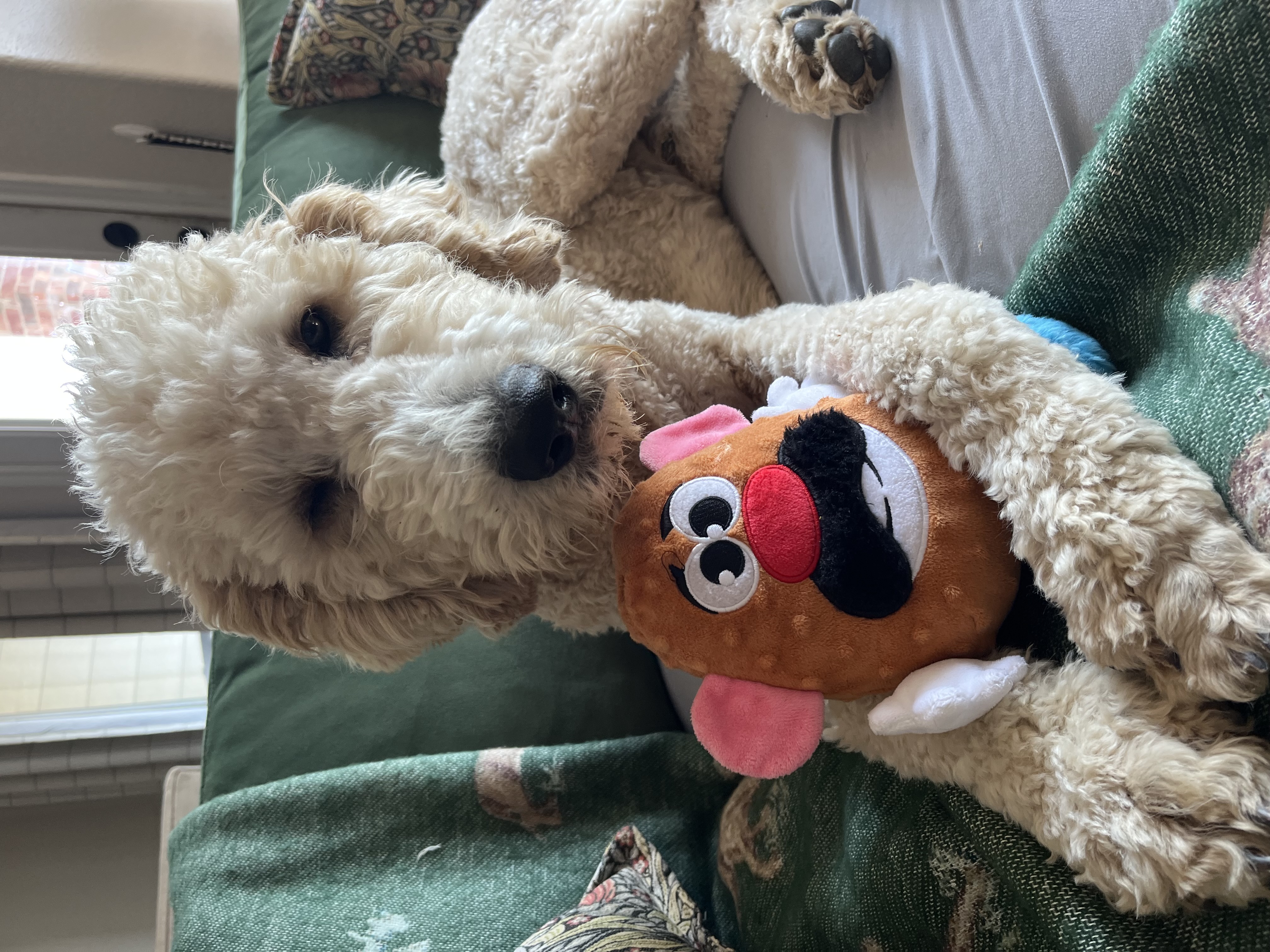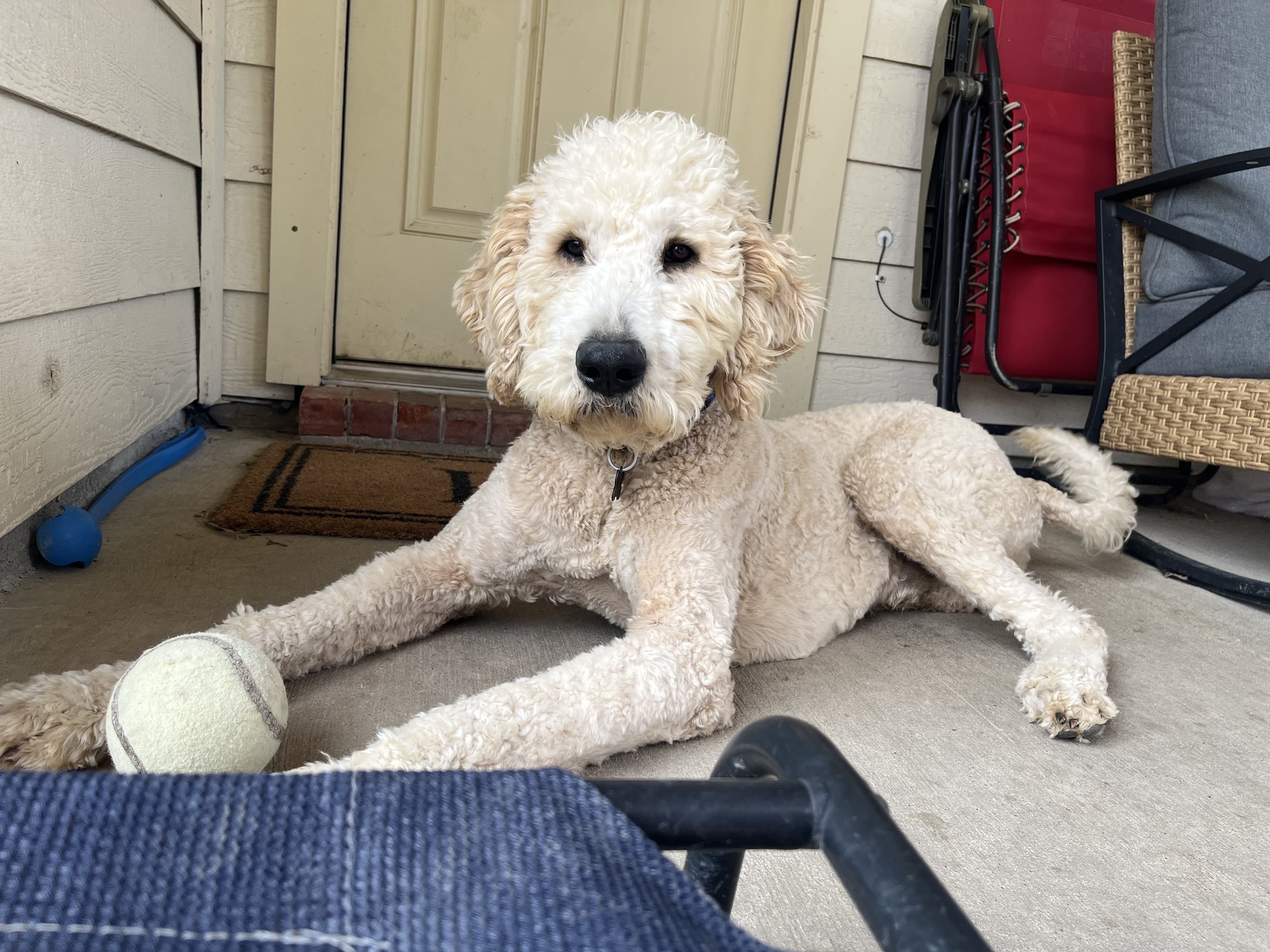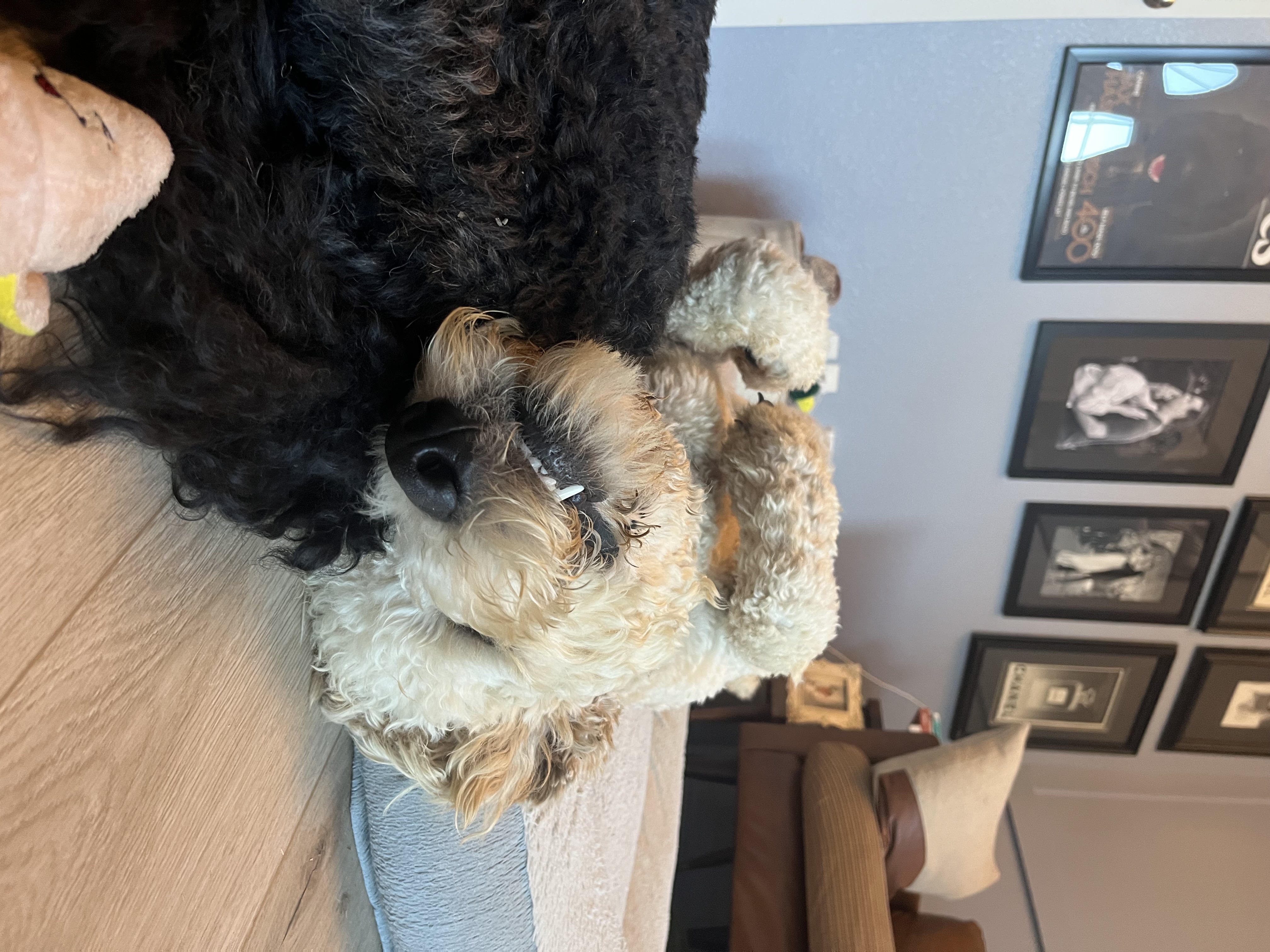 Hi there! My name is Gusty, but around here I go by Cooper—or Coopie Cakes, Coop, Coopie… I’ve earned a lot of silly nicknames, and I wear them all with pride. I’m a 1-year-old doodle mix, tipping the scales at about 70 pounds, with a heart just as big as my paws.