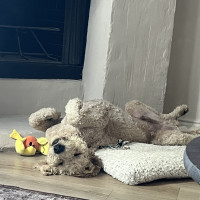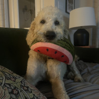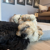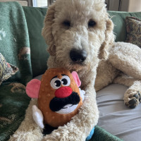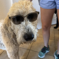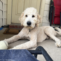 Hi there! My name is Gusty, but around here I go by Cooper—or Coopie Cakes, Coop, Coopie… I’ve earned a lot of silly nicknames, and I wear them all with pride. I’m a 1-year-old doodle mix, tipping the scales at about 70 pounds, with a heart just as big as my paws.