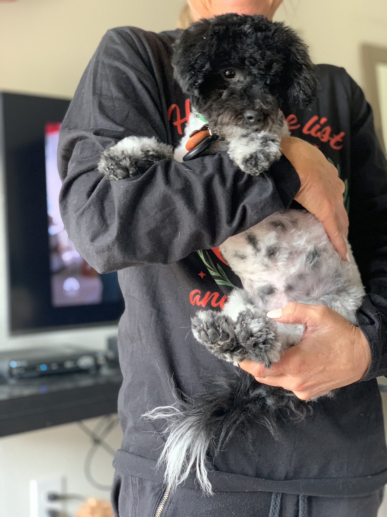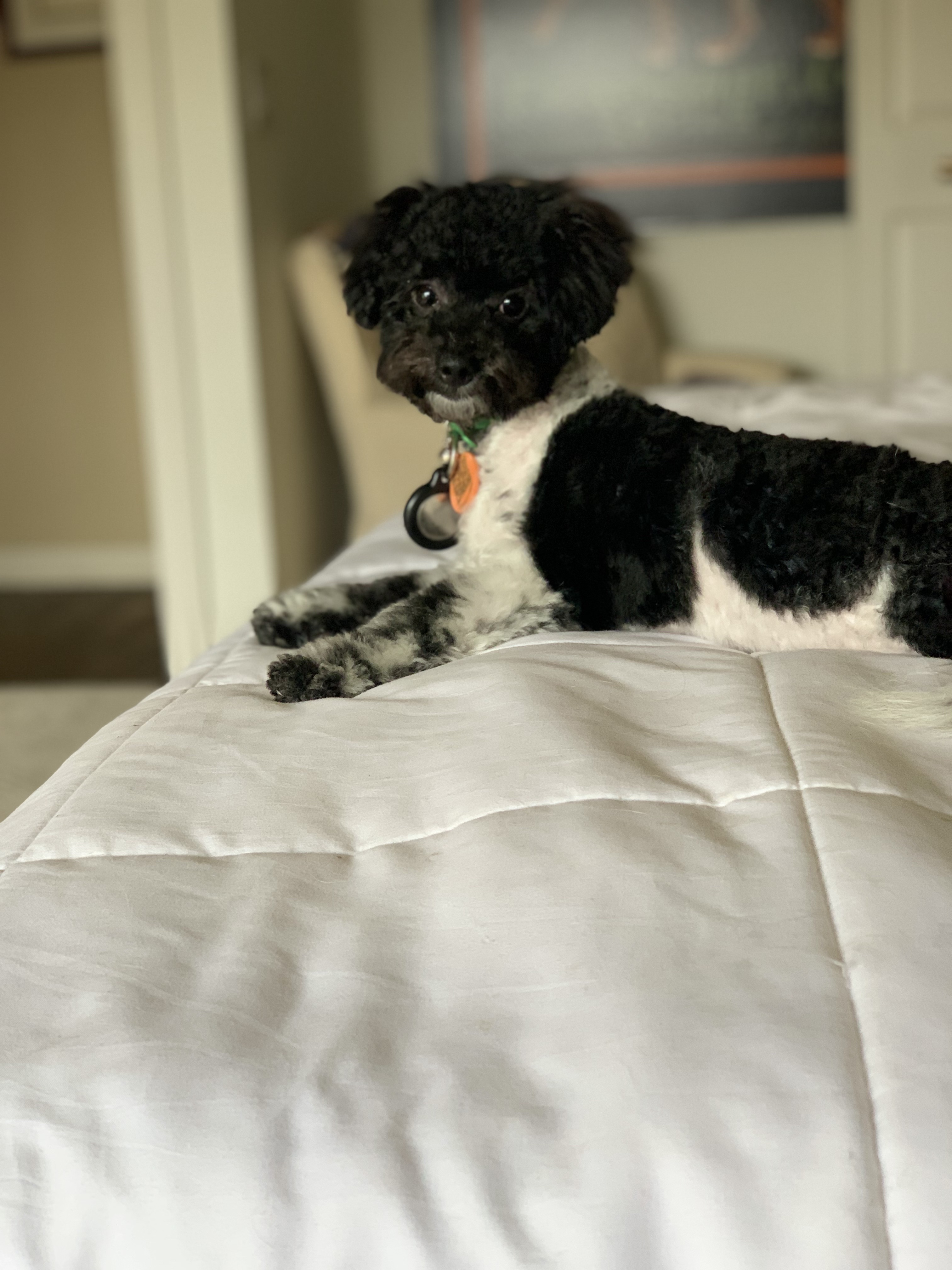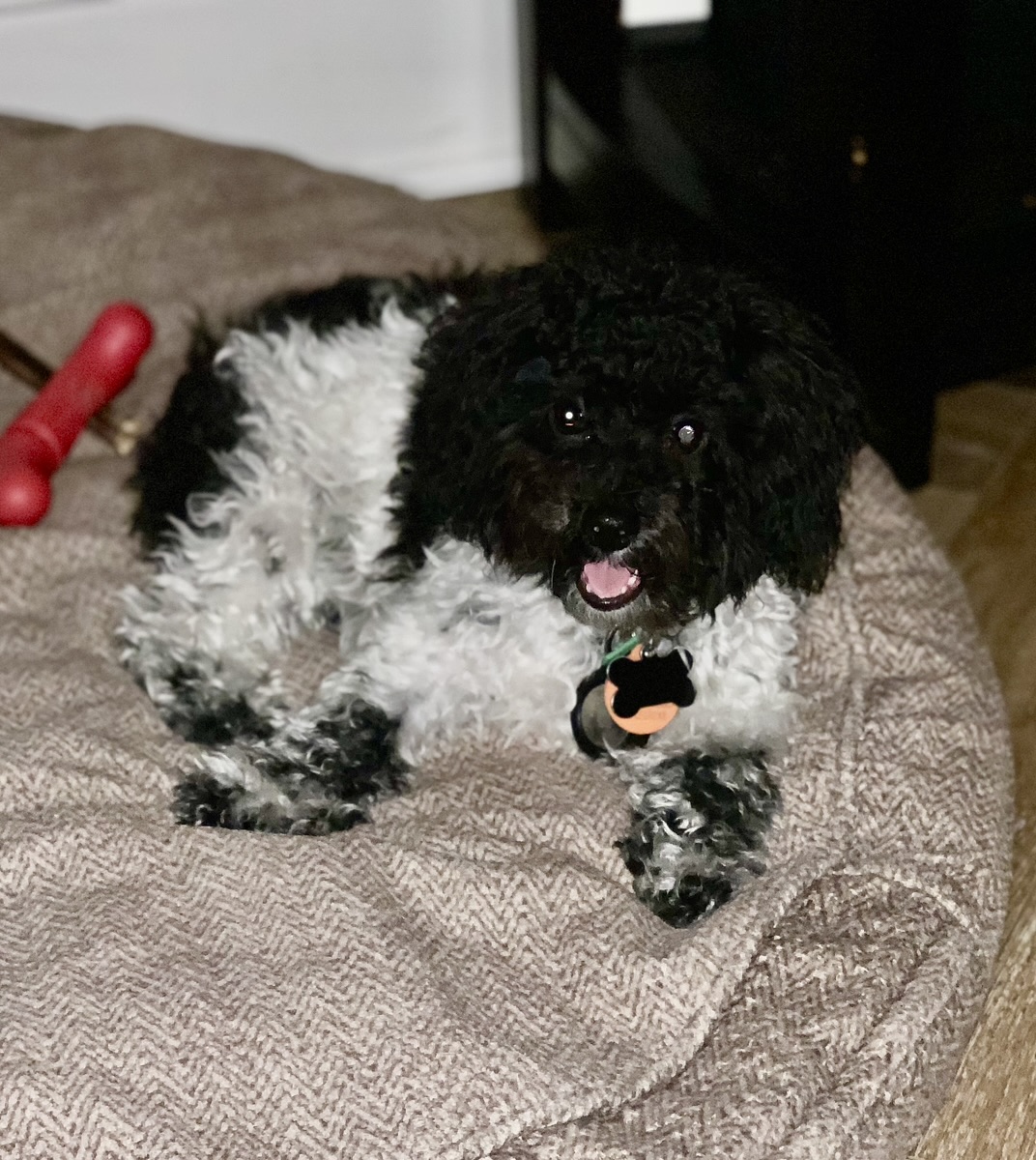 Hi there! My name is Harper, and I’m a 4-month-old Poodle mix who’s all wiggles, joy, and boundless energy. I’m a tiny black-and-white fluff ball—just 7 pounds right now—and I’m expected to stay small, likely under 15 pounds once I’m all grown up. I may be little, but I’ve got a huge heart!
