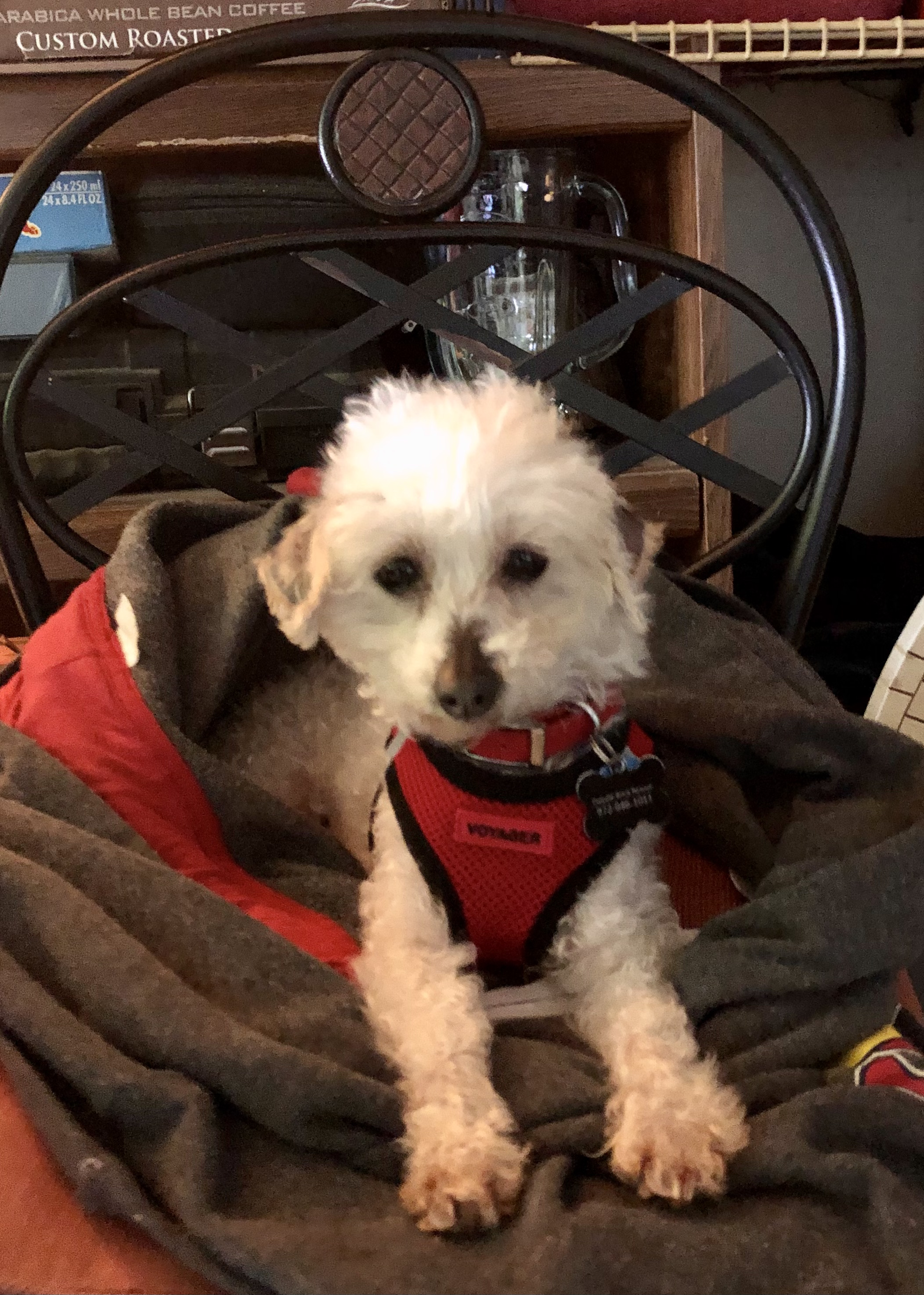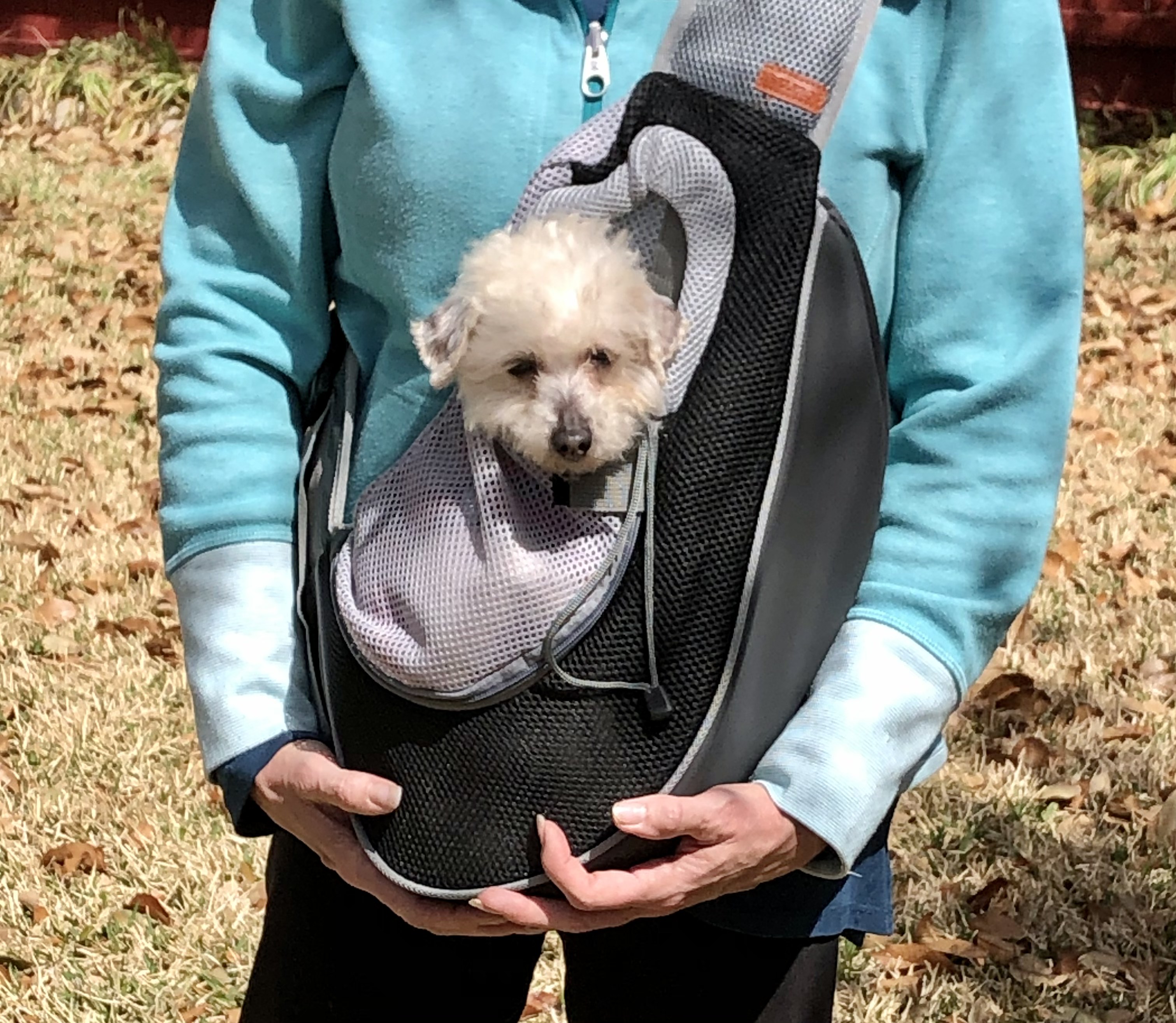 I wake up at 6 AM to potty outside and do my cute dance for breakfast. During the day, I enjoy resting in my crate (door open) where I can see what’s going on. I love going outside in my puppy sling, which I prefer because it makes me feel safe. I’m learning a lot by watching my fur-sister all the time. Dinner is at 5 PM, then outside to potty again for bedtime at 9 PM.