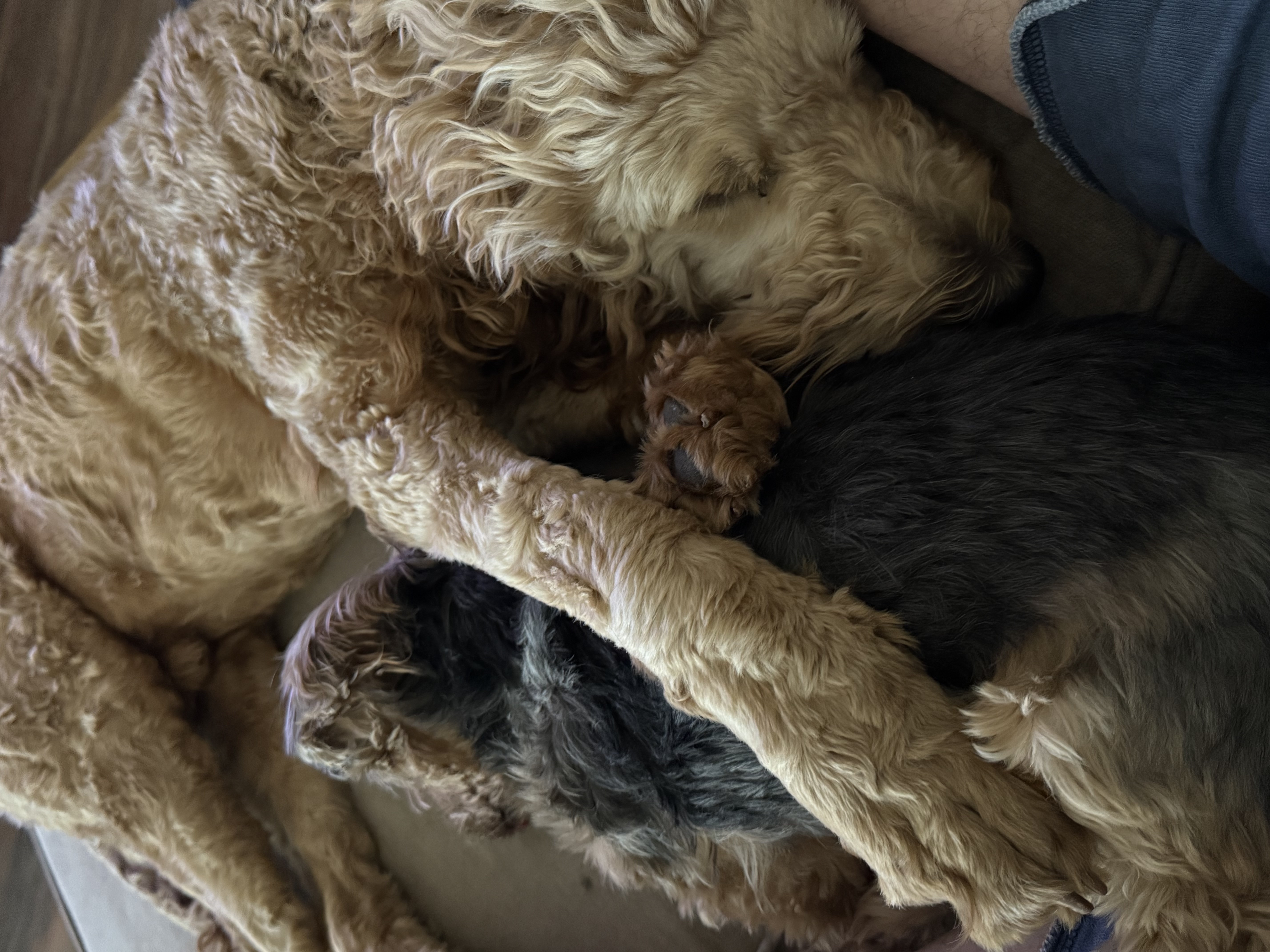 Here’s how my days go: I wake up, head straight outside to do my business (I’m a gentleman like that), and then it’s time for… BREAKFAST! I sit and wait politely (even though I want to dive in headfirst), and once I eat, it’s playtime in the yard with my doodle girlfriends and the little pups too. After that? Nap city. I check in with my foster dad when I need another potty break, and when dinner rolls around, well, let’s just say I’m equally enthusiastic about round two! After dinner we usually play some more, and at bedtime I’ll hop on the bed to warm it up for you, then curl up next to you on the floor to keep watch through the night.