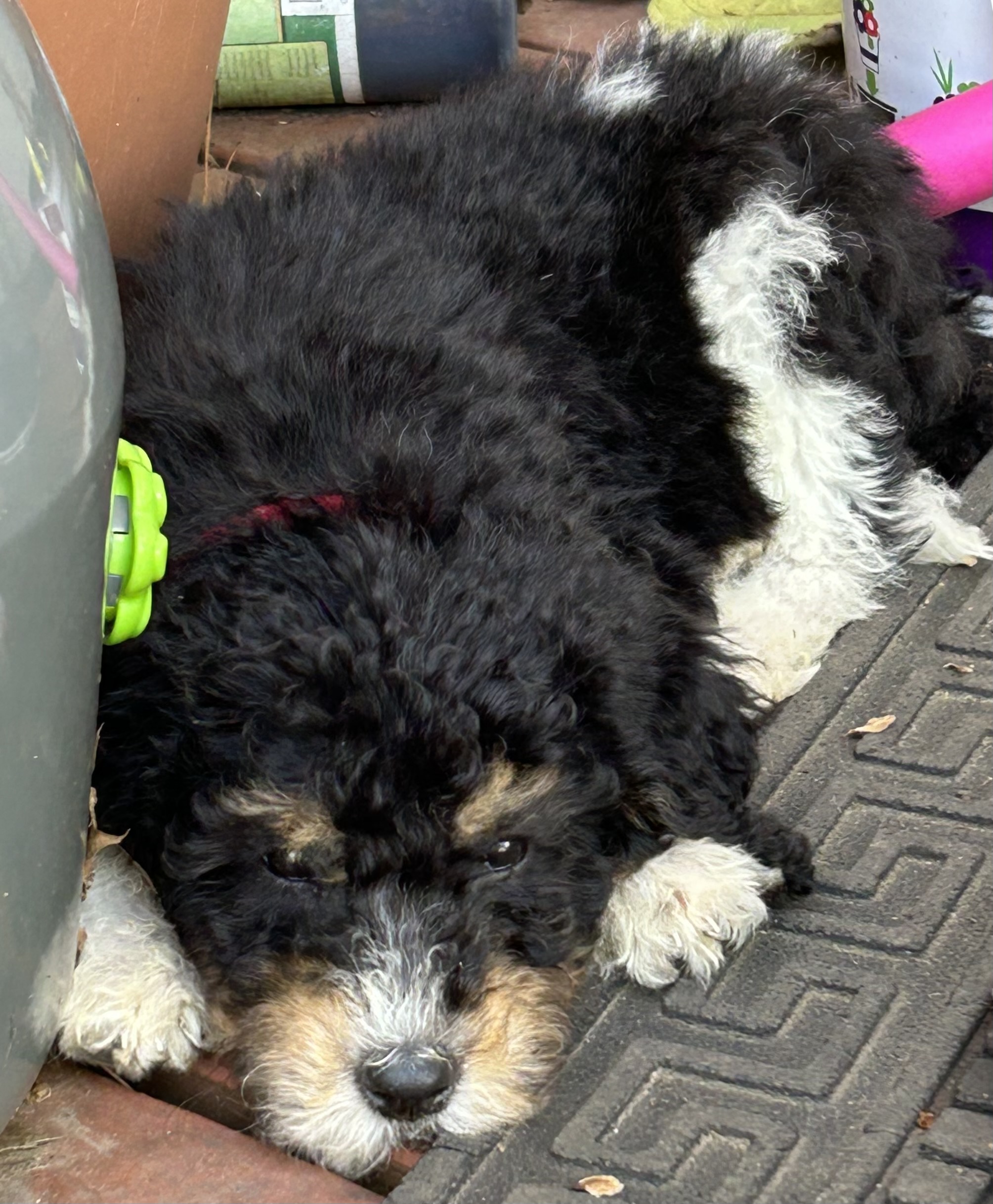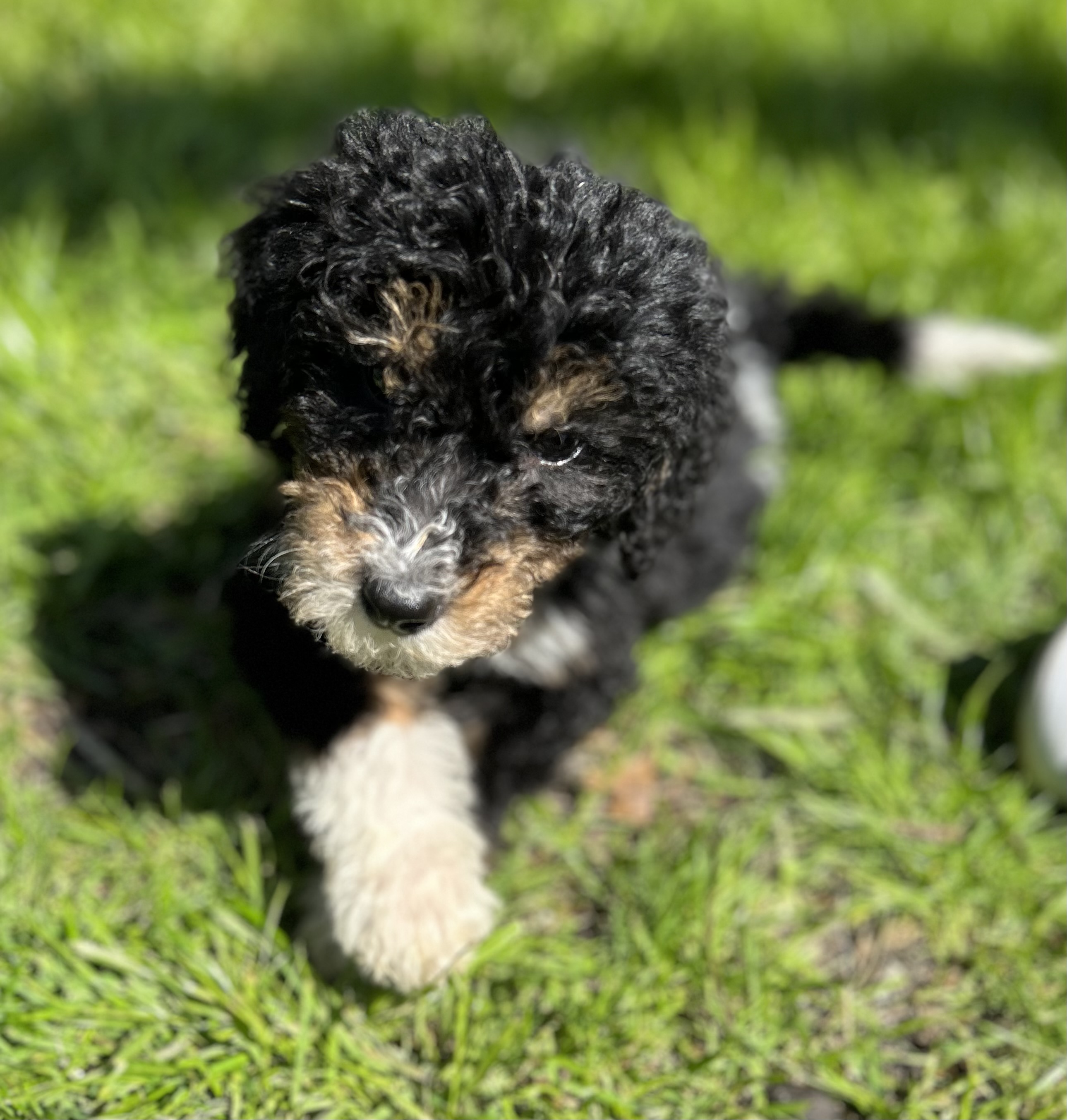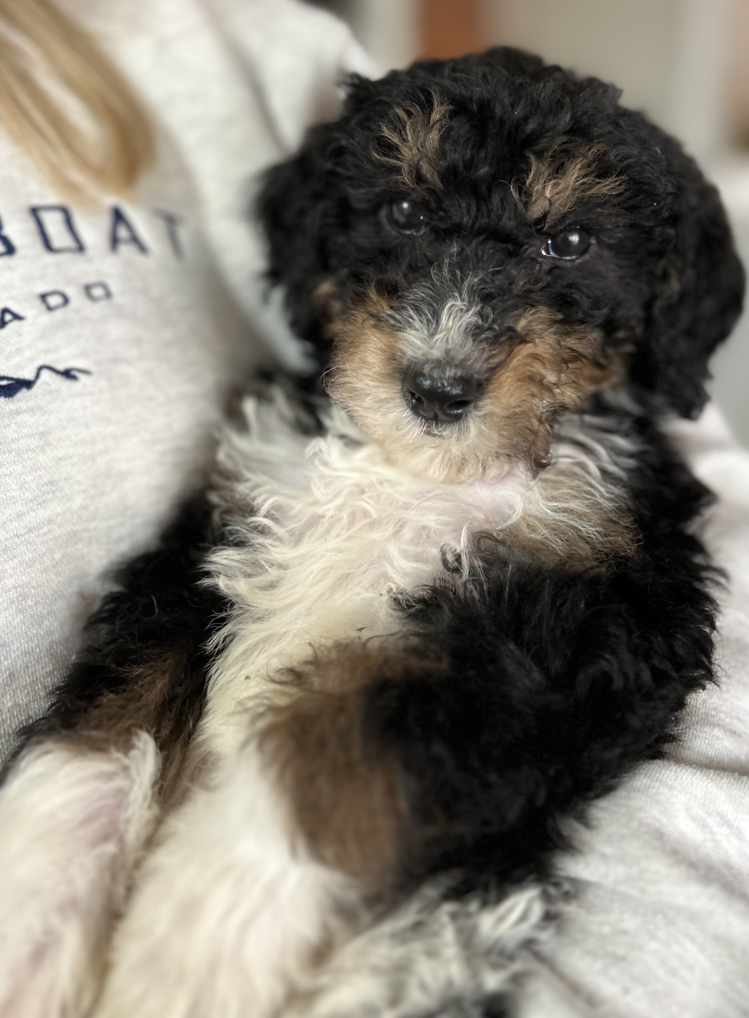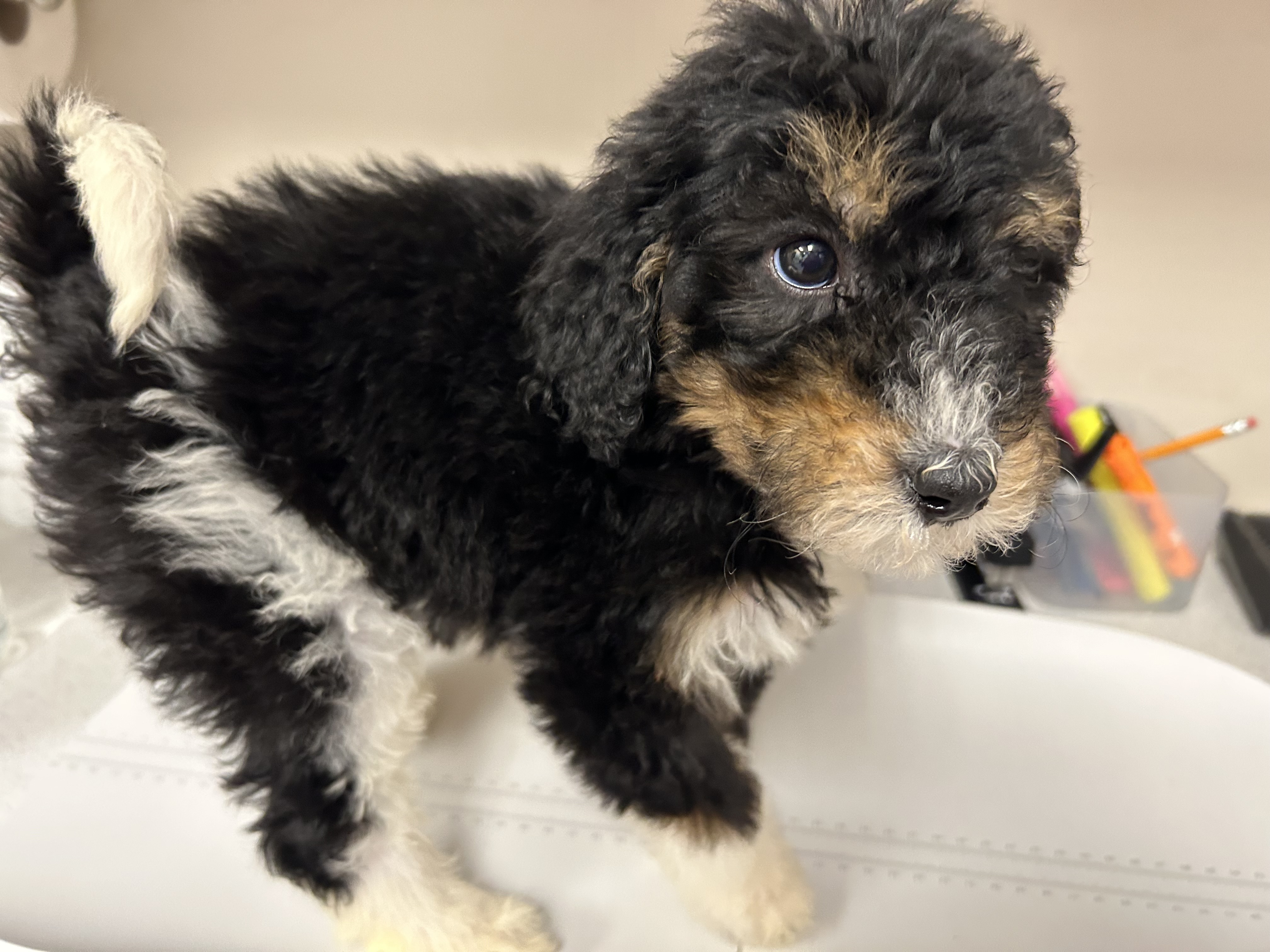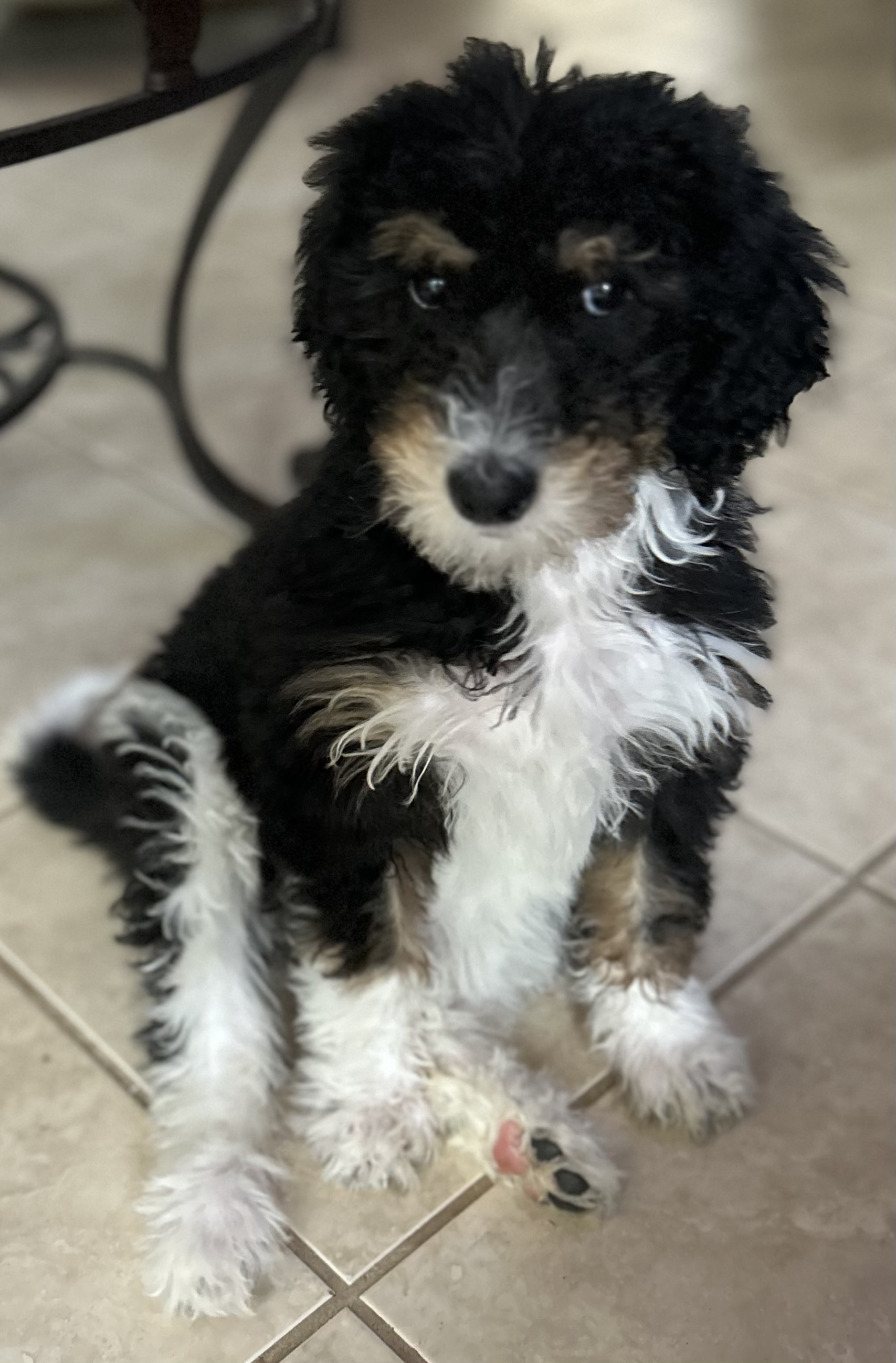Hello- I am Iris, the Greek Goddess of the rainbow. I am a 11-week-old Female Bernedoodle currently weighing in at 10lbs. I have a fluffy fur coat of black on my back, a white jelly belly and paws, and a rainbow of white across my lower back that the white tip of my tail looks like it painted. I have a few brown accents on my legs, face and my gorgeous brows.