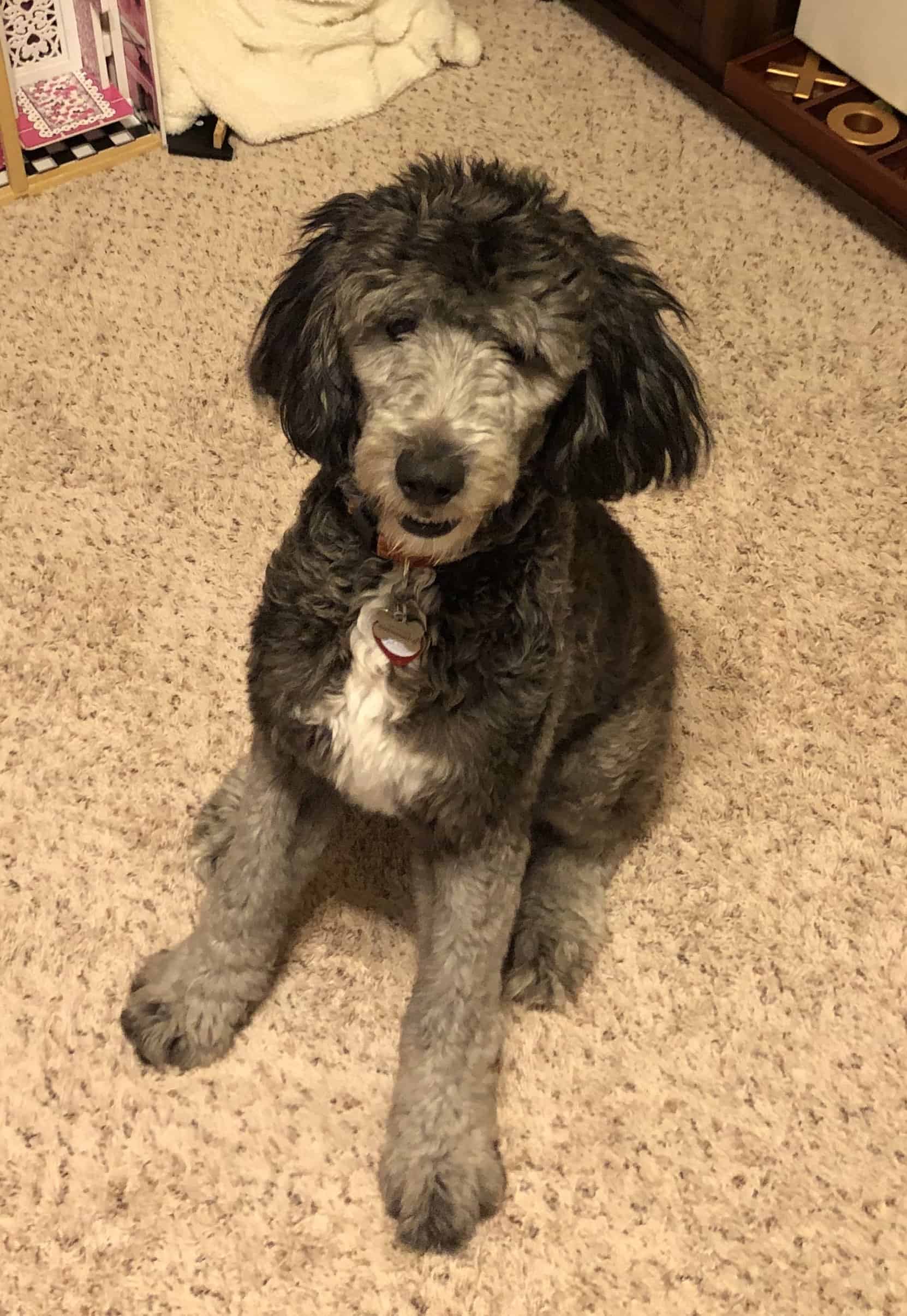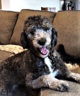 Meet Jolene….she’s a 9 month old Sheepadoodle who is 36 lbs of cuddly, soft greatness! She absolutely loves people and her foster brother who is a 60lb Labradoodle. This girl is the happiest as long as she’s right where you are!! Under your desk at work, sleeping next to your on the sofa or even if it’s in a circle of 5 year old girls playing Barbie, she just wants to be included. Her foster home has 4 kids and she never once took any of their toys or chewed them, she was such a good girl!! She does have one obsession…. don’t leave your SOCKS out!! She will run off with them! She wants you to chase her to get them back!! She loves her walks…if she finds an acorn she will carry it in her mouth the entire walk and drop it when the walk is over. Jolene’s not shy to strangers and she’s very excited to see her foster family after they leave. They have been working with her on separation anxiety but she has gotten so much better. Jolene is VERY attached to her foster Dad! She prefers males but loves her foster Mom and kids just as much. If Foster Dad leaves the house she will whimper for him. She sleeps great at night, we moved her crate into the Master bedroom…. where she could see Foster Dad sleeping…. and she has been sleeping on average 8-9 hours nightly without a peep. She would probably do great without being crated but Foster brother sleeps in our room and when the two of them get together it’s non-stop playing so we have to crate her for rest. Her two favorite things to do are play chase and tug of war (with a sock) with her foster brother.