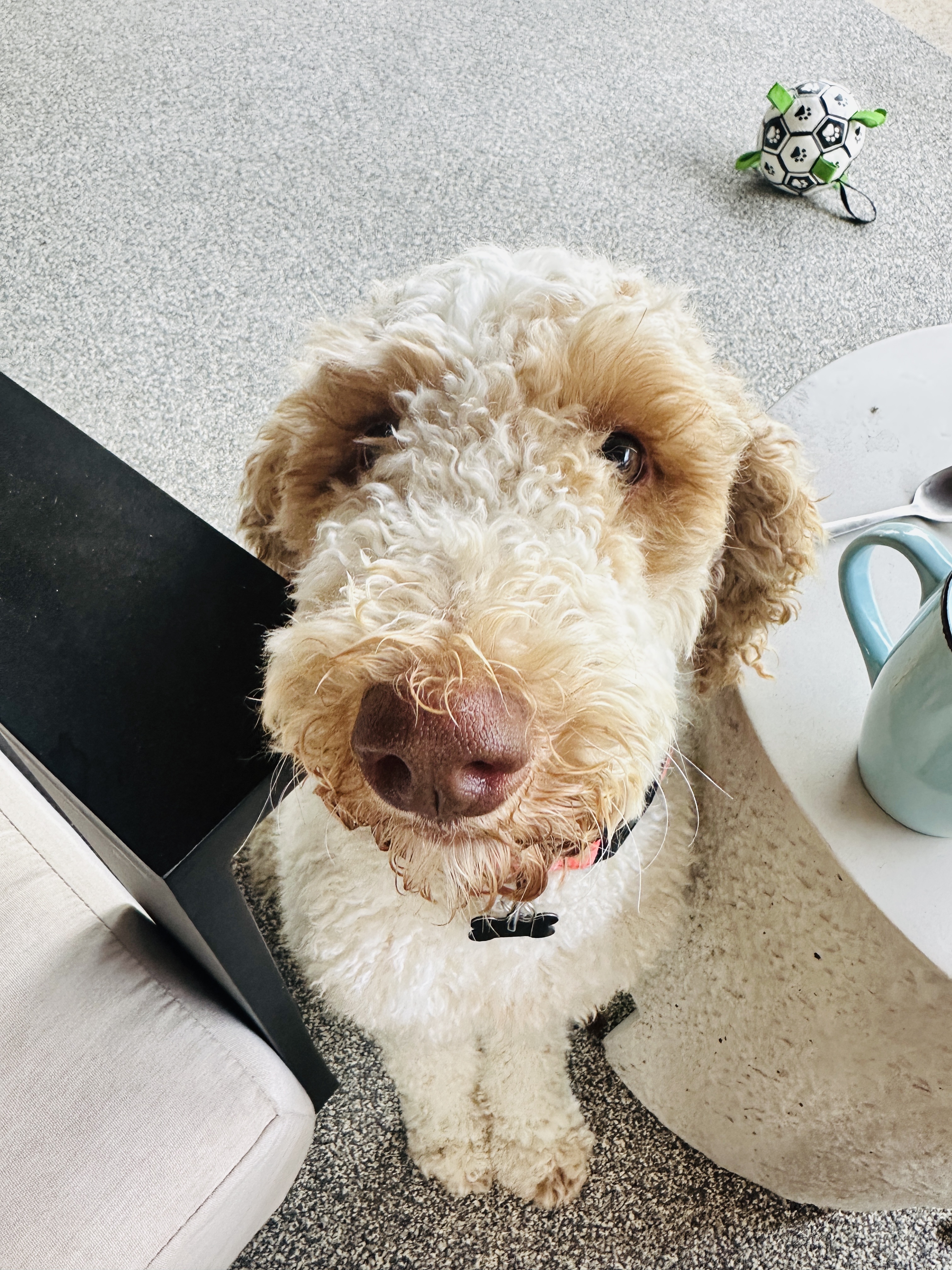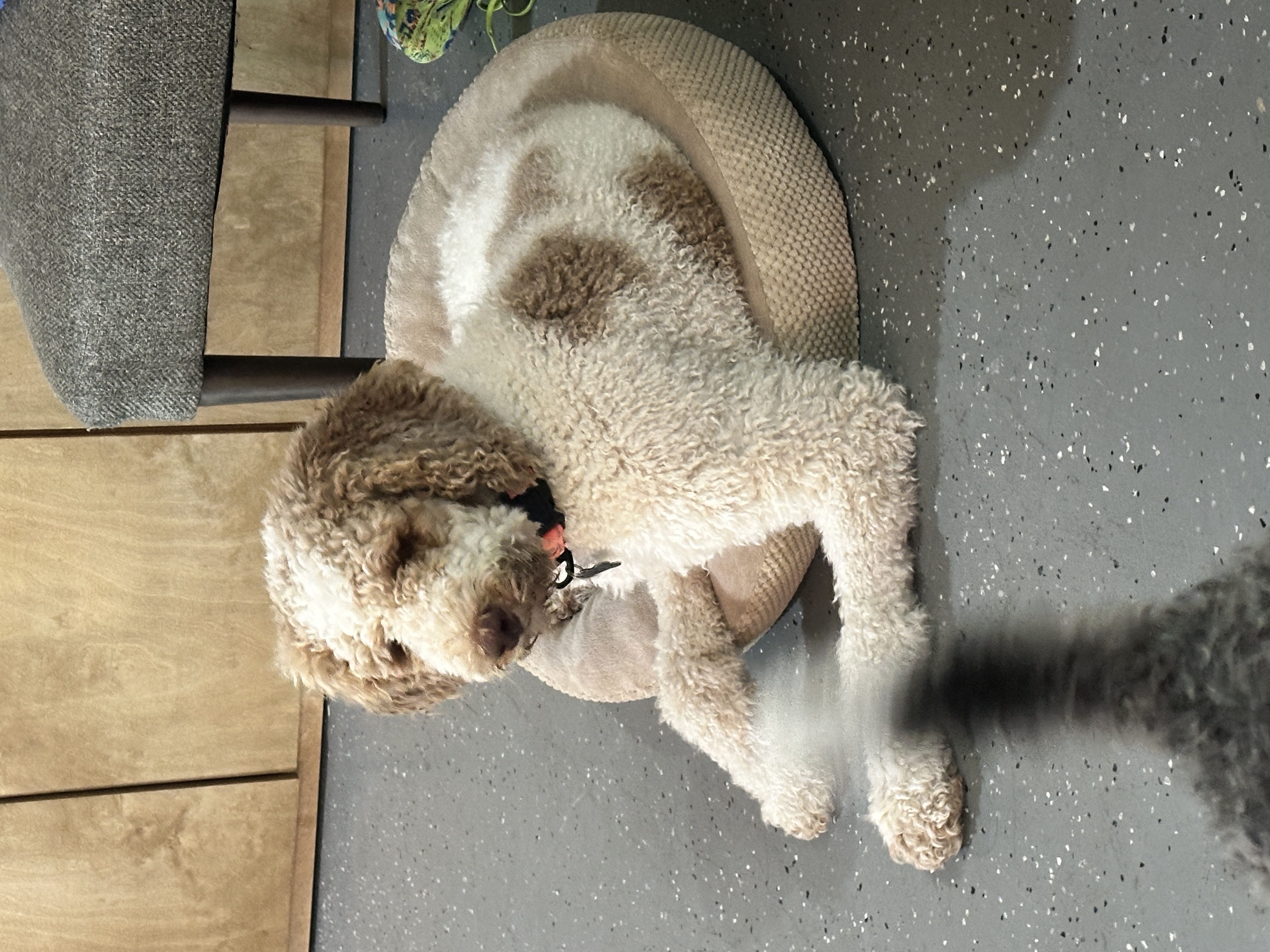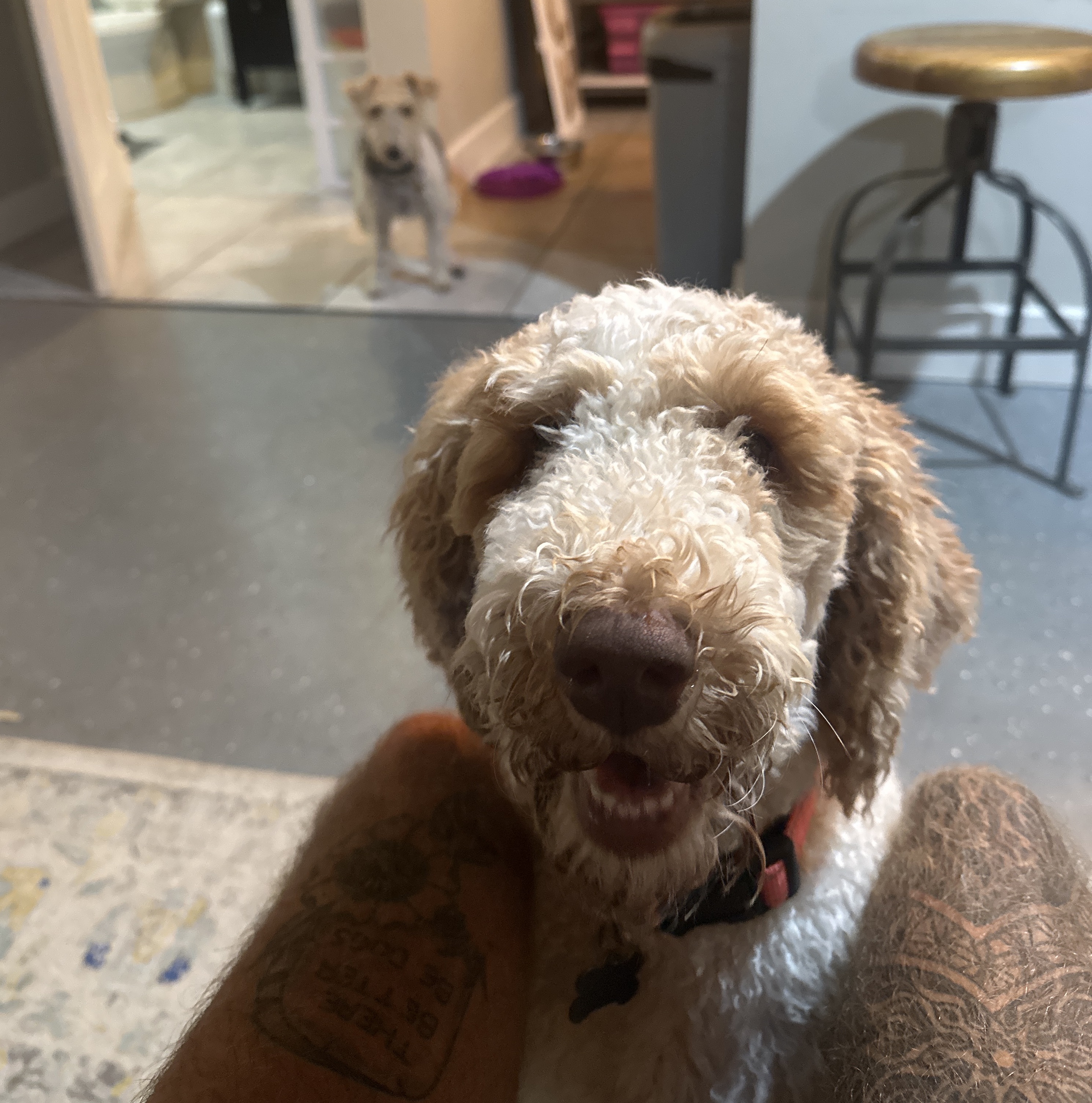 My ideal day starts with a walk—getting outside early helps me burn off some energy. Later, I like to nap under the dining table, then wrestle with my 110-pound foster doodle brother, then nap again. I’ve got energy to spare and sometimes get the zoomies, especially in the afternoon. Squirrel chasing in the yard is a passion of mine, but I’m trying to learn that leashes and wildlife don’t mix. I’m also working on staying calm when we pass other dogs on walks.