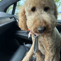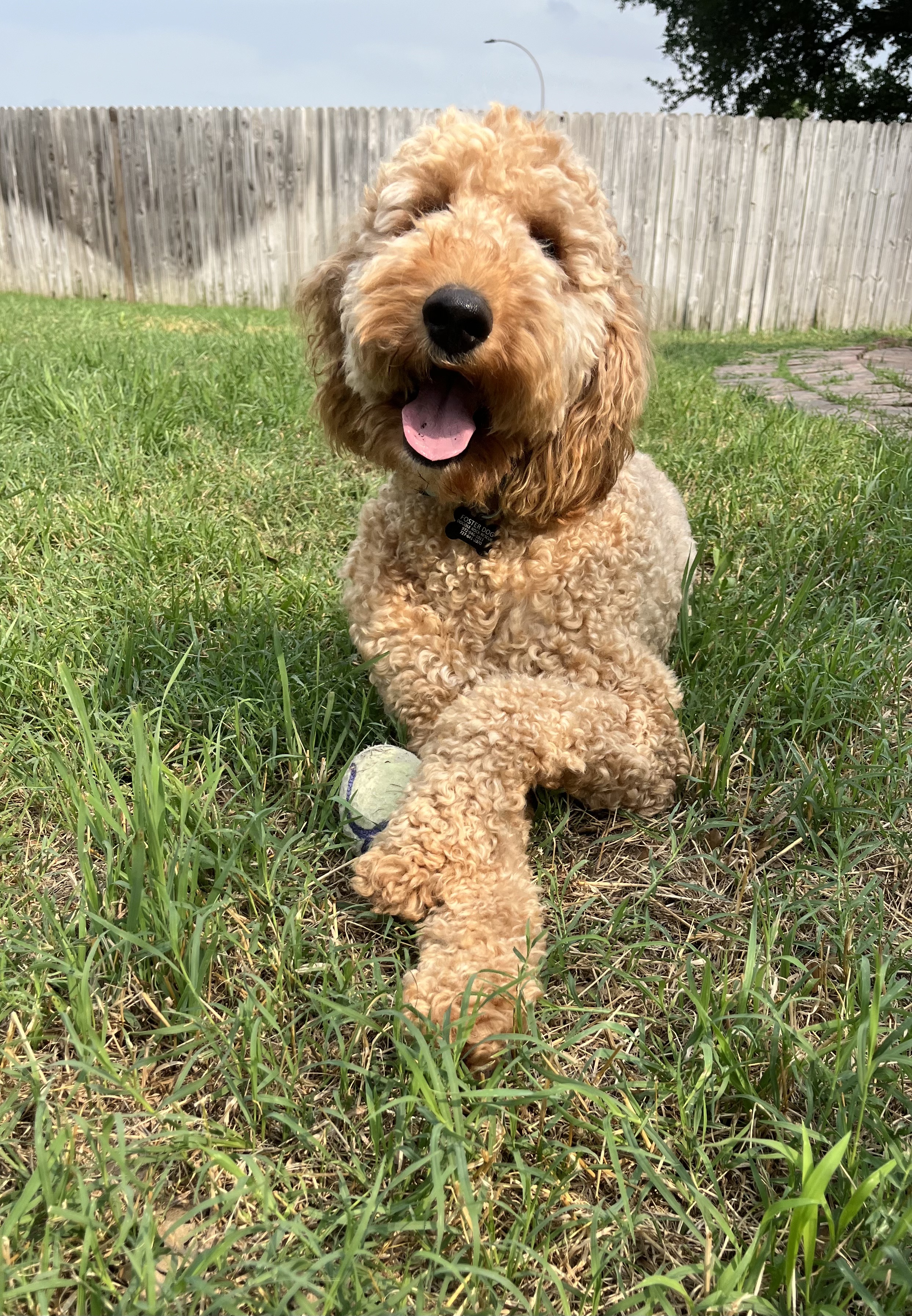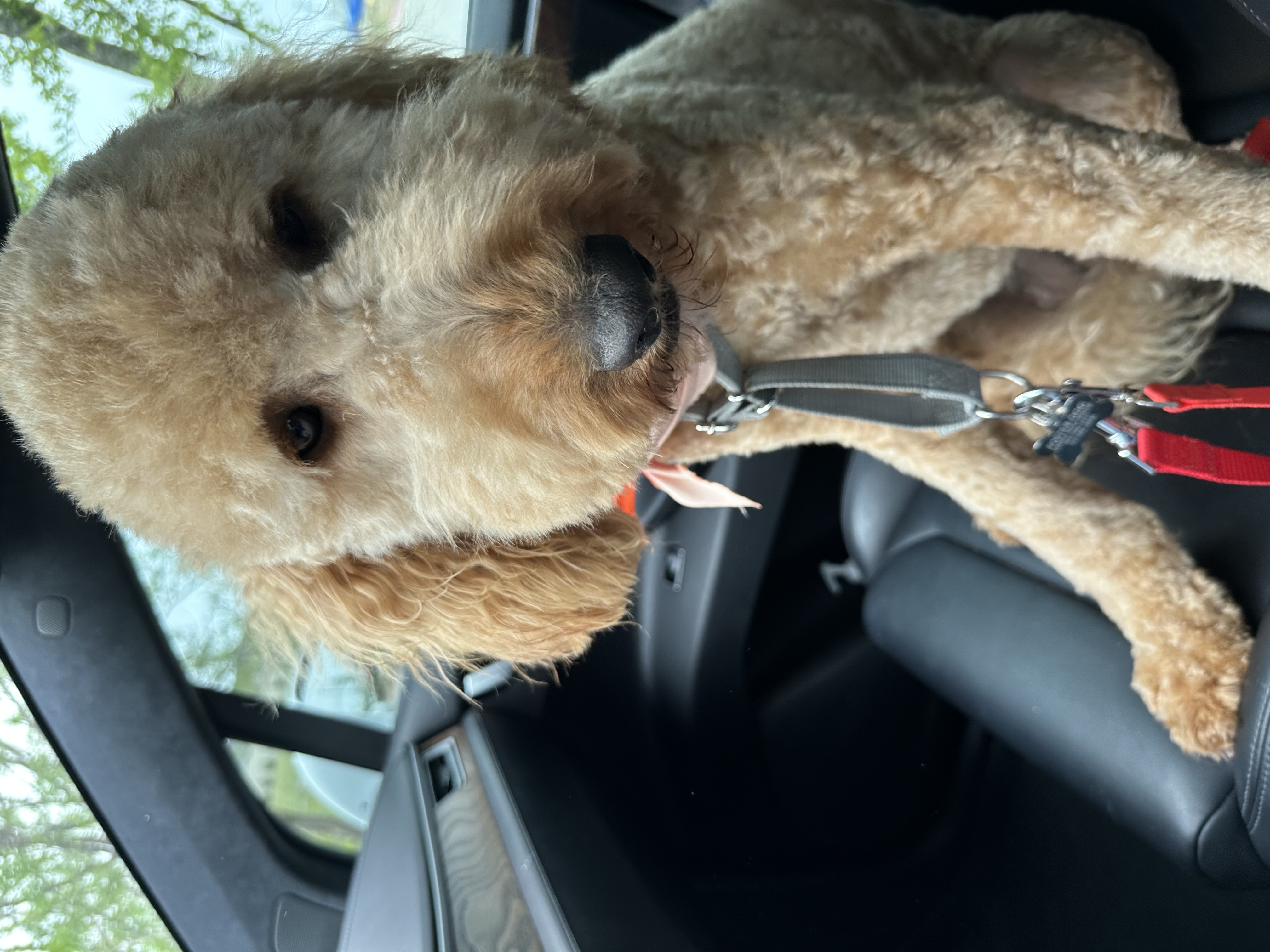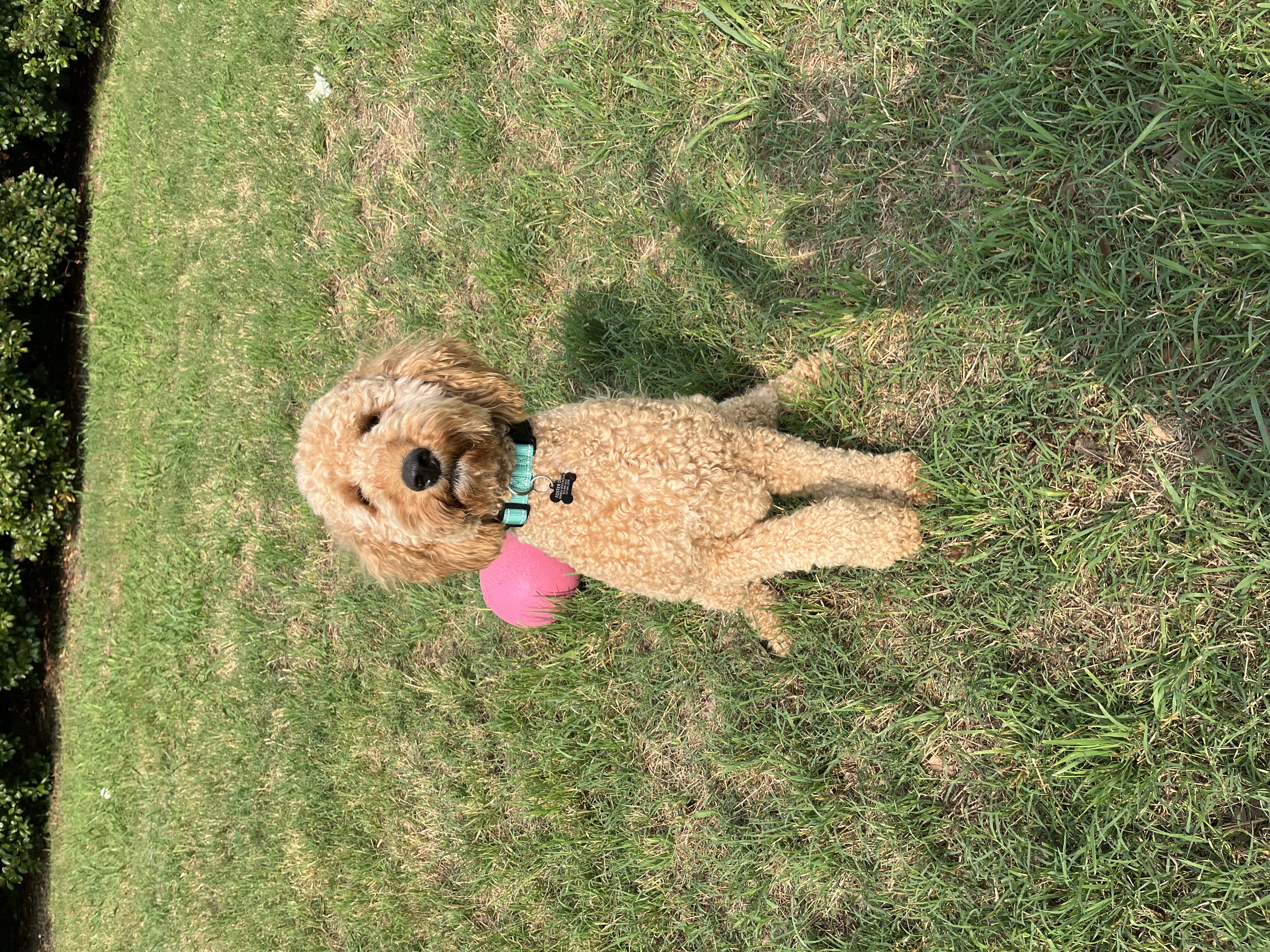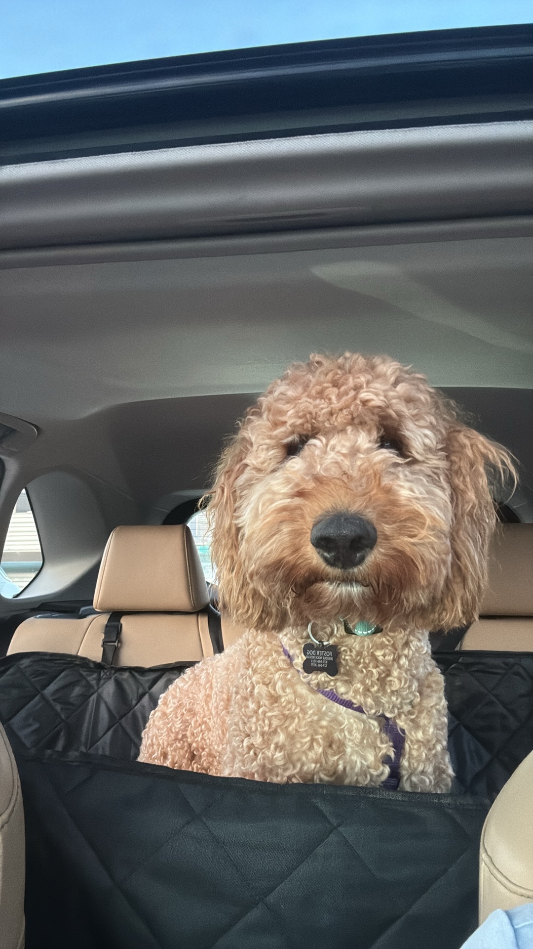 Hi, my name is Jutta! I’m a two-year-old female doodle, and I weigh around 45 pounds. I’ve got a soft, wavy coat and a big, fun personality that makes life way more exciting when I’m around!