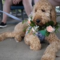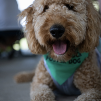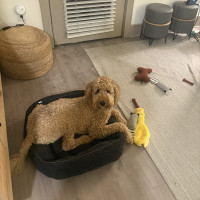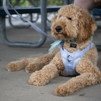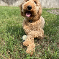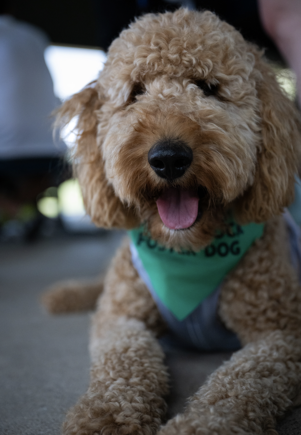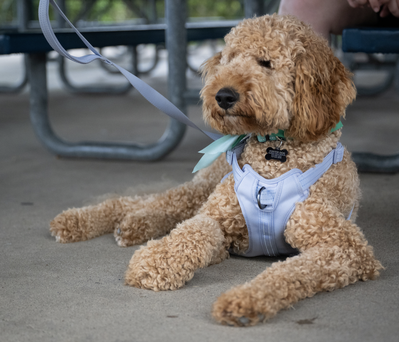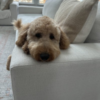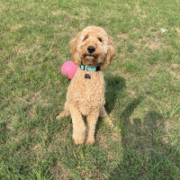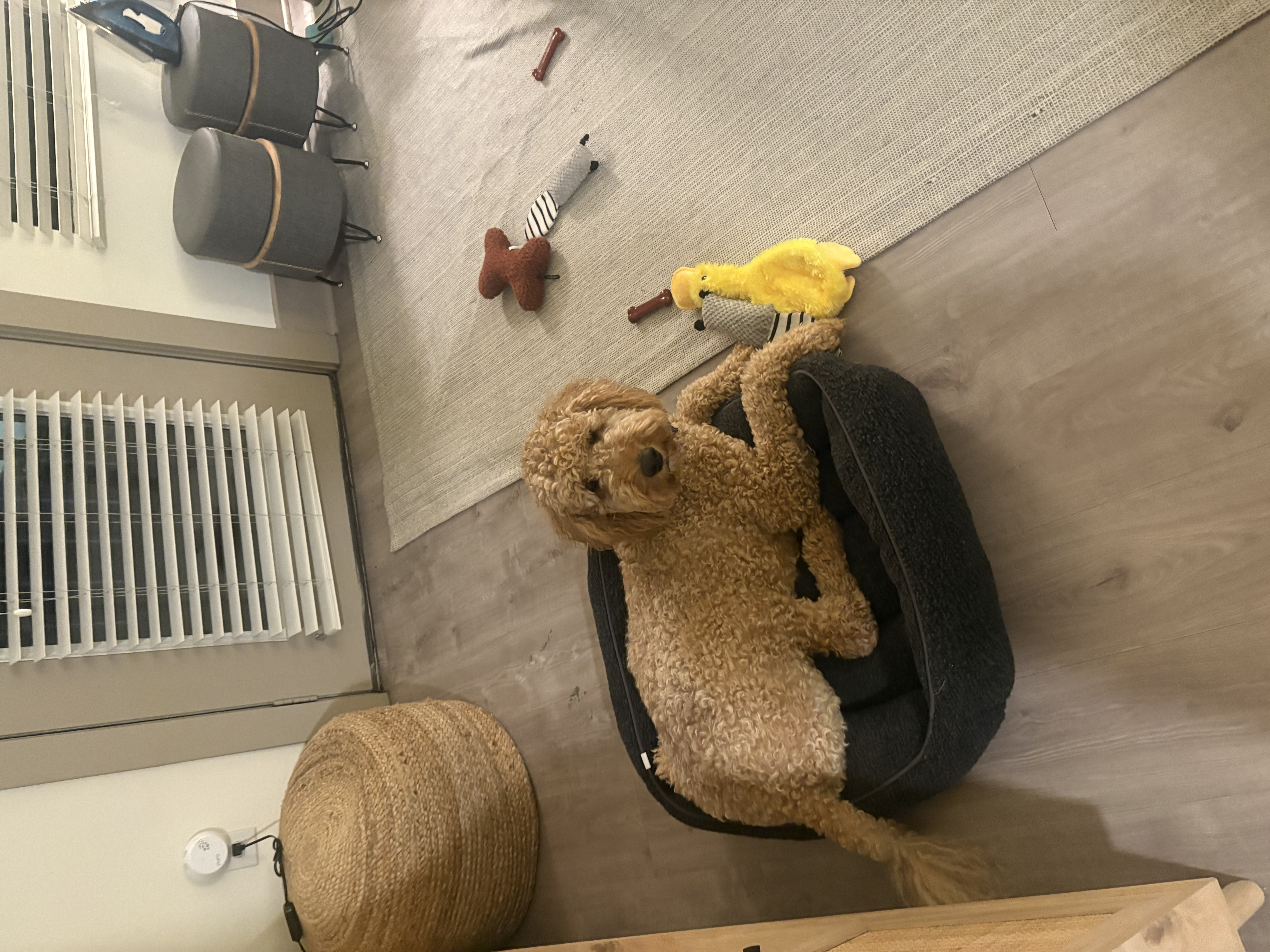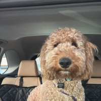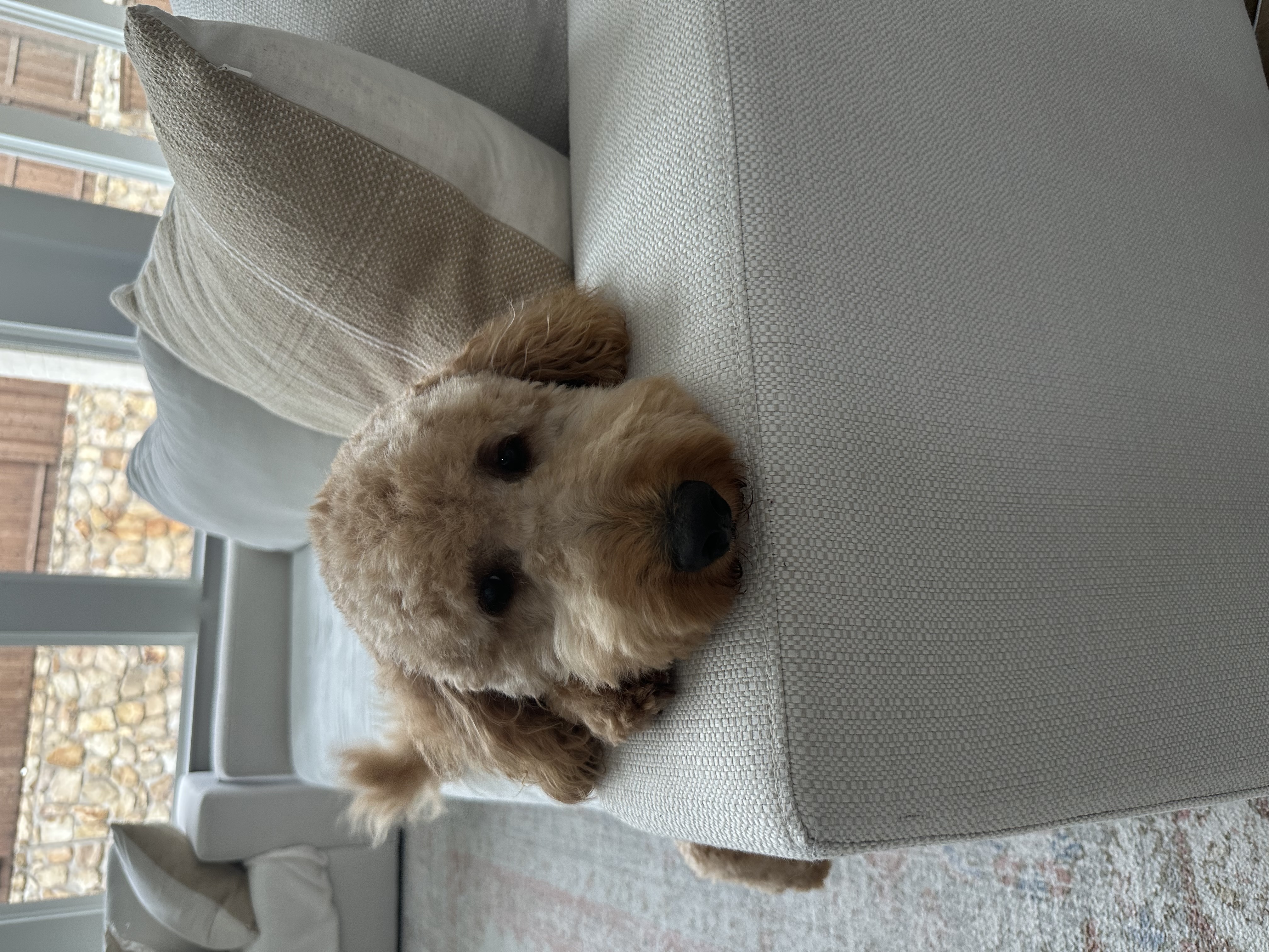 Hi, my name is Jutta! I’m a two-year-old female doodle, and I weigh around 45 pounds. I’ve got a soft, wavy coat and a big, fun personality that makes life way more exciting when I’m around!