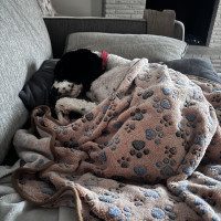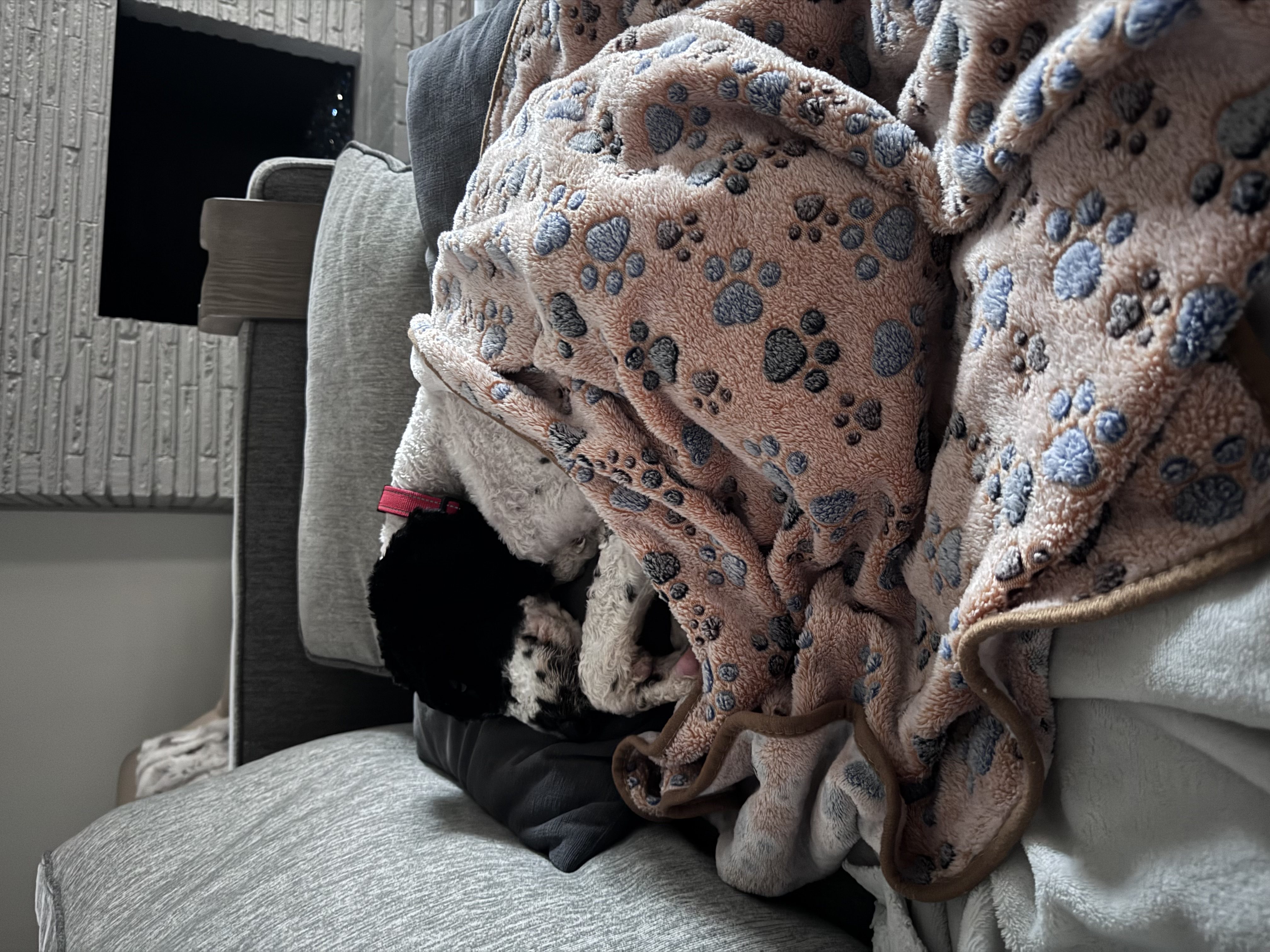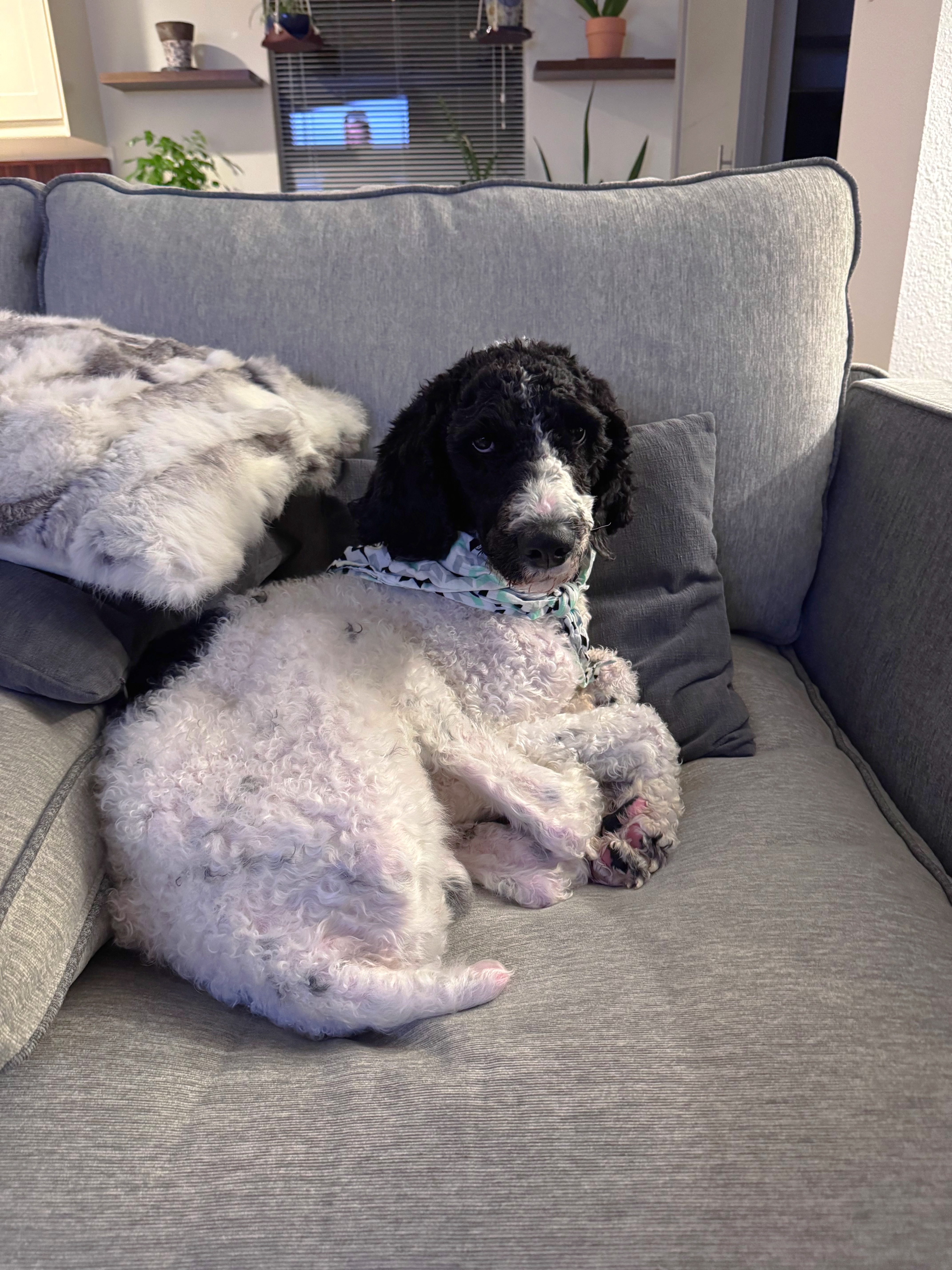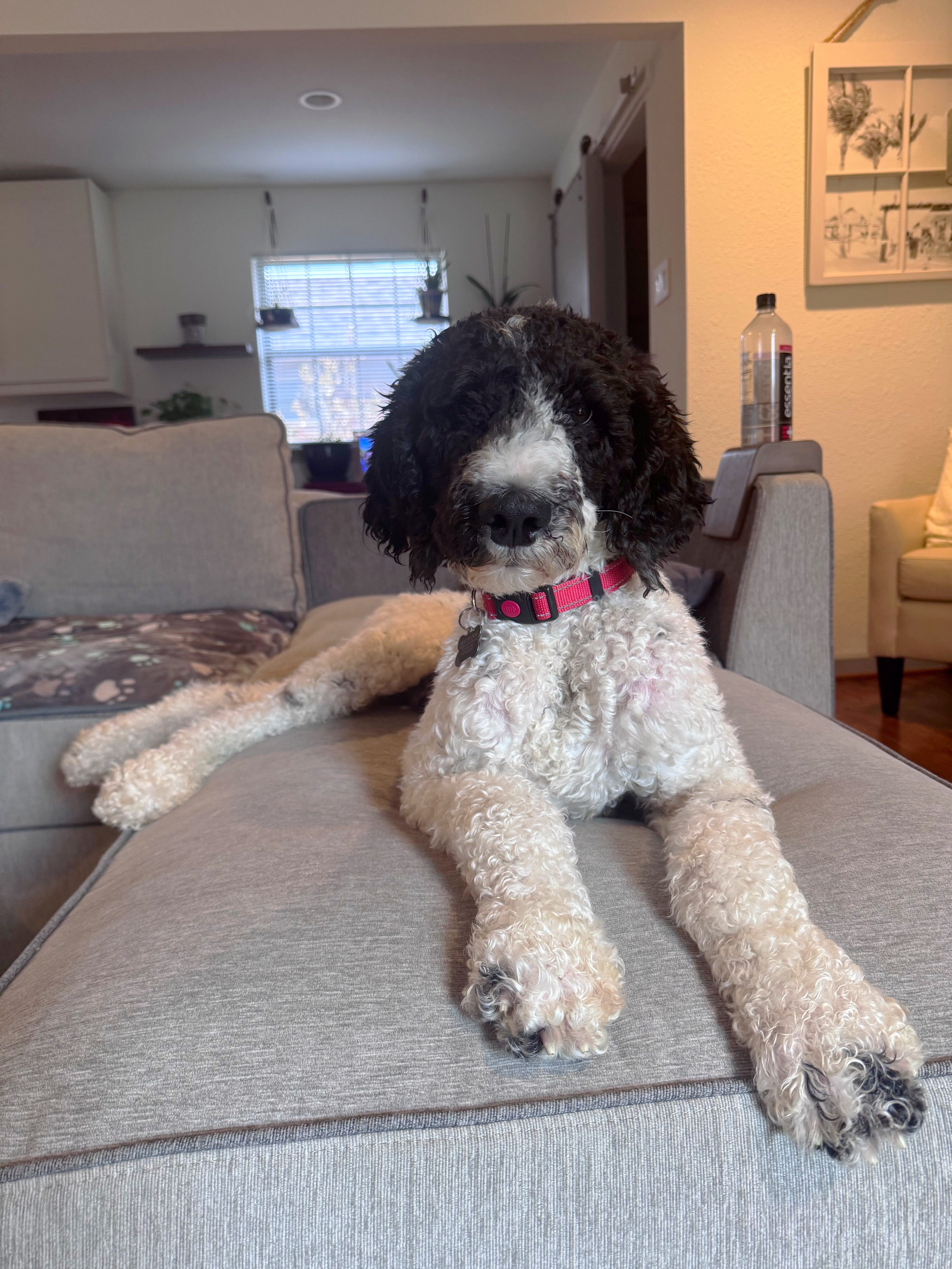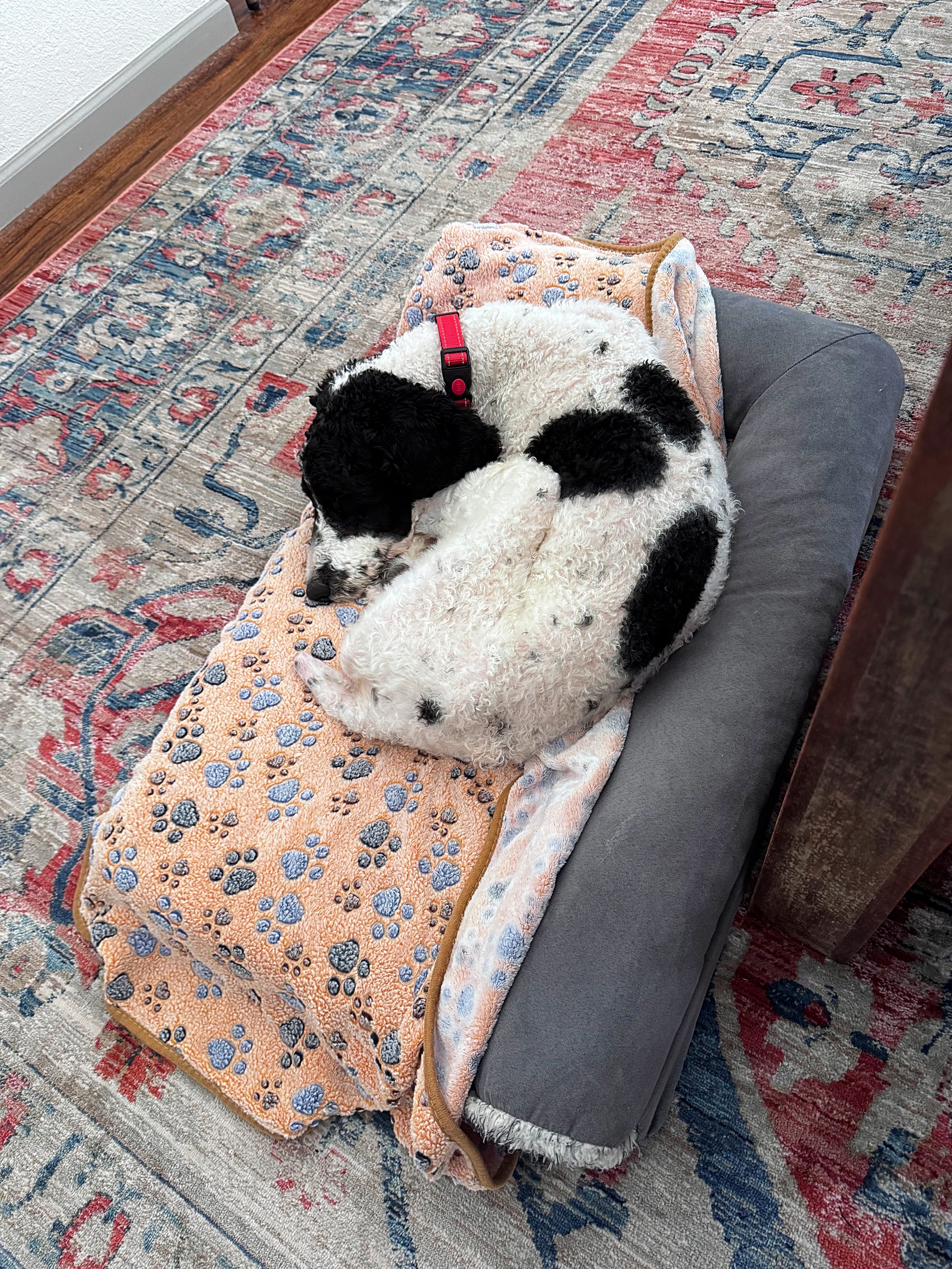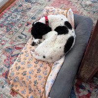 When things slow down, I’m all about the snuggles. I’m a total couch companion and love curling up right next to you. My foster family says I’m pretty entertaining too. I’m all legs and somehow always end up in the funniest sleeping positions. I sleep quietly through the night, get very excited for meals, walk nicely on a harness, and I even enjoy being brushed. I’ll stand perfectly still and soak up the attention while you take care of my curls.